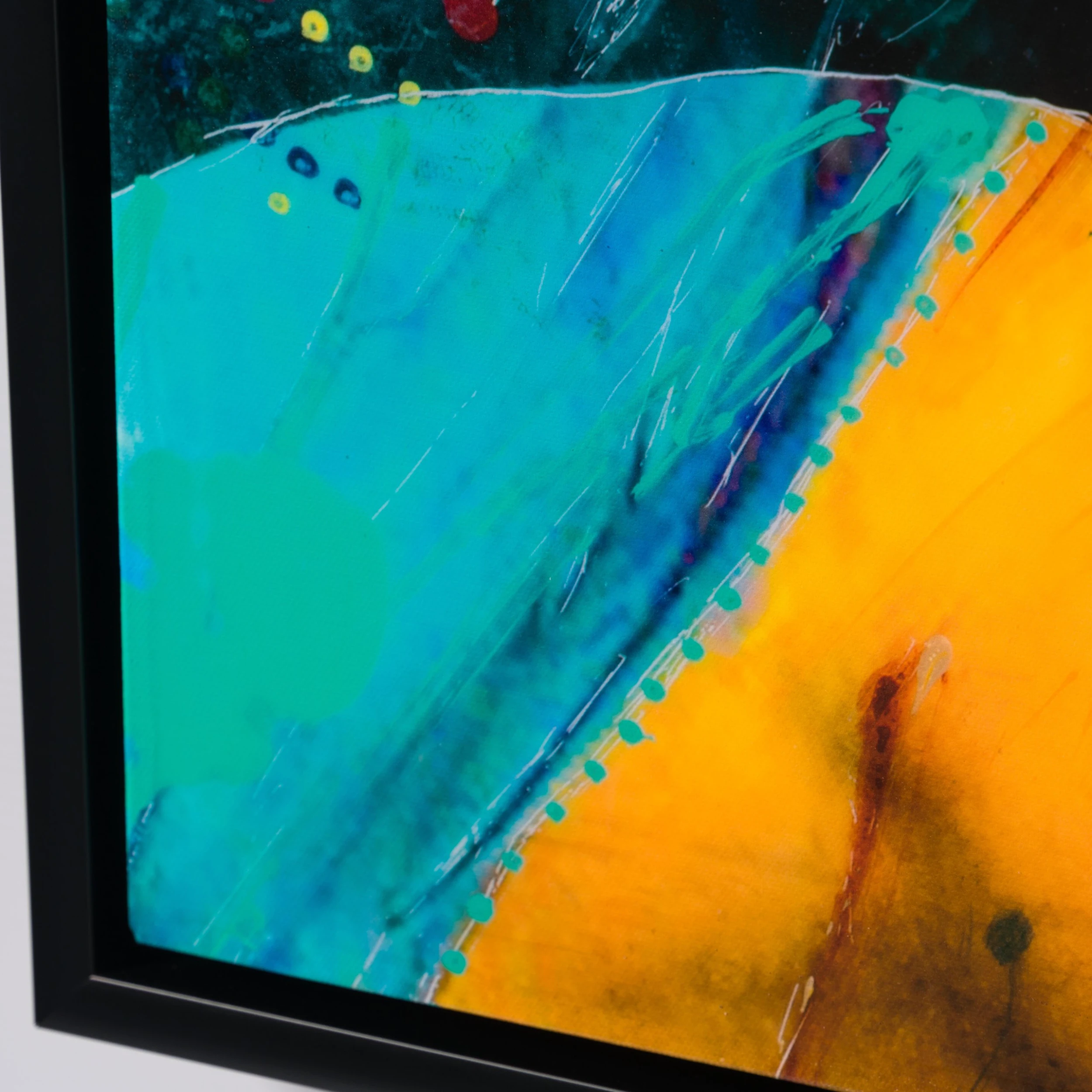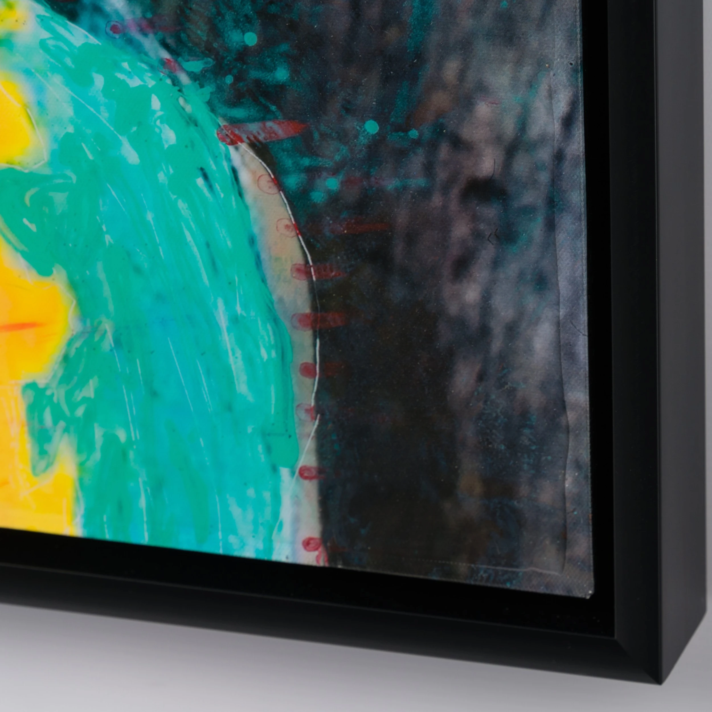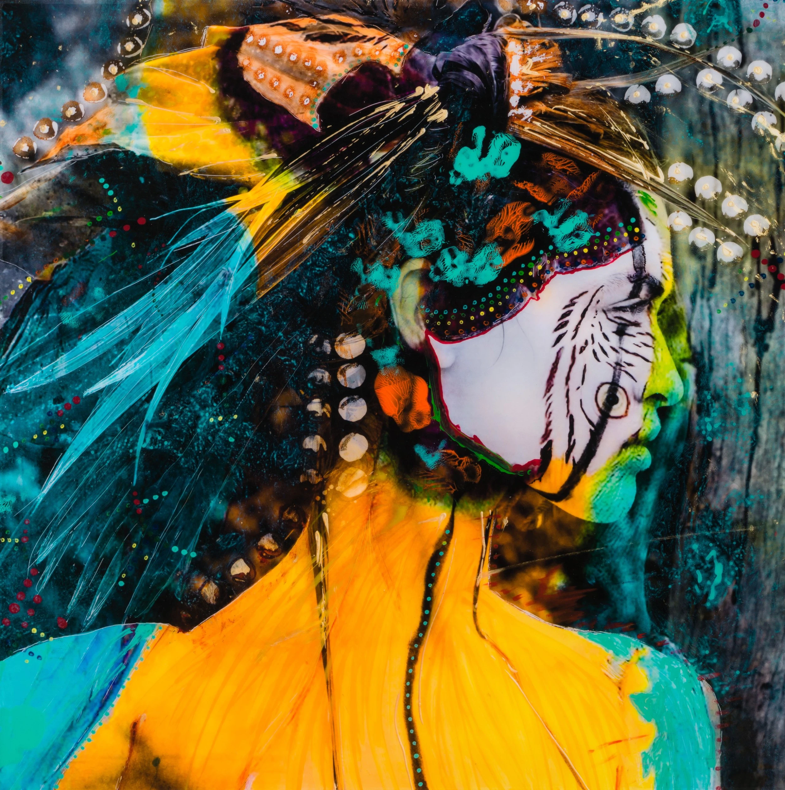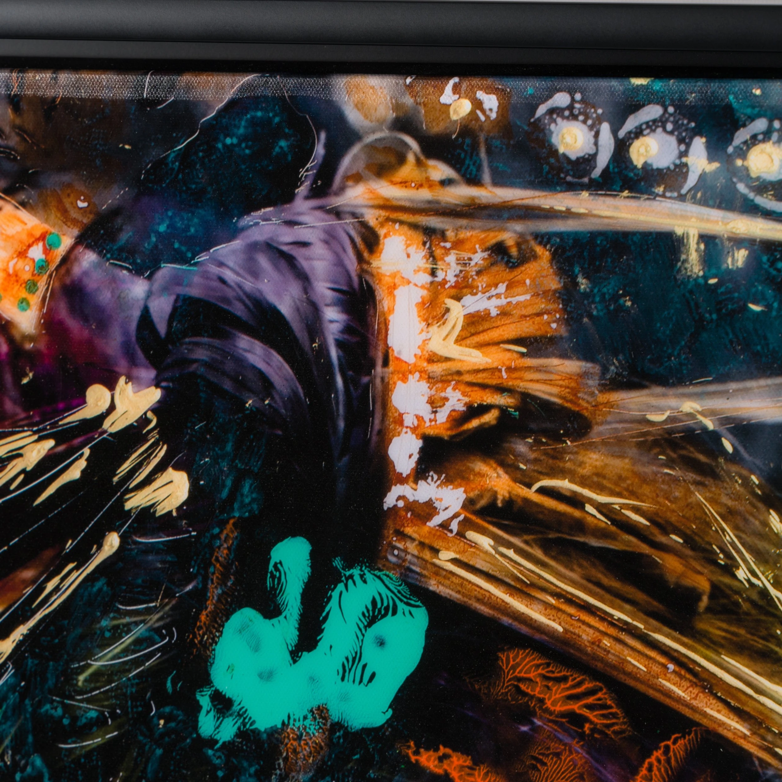 With Moroccan pigments and Vietnamese paints, Mazzucco’s pieces are characterised by the juxtaposition between wildlife and cultural photography, this incredible piece forms part of his introspective collection Grass Roots 2023. “Kigeni” started this new collection. The original bright colours occurred very naturally with the turquoise blues and yellows, which was different from monochromatic feel from previous collections. The Brazilian woman featured in the piece, named Paula, represents the celebration of humanity and life, and how one lives in their environment. The rich bright colours of blue, orange and yellow bring life into the art, representing the vibrant Brazilian culture through layers of photography, paint, and resin. Inspired in the Amazonian culture, this fine art print is full of brightness, life, light and colour with an exotic tribal feel.