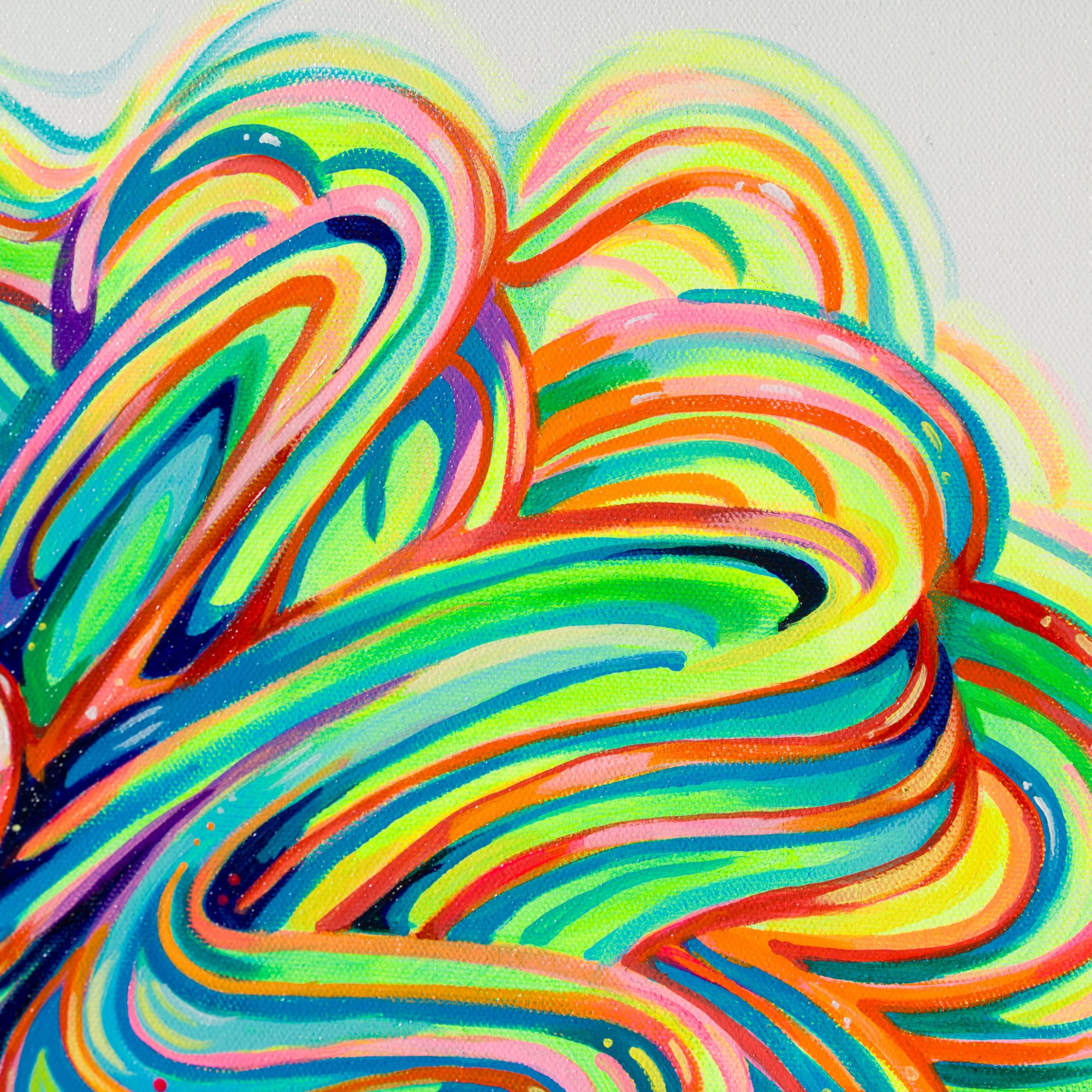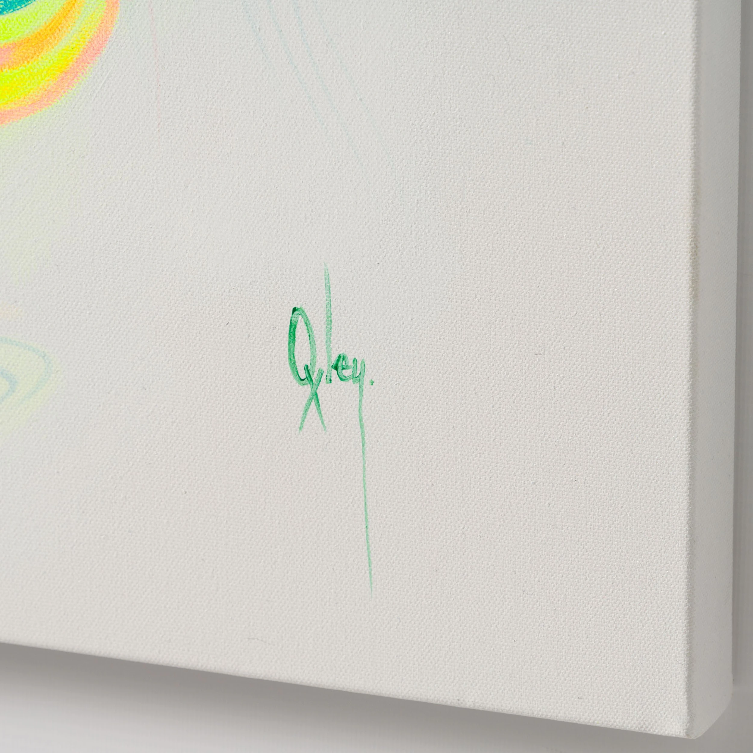 Many of Oxley’s pieces skilfully blend elements of surrealism and expressionism, infusing each piece with energy and emotion. His expressive brushwork is energetic and fluid, giving his paintings a sense of movement and spontaneity as his captivating portraits feature wild animals created through intense patterns and psychedelic colour. The traditional colours of the animal are overthrown by exciting vibrant shades, transforming it into an “ethereal, astral” being through his kaleidoscopic use of colour and form. The strong rainbow shades contrast beautifully with the white background.