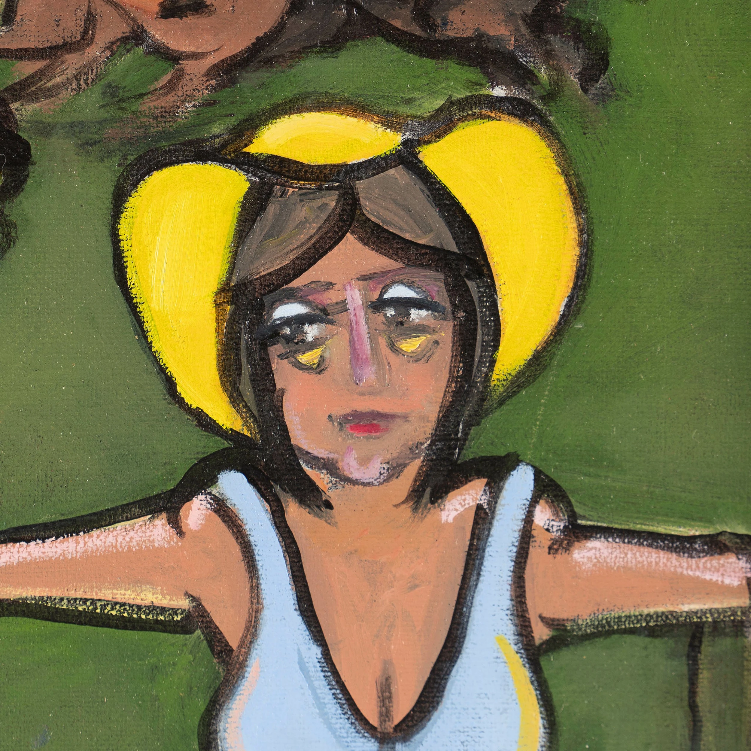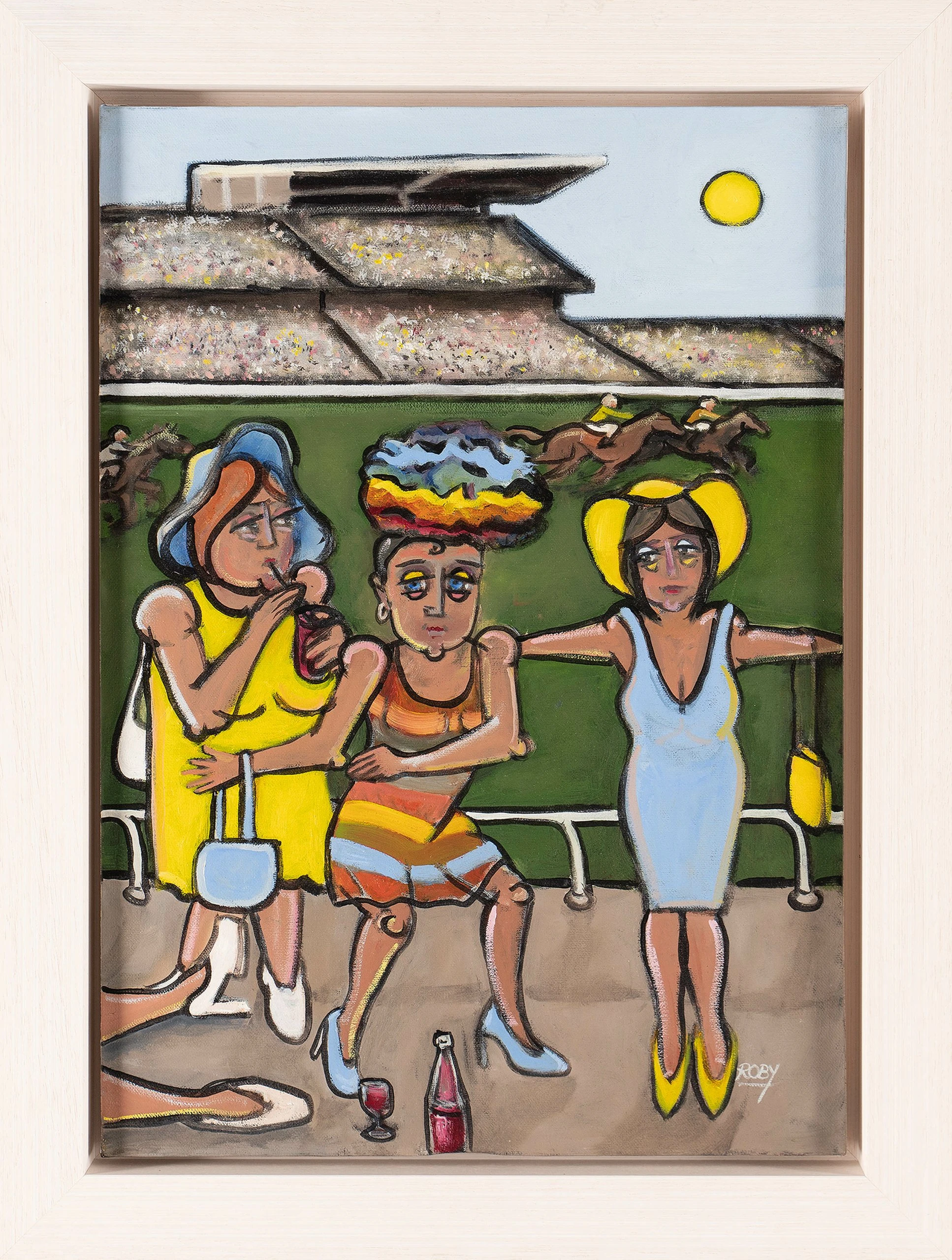 From the heart-warming to the hilarious, Stephen Roby uses his bright artistic style to interpret a range of scenes from his memory and imagination. This particular piece was inspired by “major horse racing events that [he] had seen on the TV and the newspapers. The girl’s legs and feet on the lower left corner sum up the effects of the day’s alcohol intake. It’s not just about the hats.”