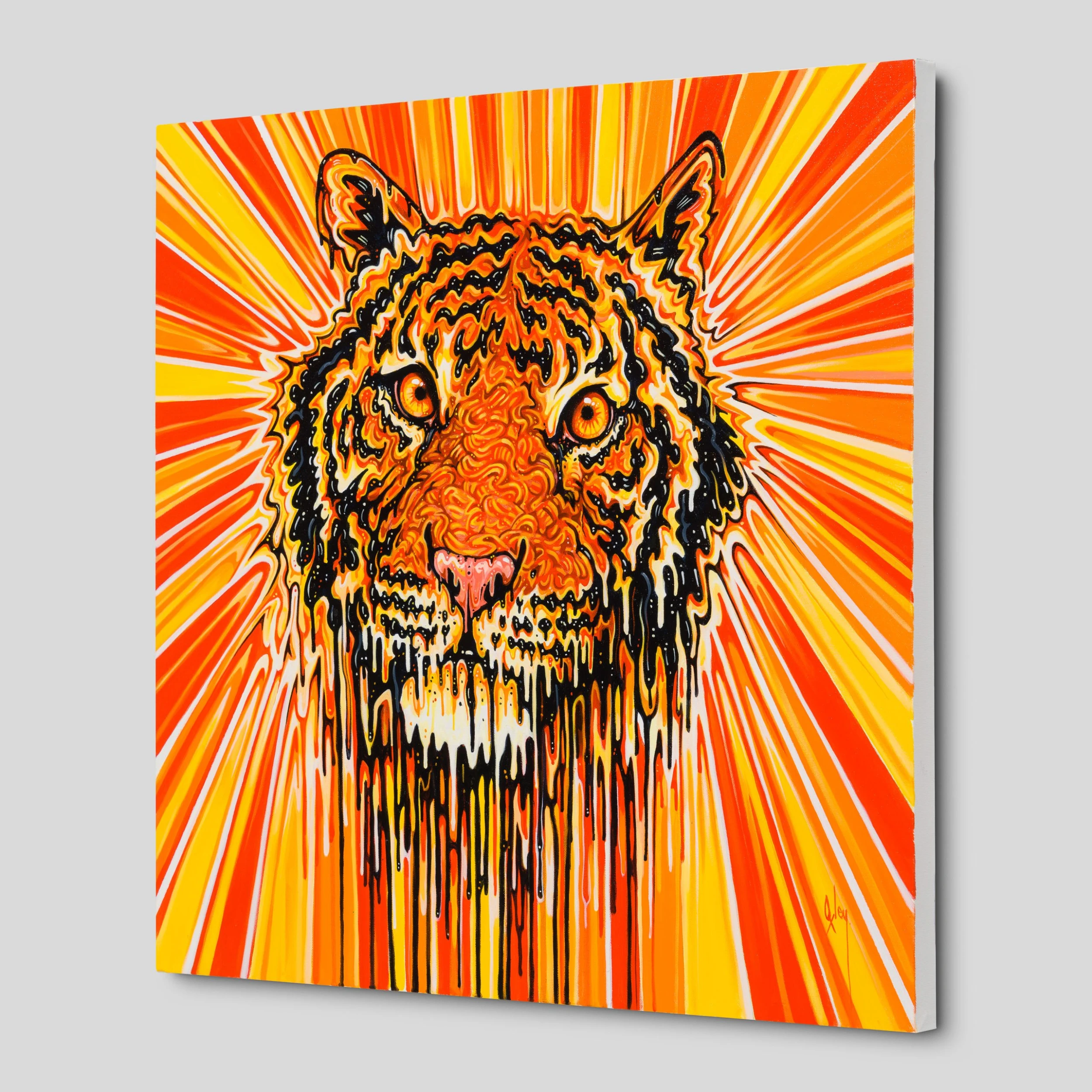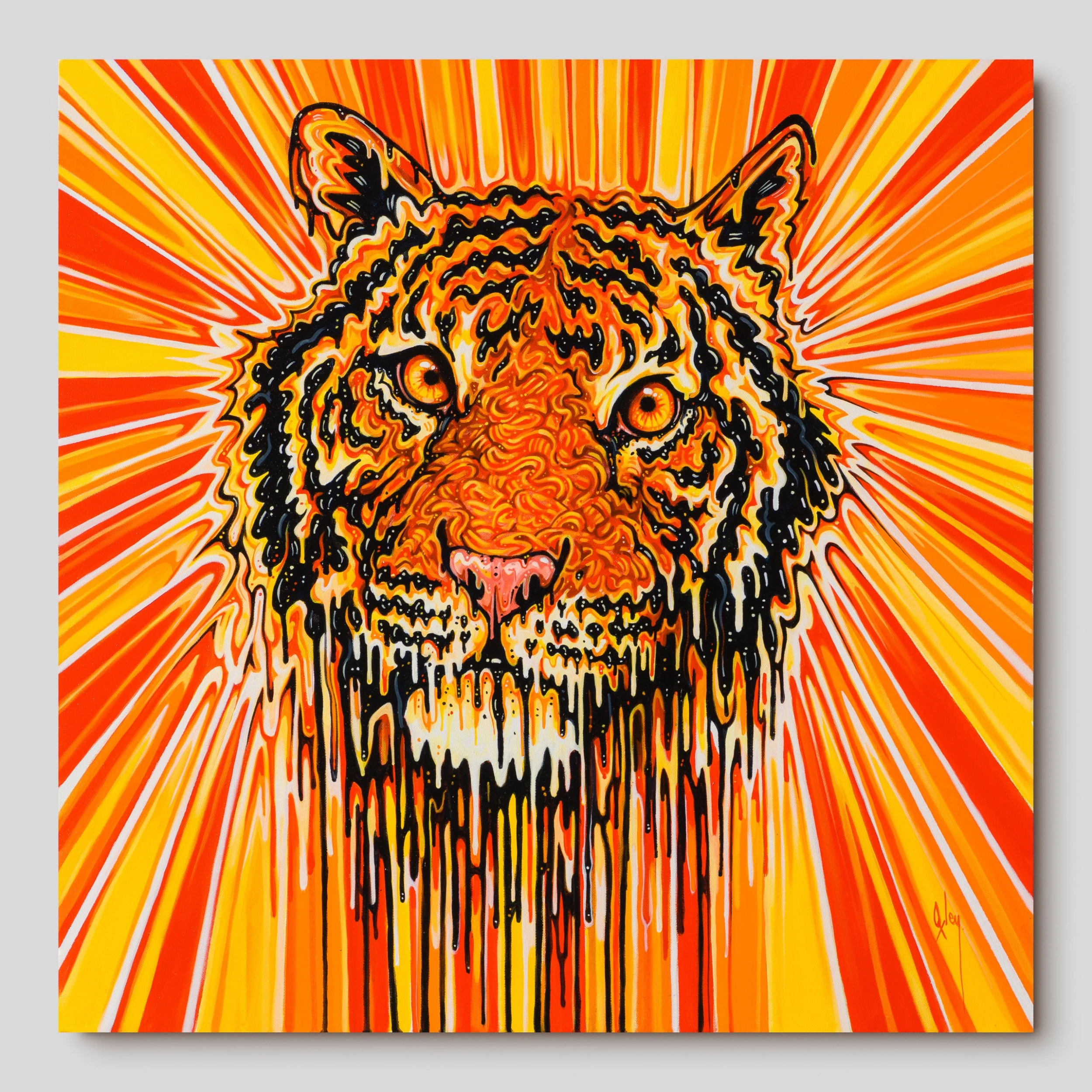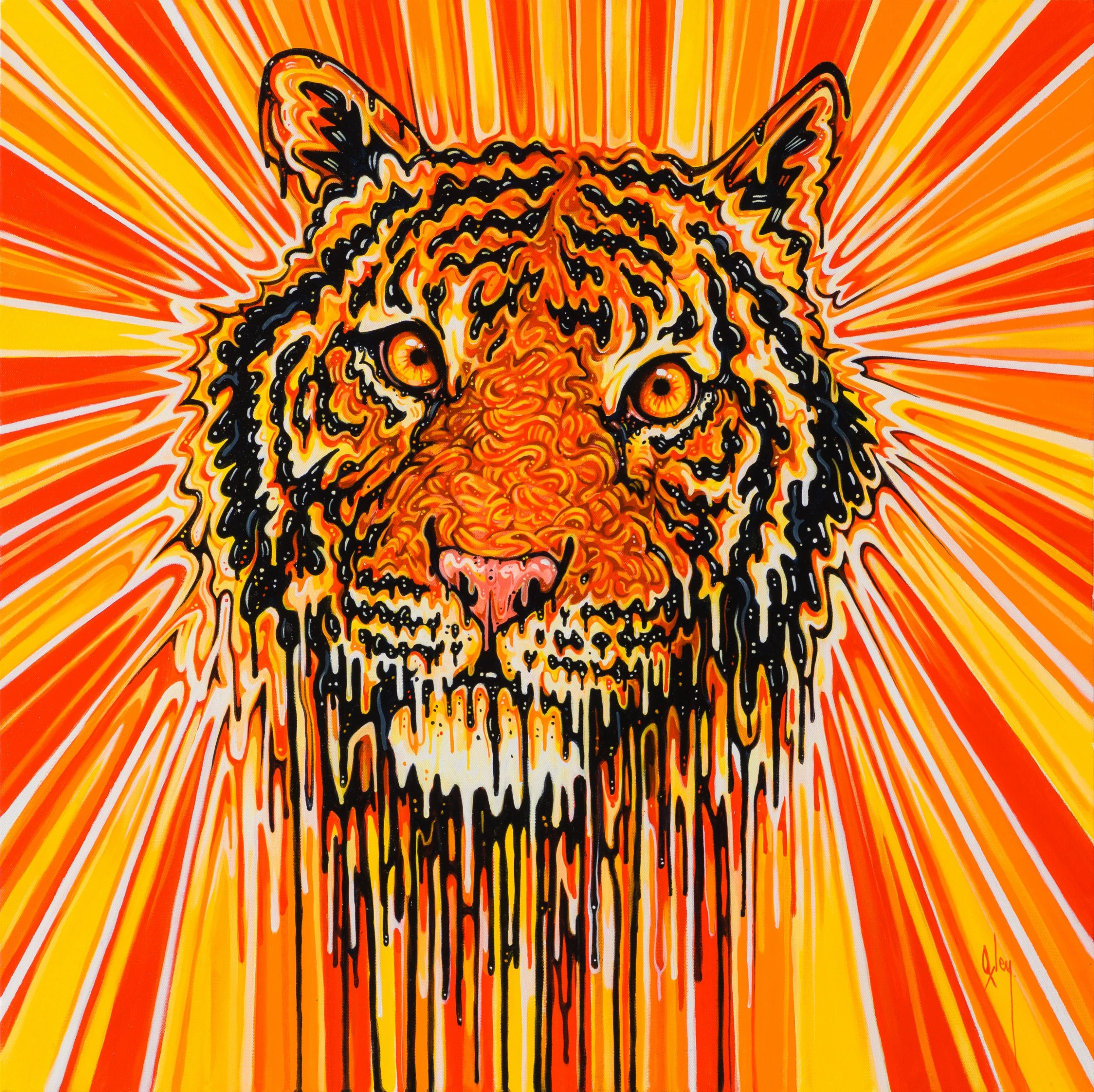 Many of Oxley’s pieces skilfully blend elements of surrealism and expressionism, infusing each piece with energy and emotion. His expressive brushwork is energetic and fluid, giving his paintings a sense of movement and spontaneity as his captivating portraits feature wild animals created through intense patterns and psychedelic colour. The traditional colours of the animal are overthrown by exciting vibrant shades, transforming it into an “ethereal, astral” being through his kaleidoscopic use of colour and form. The strong rainbow shades contrast beautifully with the white background.