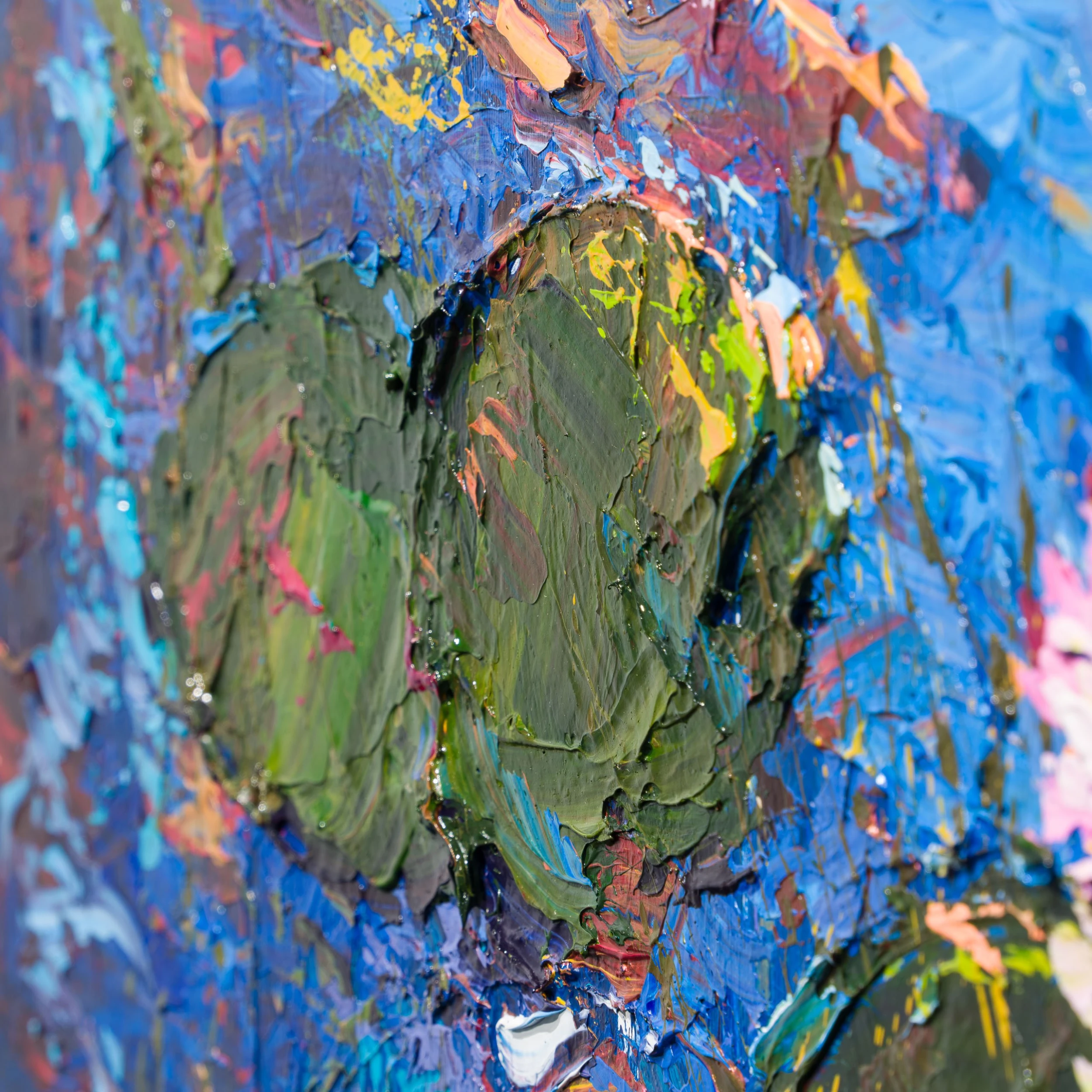 In “Lily Pond Luminosity”, Kenton captures the gentle movement and the depth of the pond water in beautiful soft hues. With the sunlight dancing on the pond’s surface, the artwork evokes a strong feeling of serenity and calm. Built up with layers of paint, the original has a highly textured surface. The piece’s ability to make a statement is unmatched, allowing collectors to have a hypnotising escape in their house.