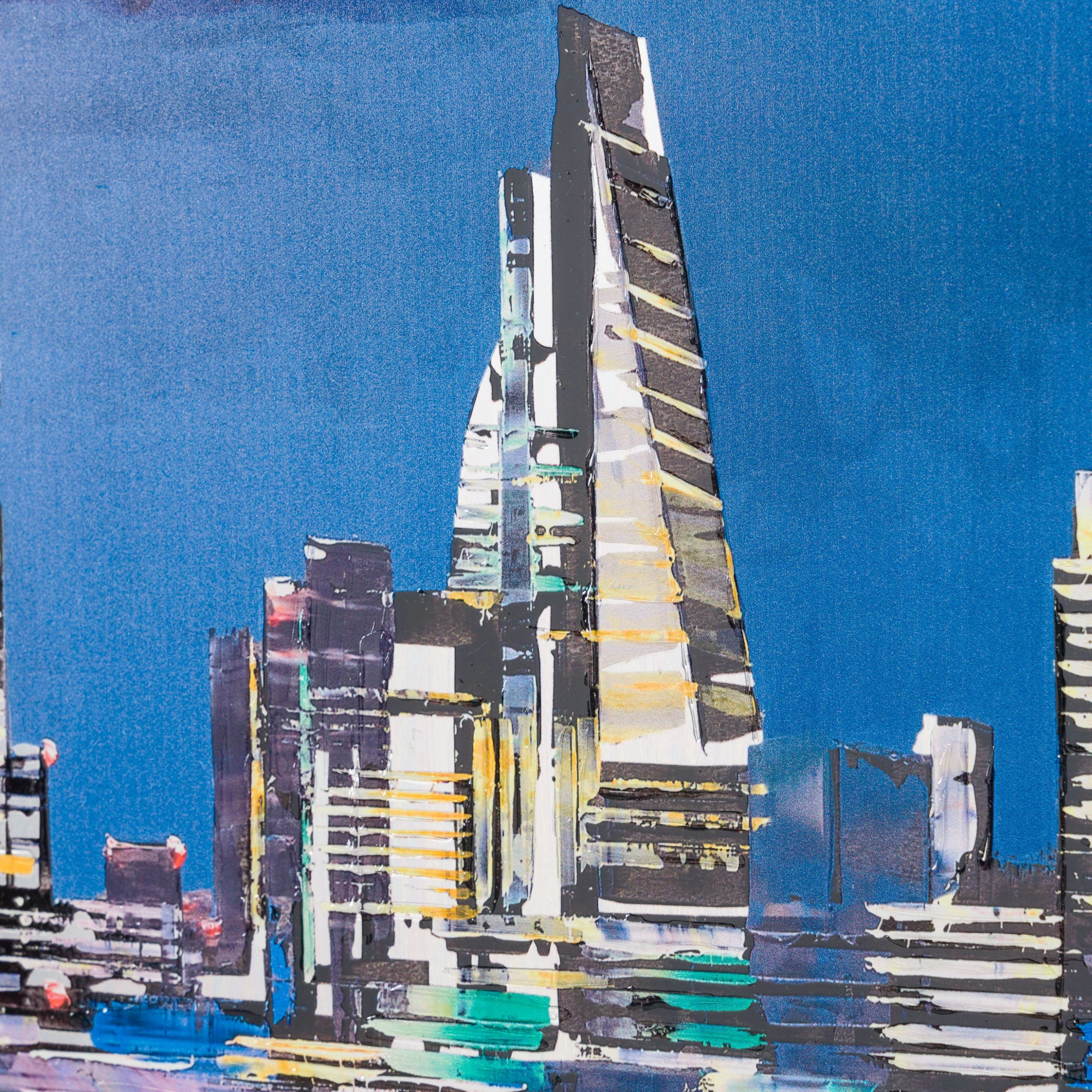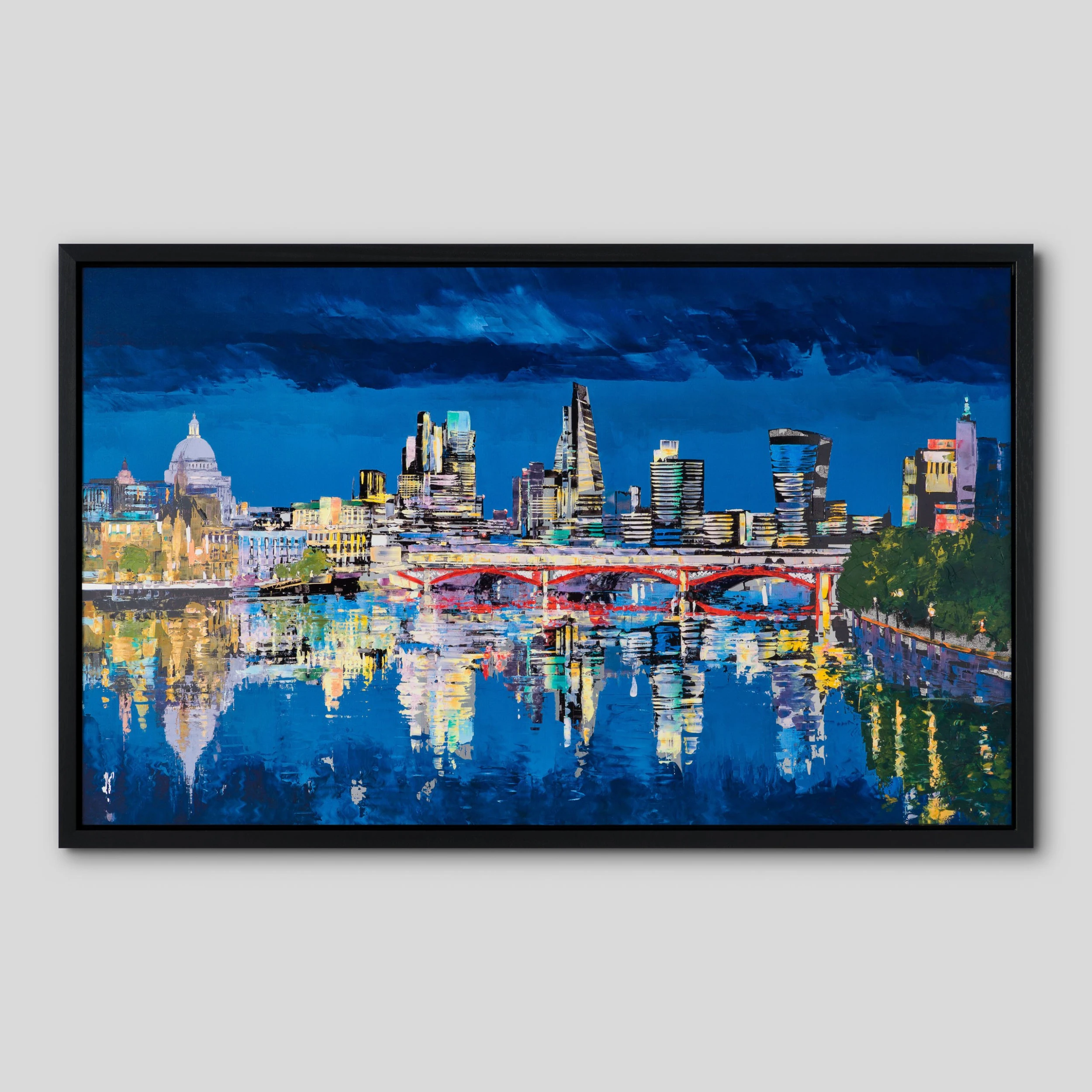 The shimmering lights reflect on the still surface of the Thames, portraying a rare moment of calm in this lively capital. In this painting, there are iconic buildings in view such as St Paul’s Cathedral, the Leadenhall Building and 20 Fenchurch Street.