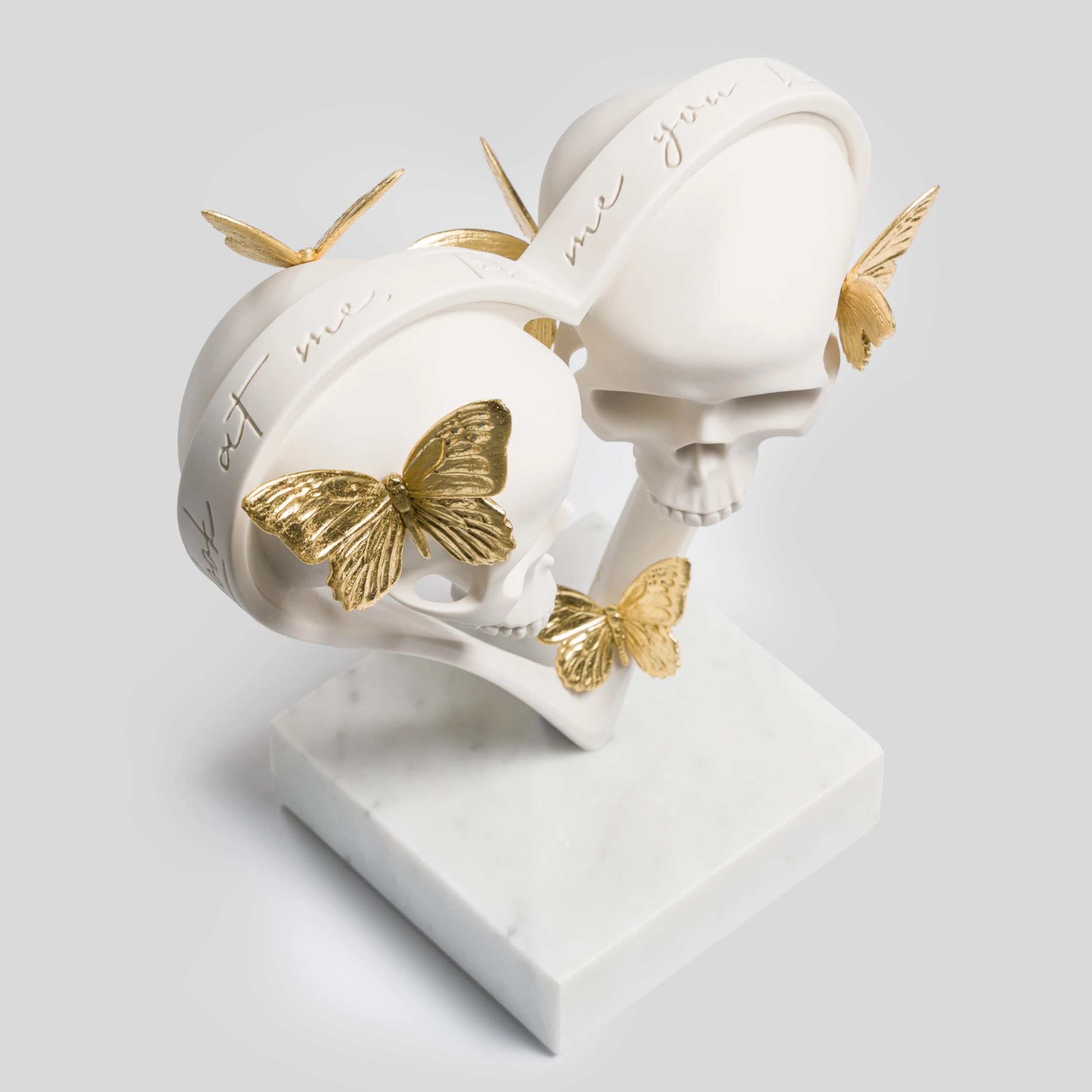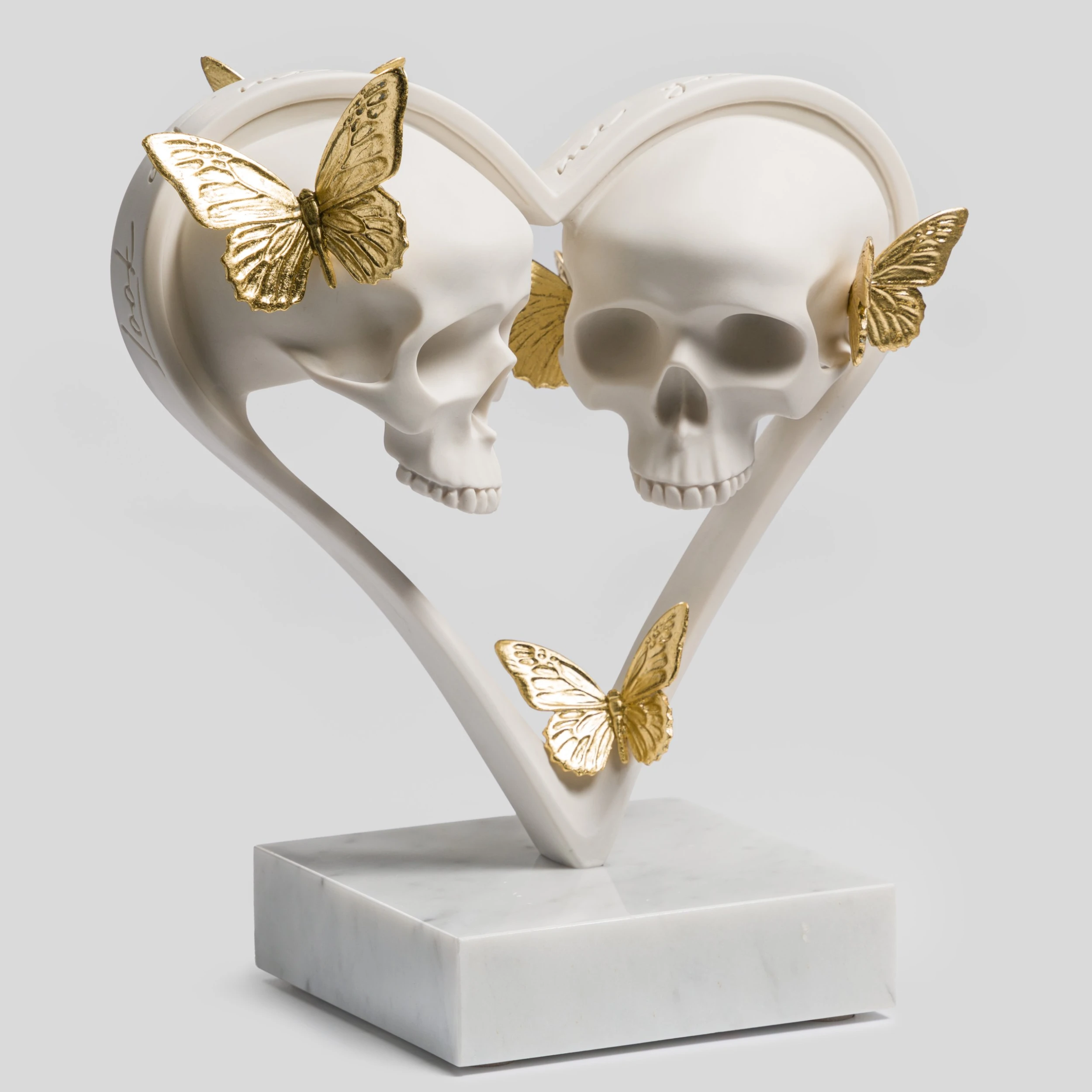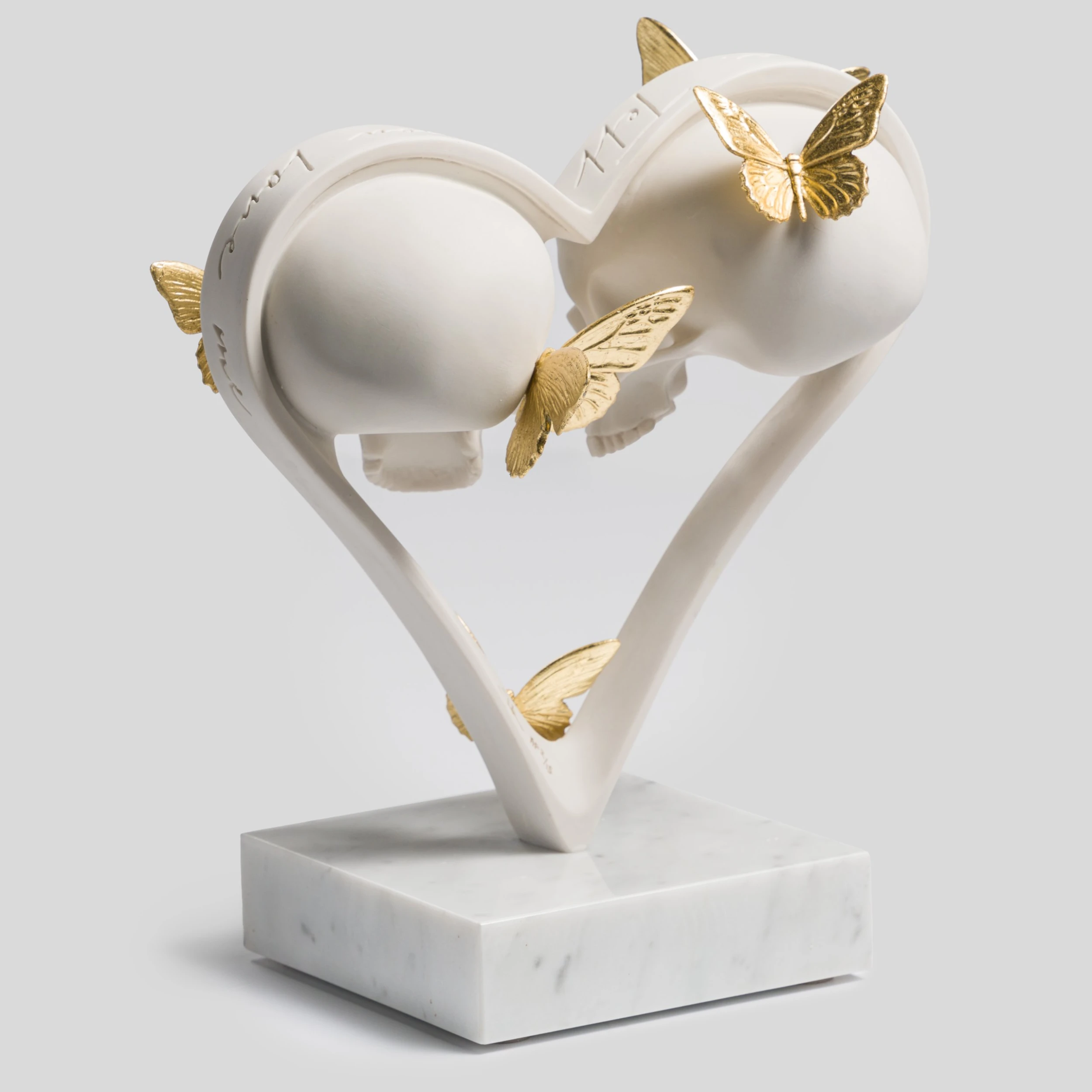 This delicate and meticulous sculpture is for those who celebrate love in all its shades. ‘Look at Me, Tell Me You Love Me’ features a pair of skulls in the centre of a heart, surrounded by golden butterflies, all atop a marble base. The title of the sculpture is carved on top of the heart, echoing Dan’s desire to make his pieces exciting to view from all angles.
