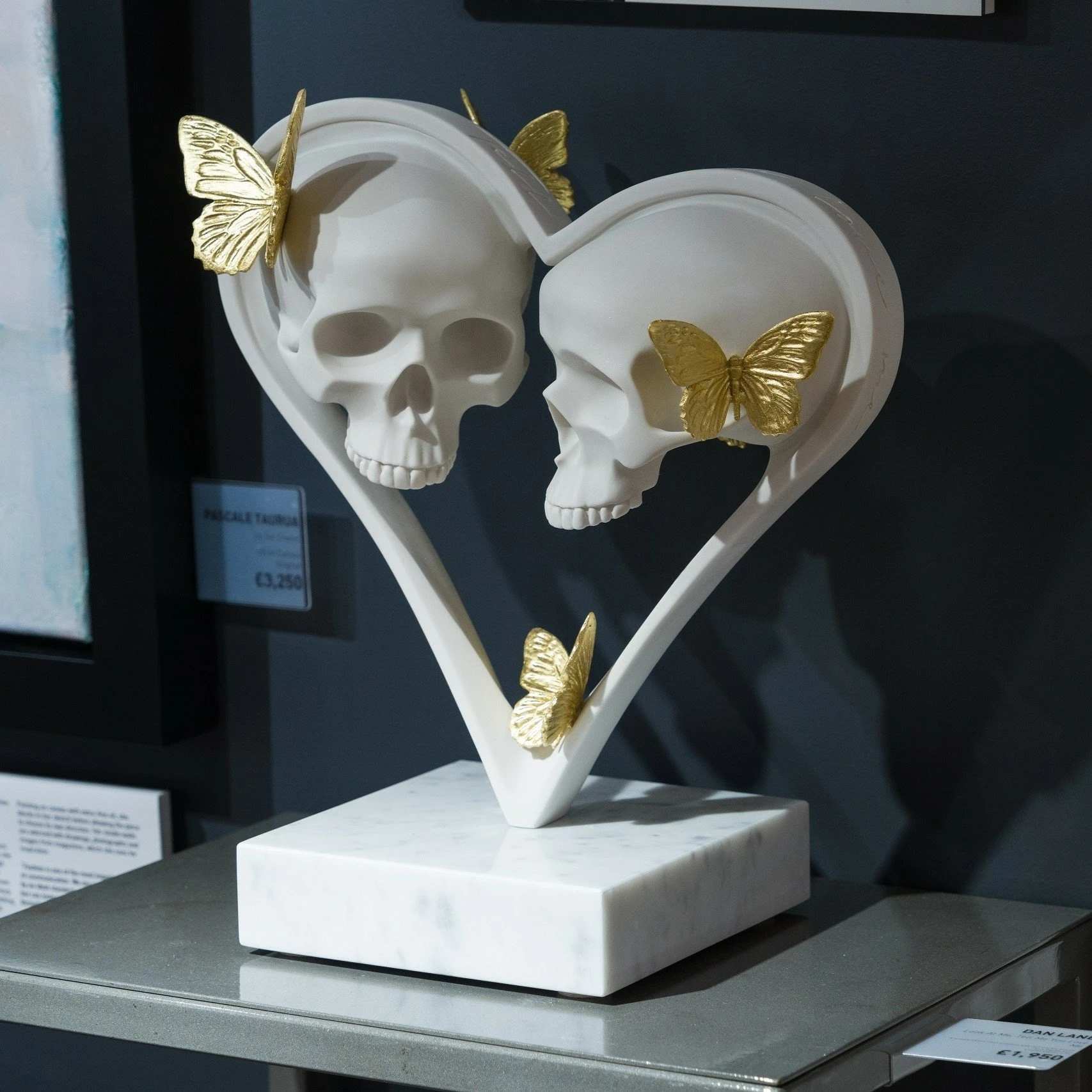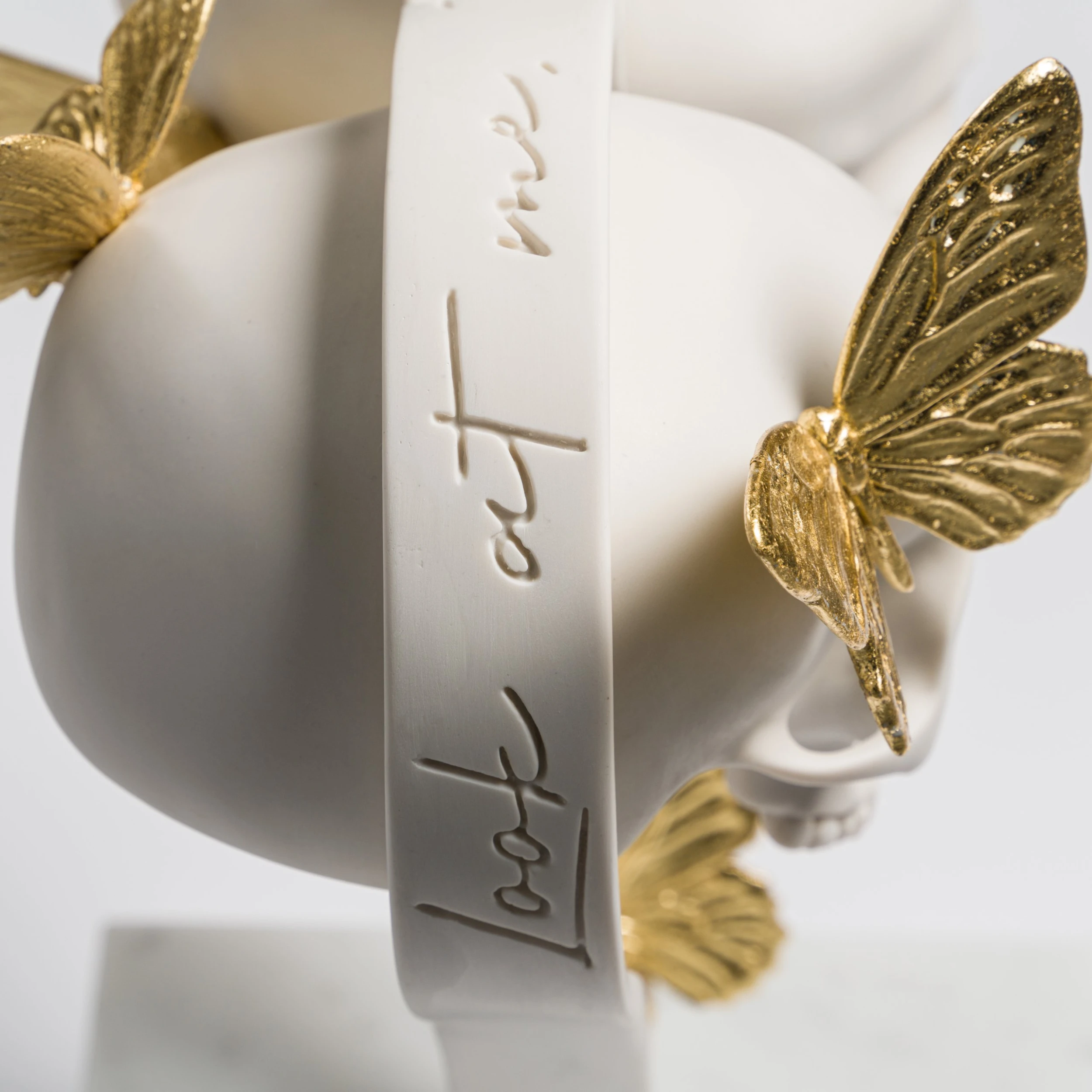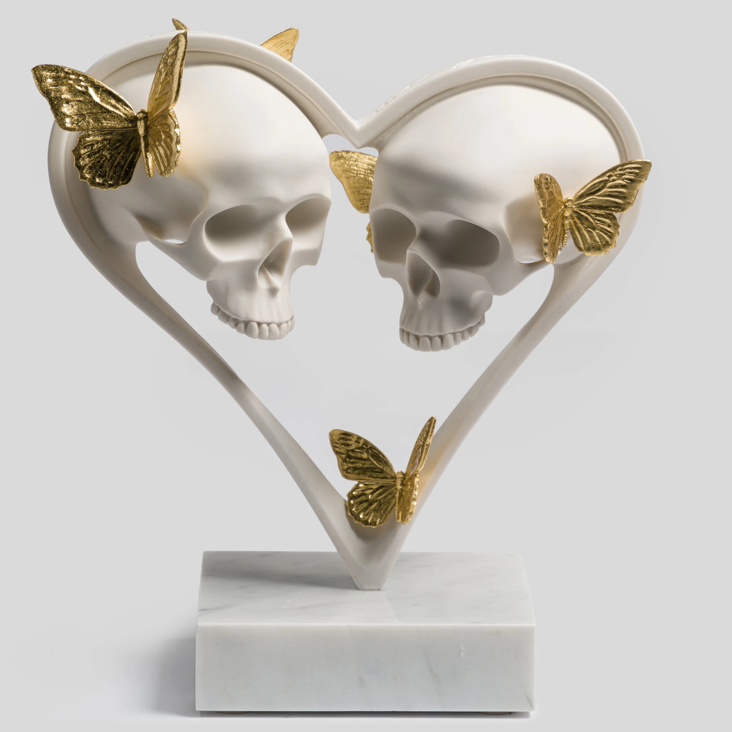 This delicate and meticulous sculpture is for those who celebrate love in all its shades. ‘Look at Me, Tell Me You Love Me’ features a pair of skulls in the centre of a heart, surrounded by golden butterflies, all atop a marble base. The title of the sculpture is carved on top of the heart, echoing Dan’s desire to make his pieces exciting to view from all angles.