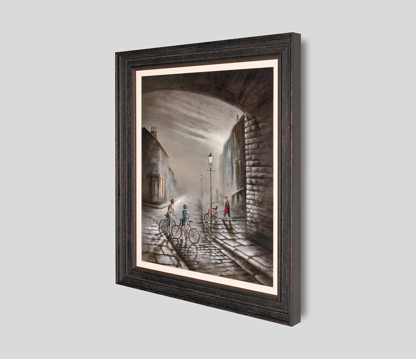 This dark and atmospheric artwork by Bob Barker explores a light and humorous theme. Across the cobbled street, two boys admire a girl with a chopper bike. Is it love at first sight of her or her iconic bike? Either way, the sweet and light-hearted piece epitomises Bob’s beautiful portrayal of industrial settings and artworks with double meanings.