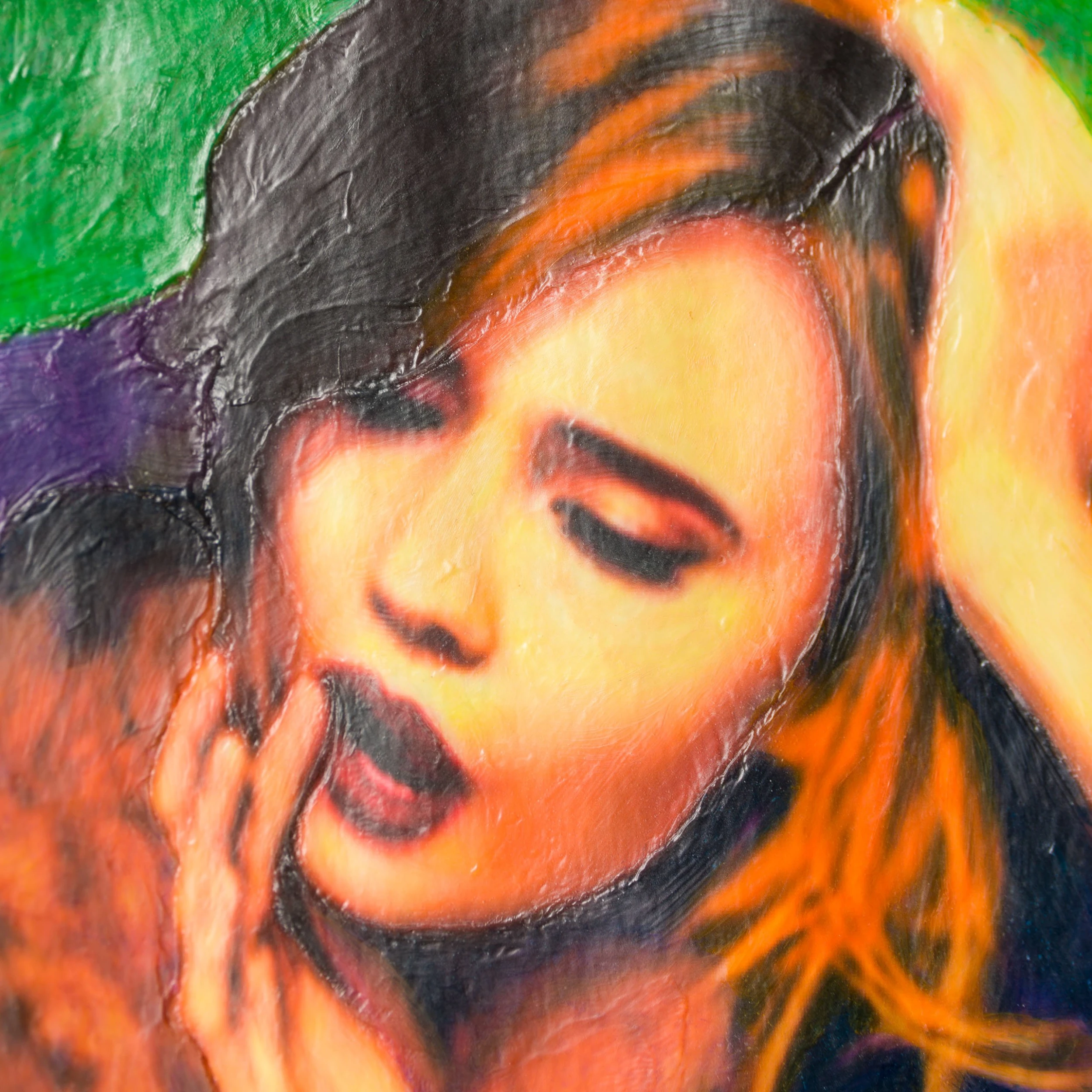 Utilising the colourist style of overlaying montage imagery, in “Loved By Illusion”, Gill combines pop art with an old-school Hollywood feel. The dark shade of purple blue, the green and the orange create a visual interesting piece. This piece is a bolder coloured, more angular study in a collage, montage image style. Structurally placed together, the car colour is accentuated by the model’s orange hair and coat creating a beautiful game of contrasting bold colours. This iconic original is a statement piece in every collection!