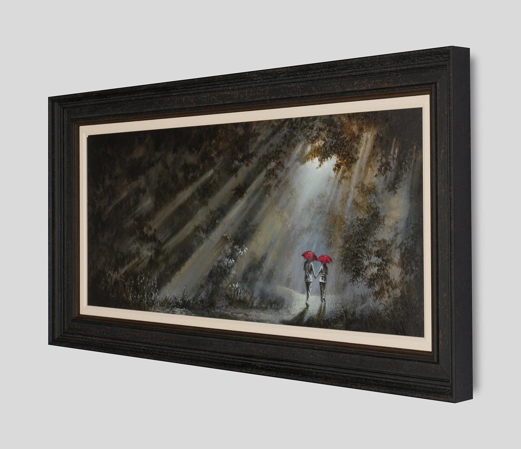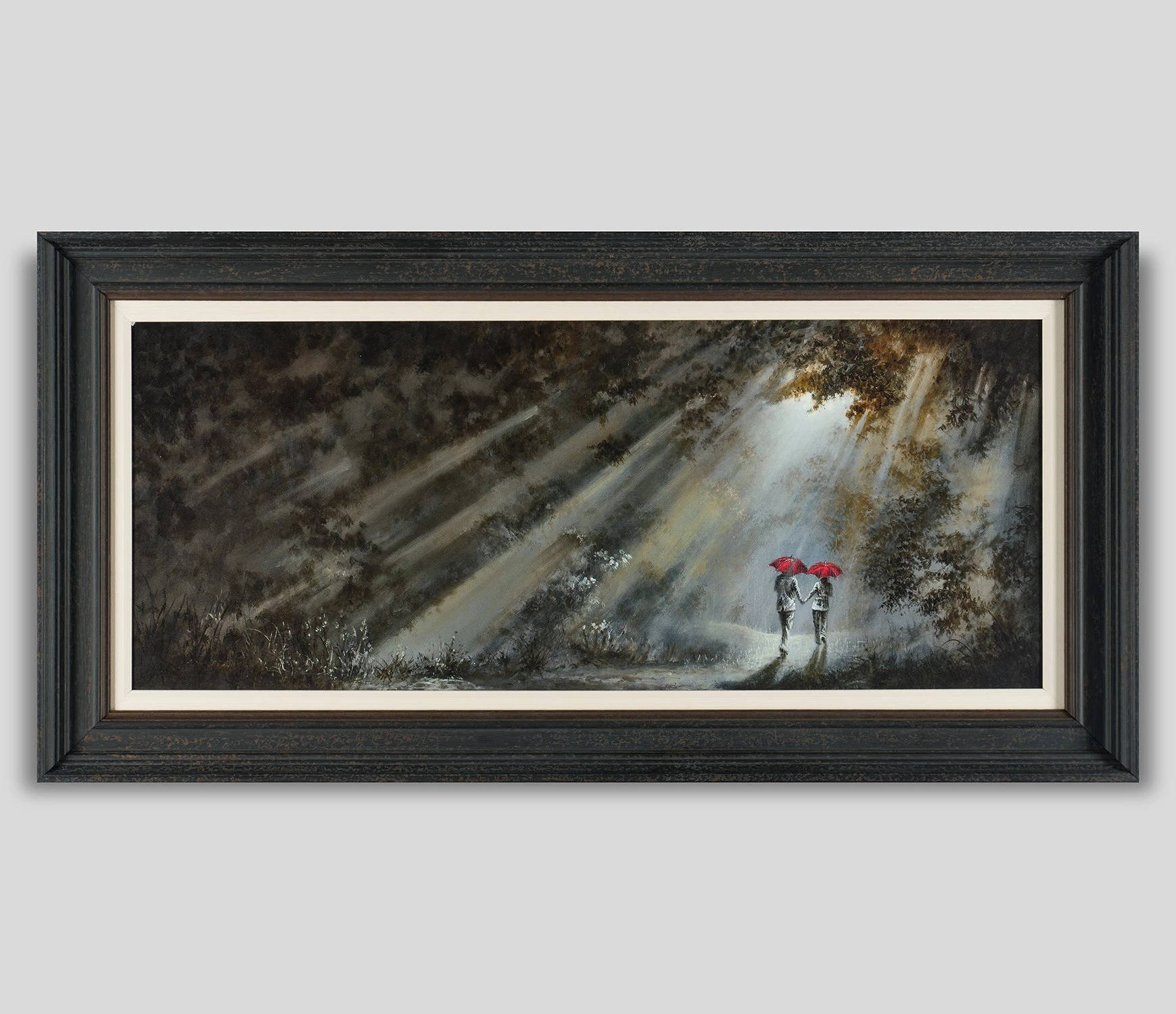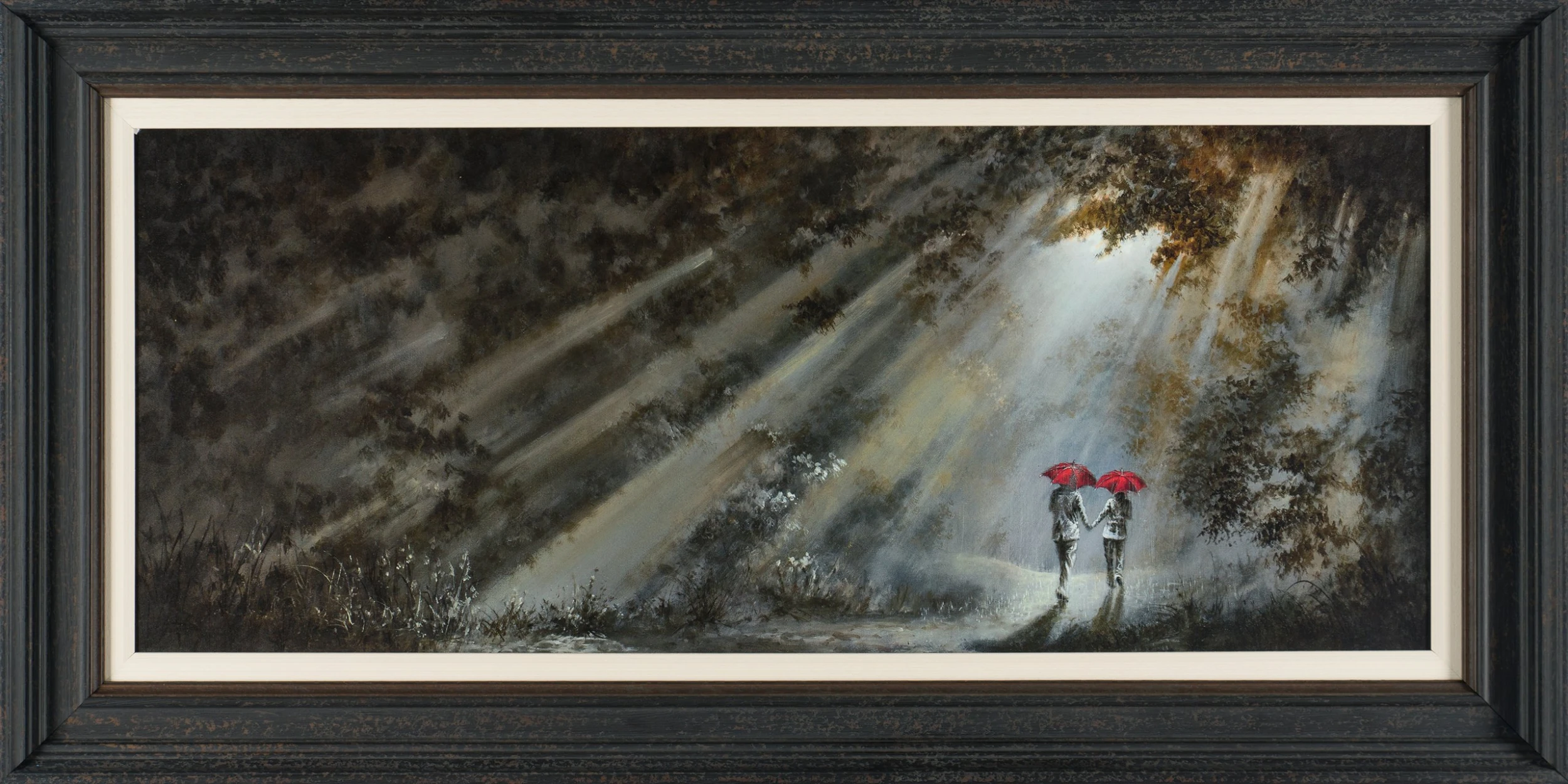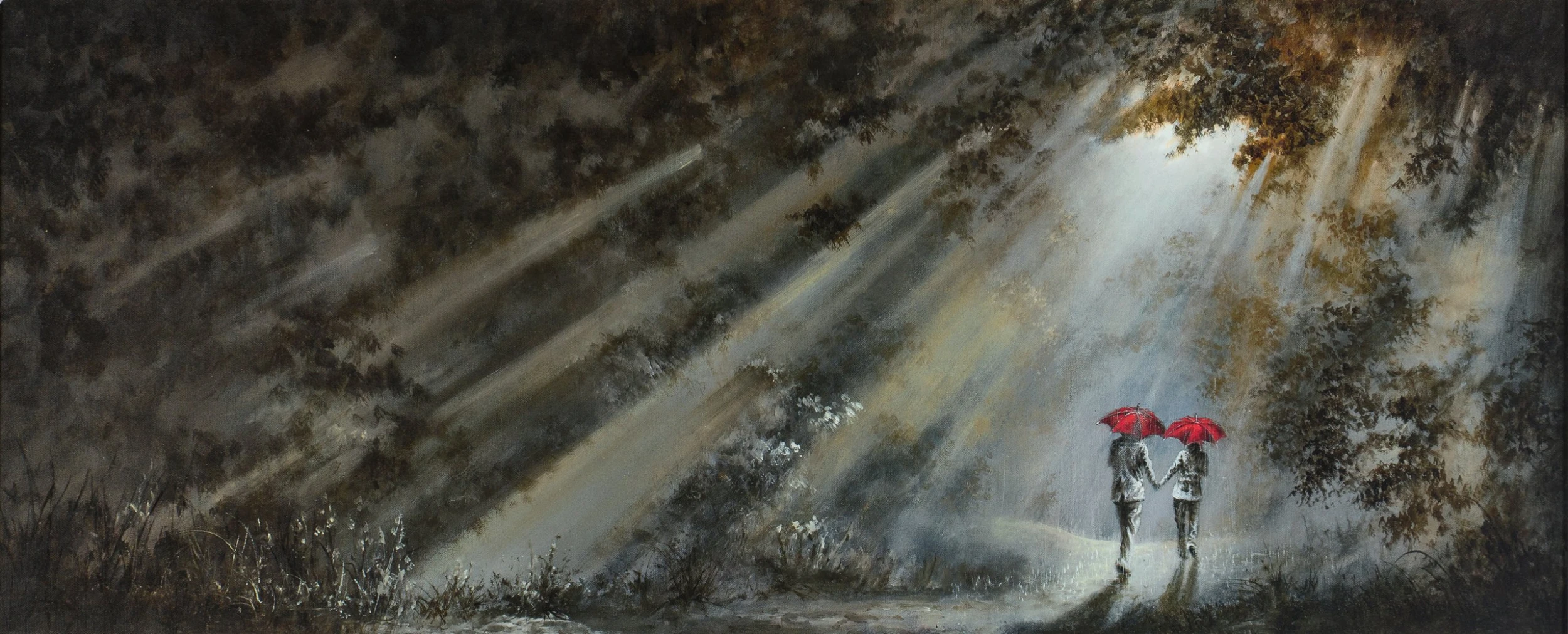 Beaming streaks of light burst through trees in this peaceful artwork by Bob Barker. His signature umbrella couple walk hand-in-hand through a dense forest, adding a spark of colour to otherwise chilly shades evocative of early Autumn/Winter evenings. You can almost feel the crunch of leaves underfoot, the sharp bite of chilly air on your nose and the warm reassurance of holding hands.