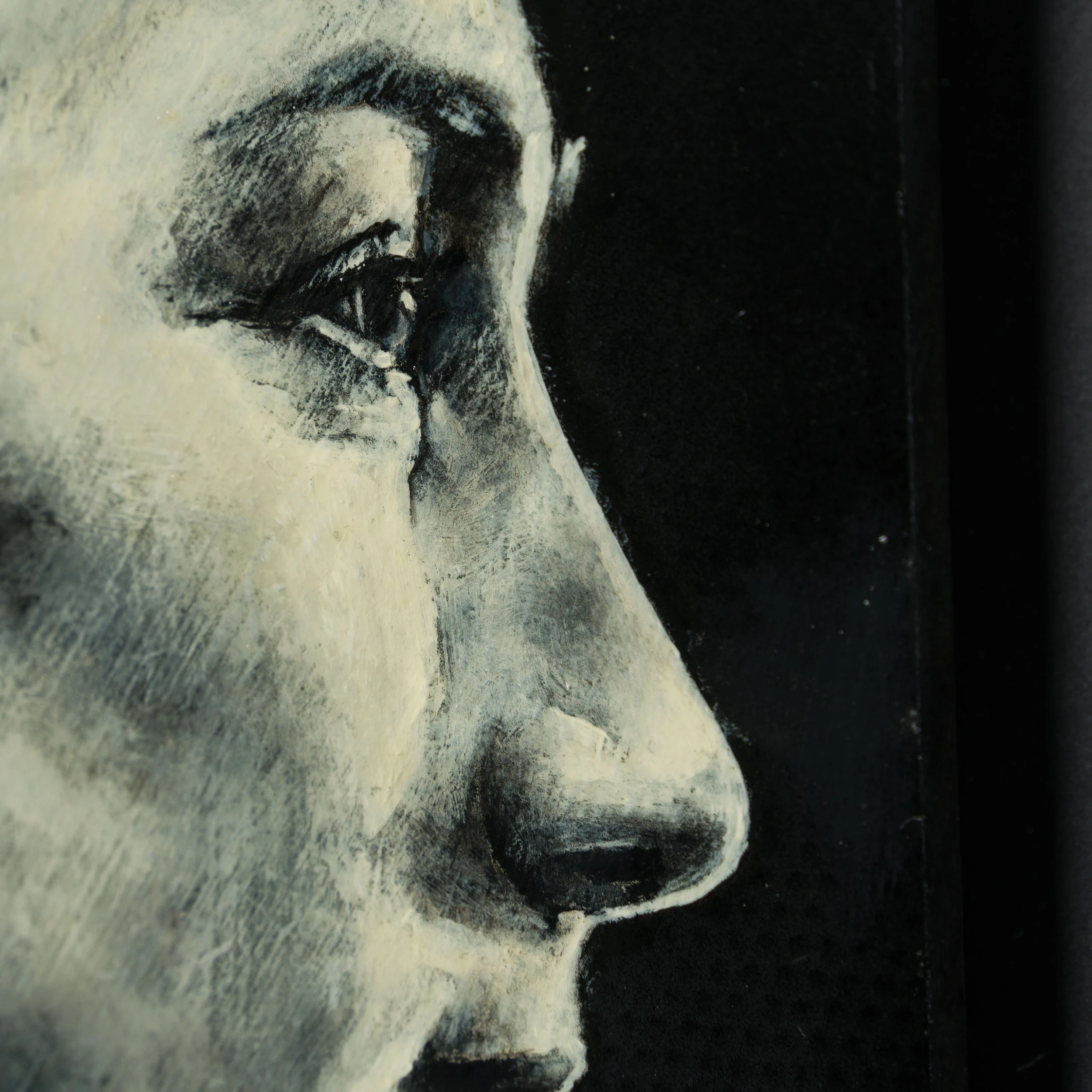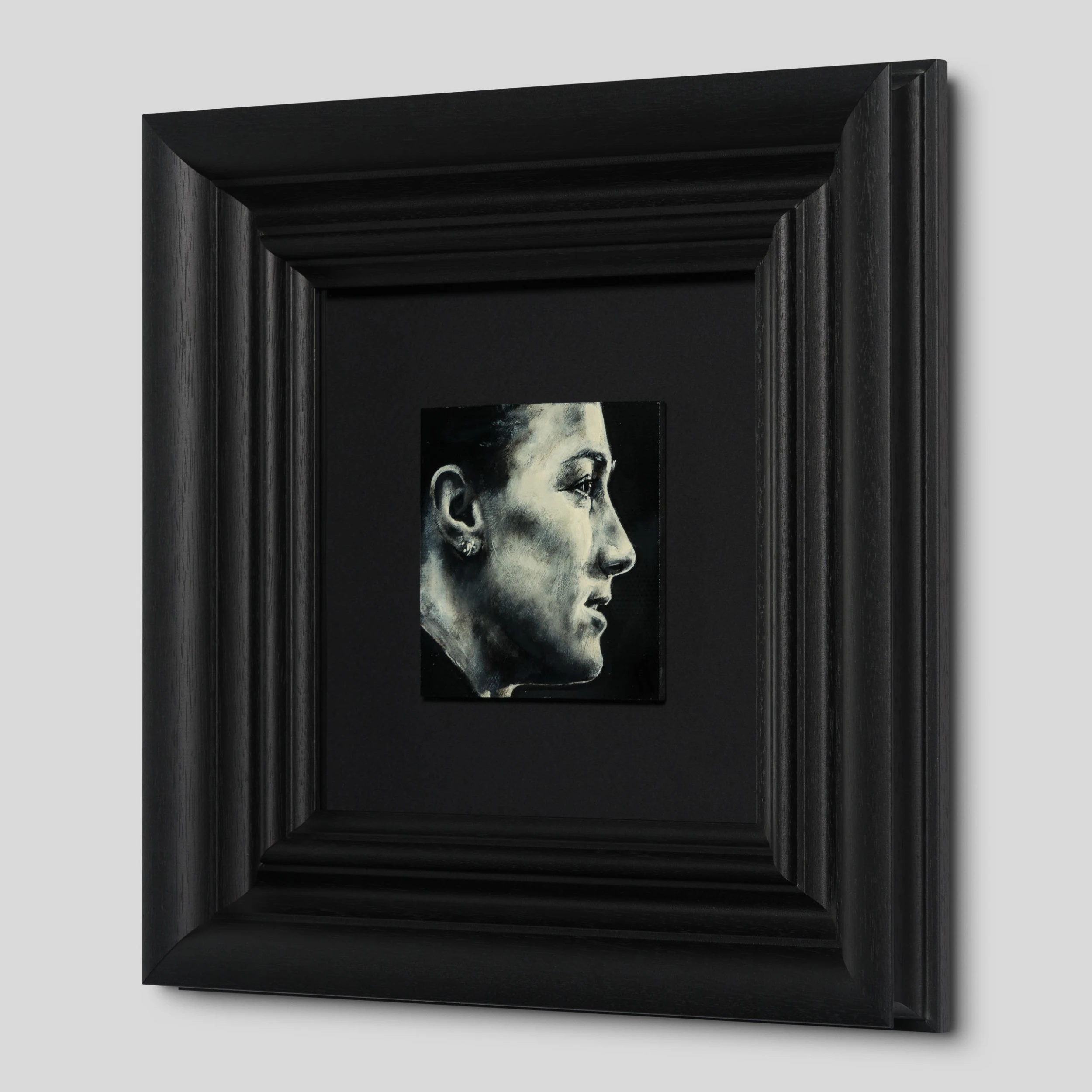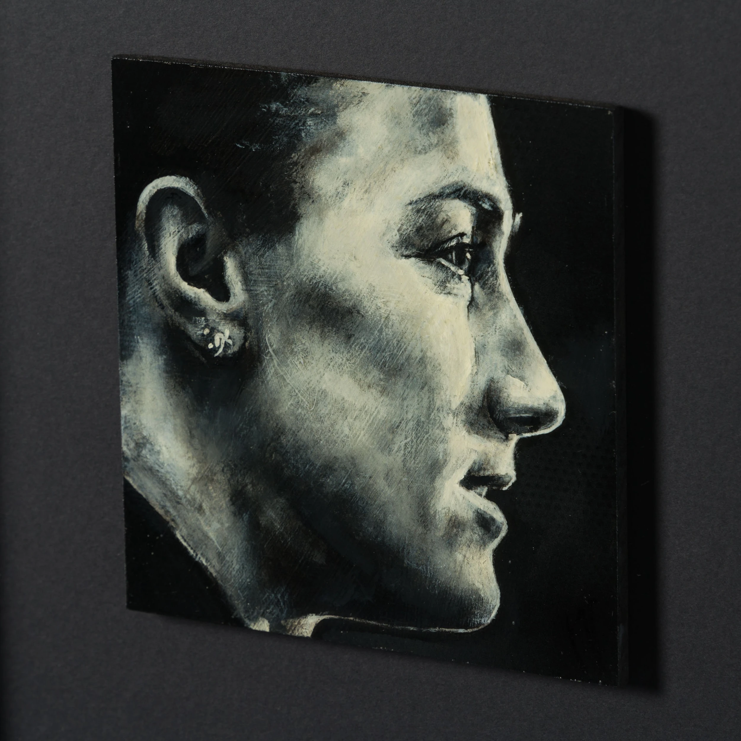 Perplexing, and melancholic, Jon’s work is created from the heart, capturing expressions, moods and feelings. All the individual portraits are from people who have interested or inspired the artist in this case the English footballer Lucy Bronze. Using conflicting tones of cream white, black and grey to create a highly atmospheric figurative artwork with an essence of realism capturing a monochrome scene.