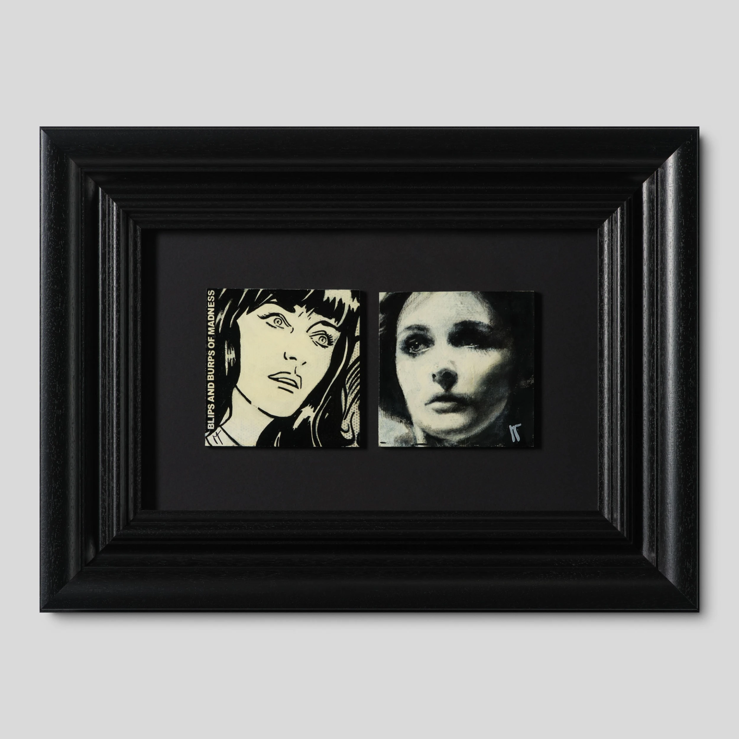 Jones’s work is a culmination of influences from Lichtenstein, whose work was influenced by popular advertising and the comic book style of the early 1960s; Basquiat, with his raw gestural style of painting with graffiti-like images and scrawled text; Rembrandt, a personal hero of Jon’s, considered one of the greatest storytellers in art and unusually gifted in capturing moods and Joshua Reynolds the leading portrait painter of the 18th Century. These influences contributed to Jon Jones personal portrait style he’s known for. Bespoke framed and mounted in textured black radiata pine, this original painting will add a dark and sultry touch to any space.