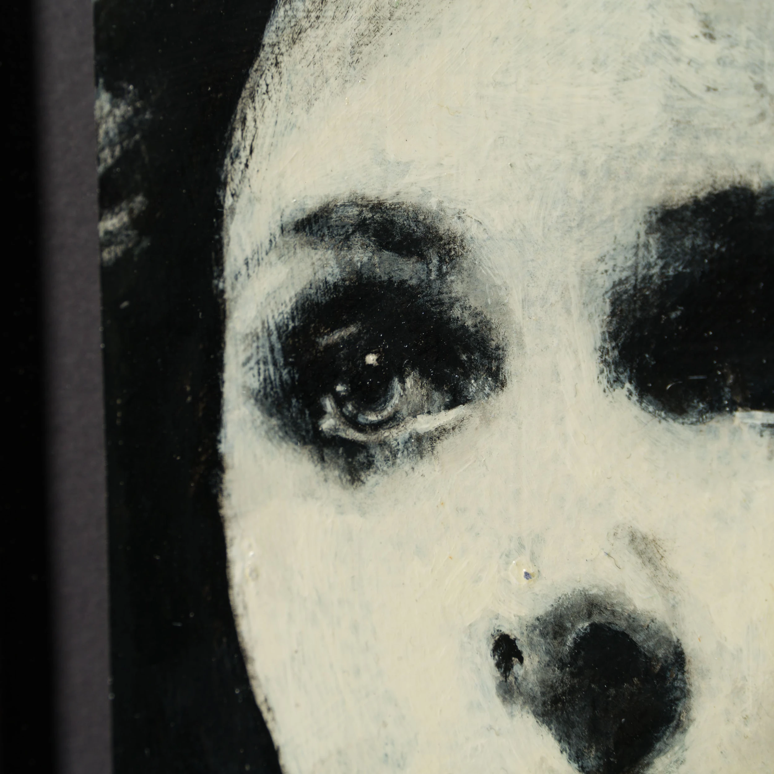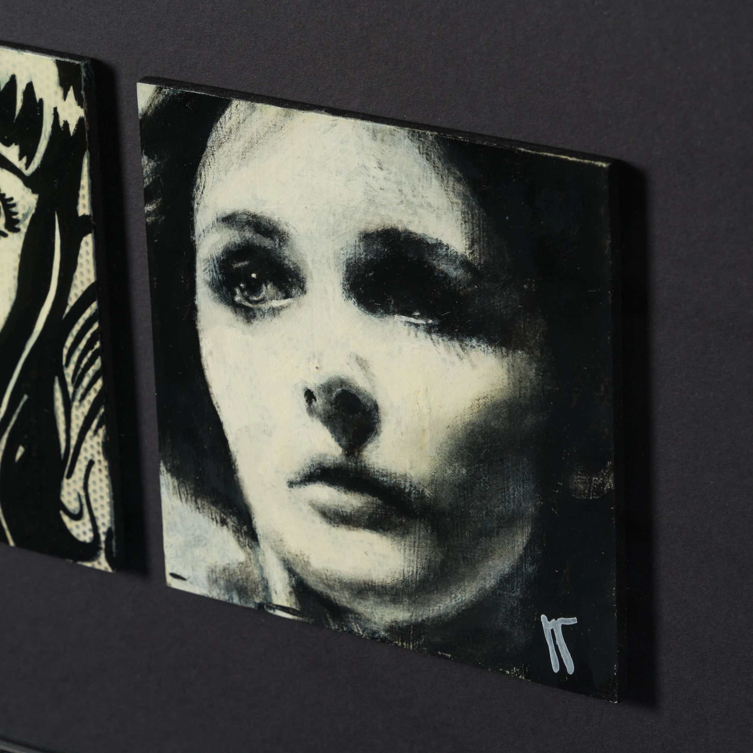Perplexing, and melancholic, Jon’s work is created from the heart, and whilst striving to capture expressions, moods and feelings as a portrait painter, Jon loves the juxtaposition between the portraits with the “animated” portrait, bring a new humour element to the piece. All the individual portraits are from people who have interested or inspired the artist in this case the Canadian actress Margot Kidder. “When I painted them, it was a double portrait reminding me of fragility of life, that how we are viewed/ the mask we wear to the outside world, often hides the real persons fears, insecurities. She was a truly beautiful person”.