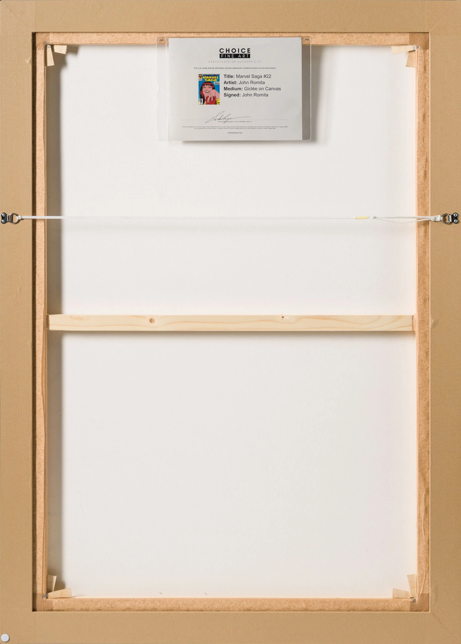 Published in 1987, “Marvel Saga #22” is a Marvel Superhero unique edition of the issue’s cover, hand-signed by John Romita Sr. Published from 1985 to 1987, The Marvel Saga was a comic book series that told the story of the first 25 years of the Marvel Universe in a sequential, narrative story.