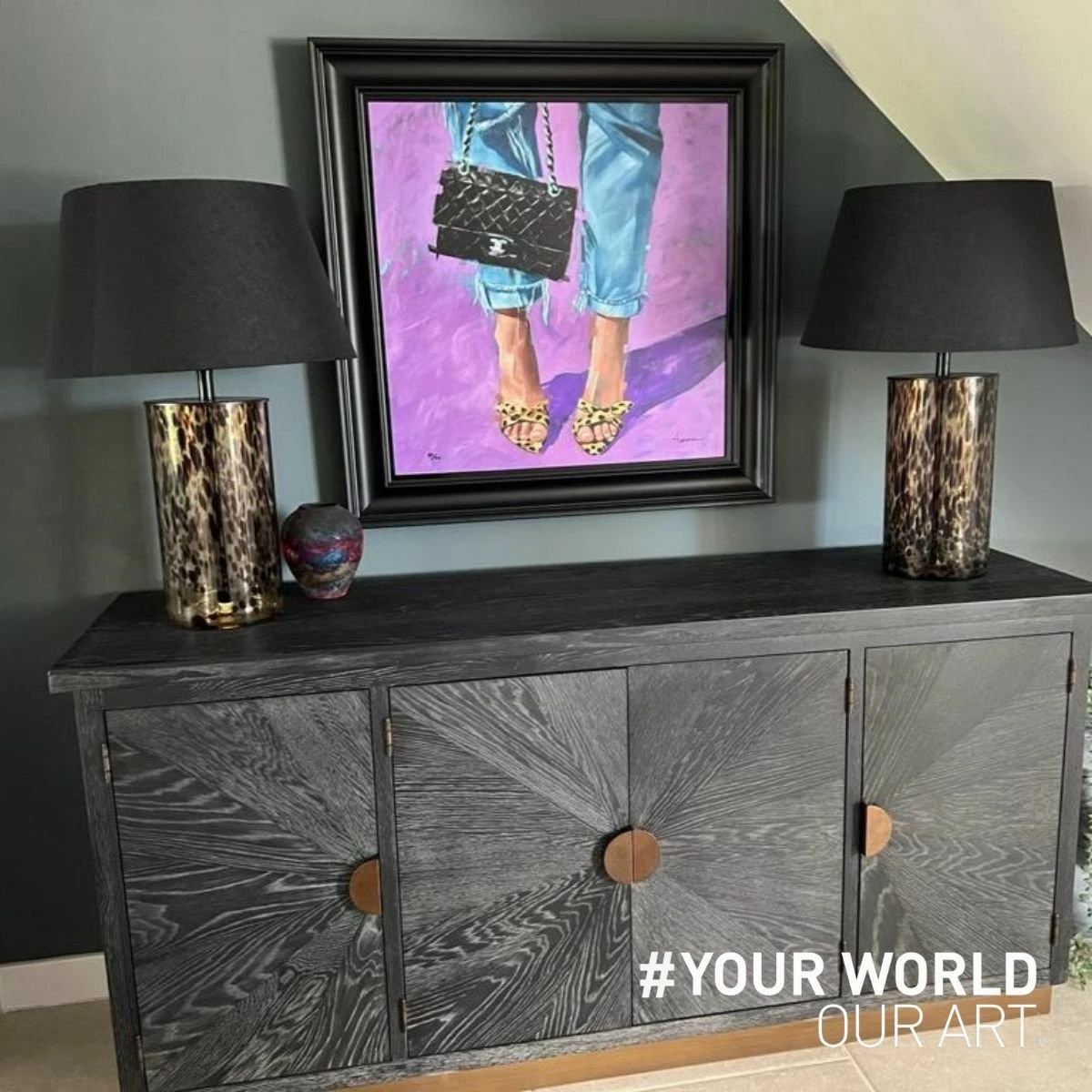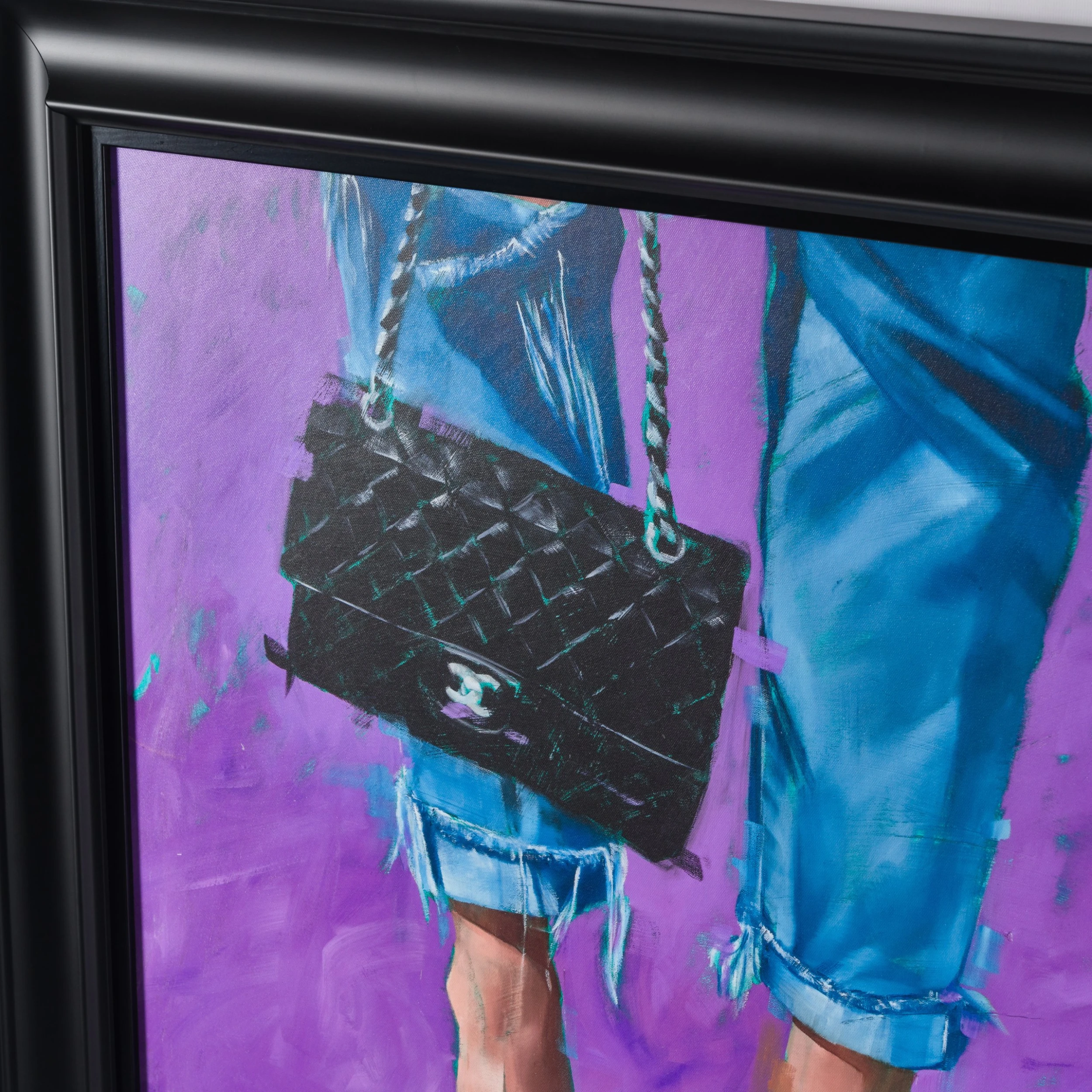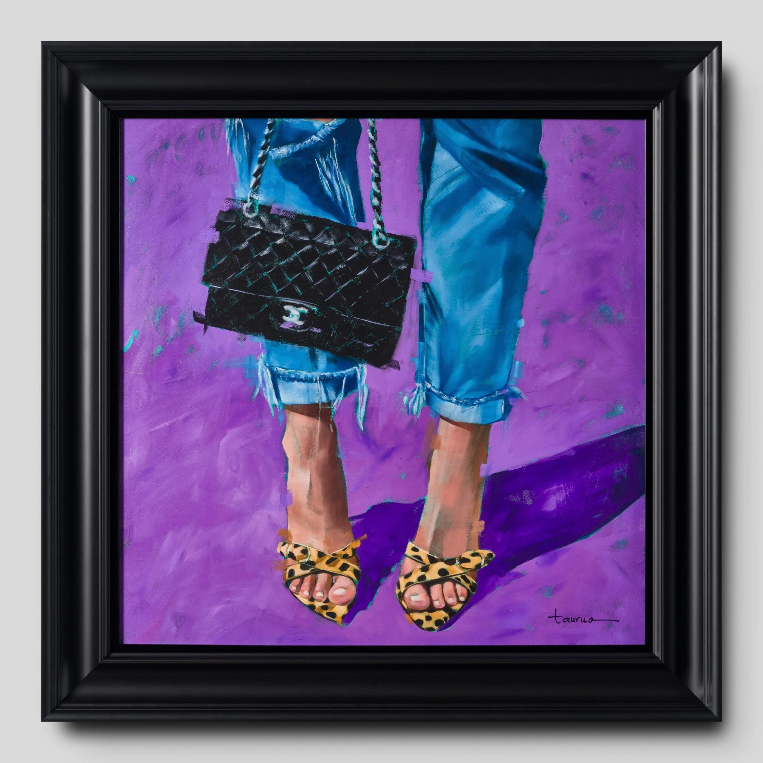 Electric shades of purple and gorgeous textures of fashion characterise this signed limited edition artwork by Pascale Taurua. We see delicate, frayed strands of denim hover above dainty ankles adorned with bold cheetah print stilettos which enhance the classic quilted leather Coco Chanel bag reinvented in 1955. A bold mix of contemporary fashion with classic glamour, this artwork will add an exciting pop of colour and style to any space.