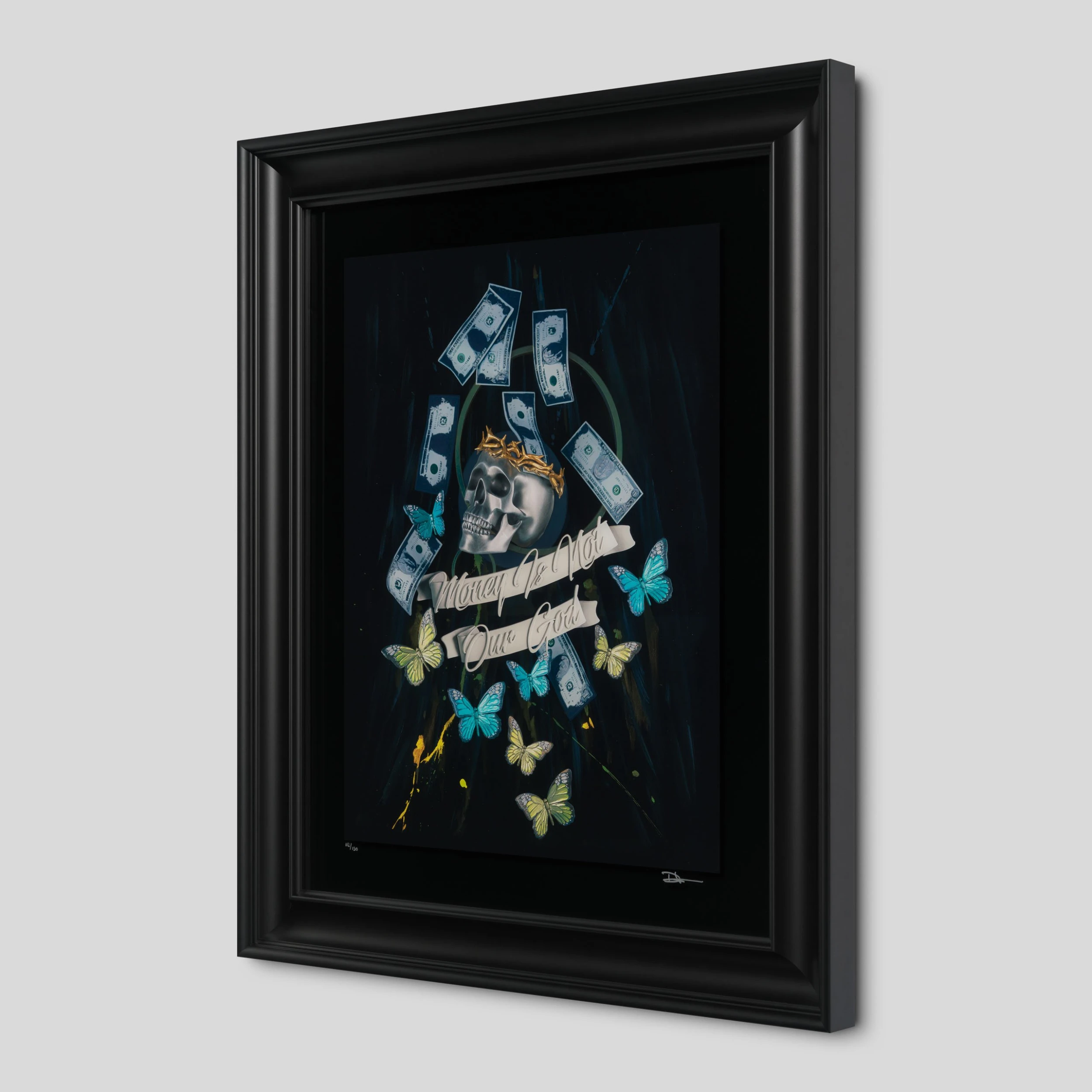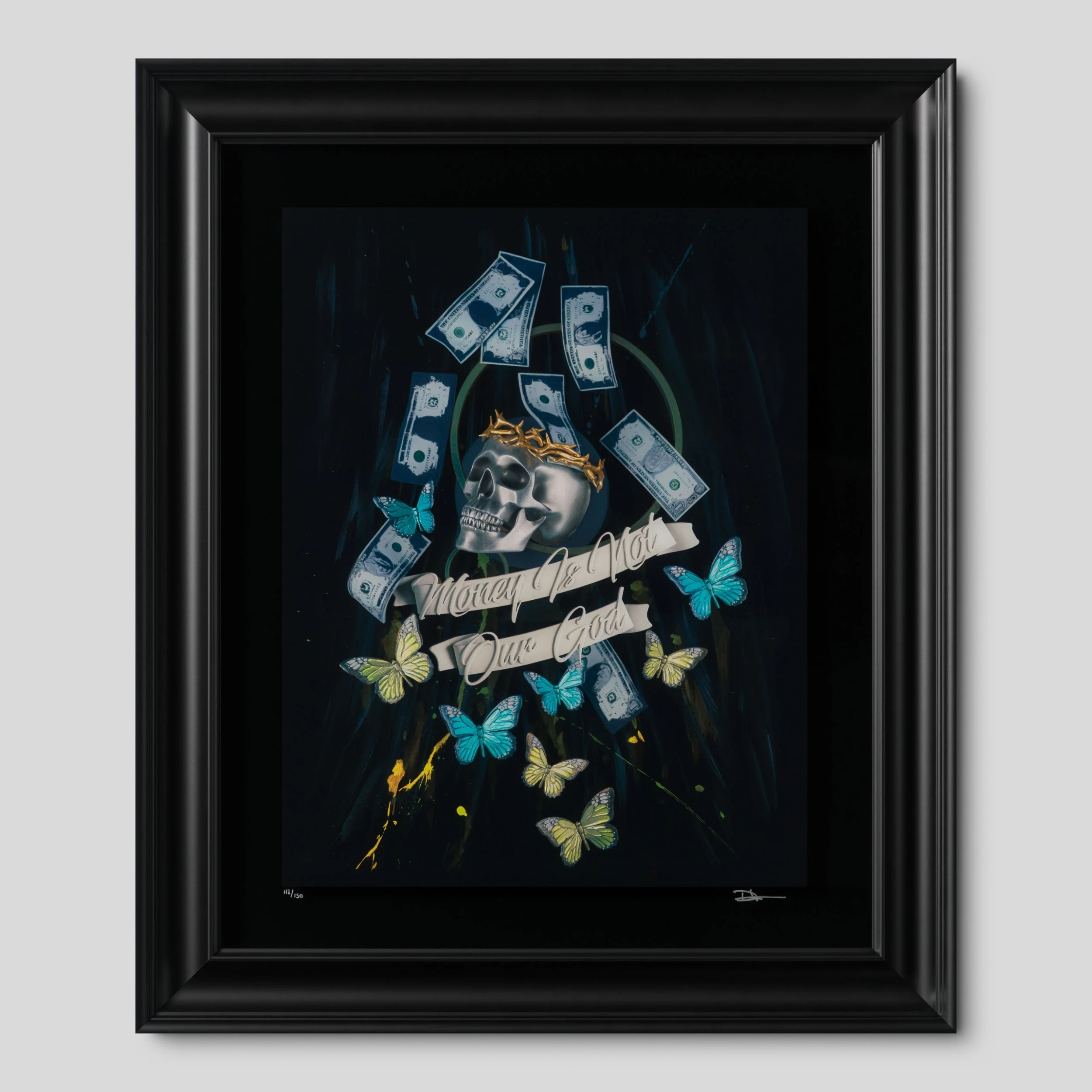 Constantly constructing concepts as physical creations, Lane’s development and experimentation methods coupled with his ability to blend thematic elements, results in work that is simultaneously stylistically distinct and ever evolving. This elegantly portrayed on glass, bold limited edition is a statement piece in any room. The limited edition is as unique as the original, printed with expertise that highlights the metallic and silver details, adding depth to the smallest elements like the butterflies surrounding the skull and the dollar bills.