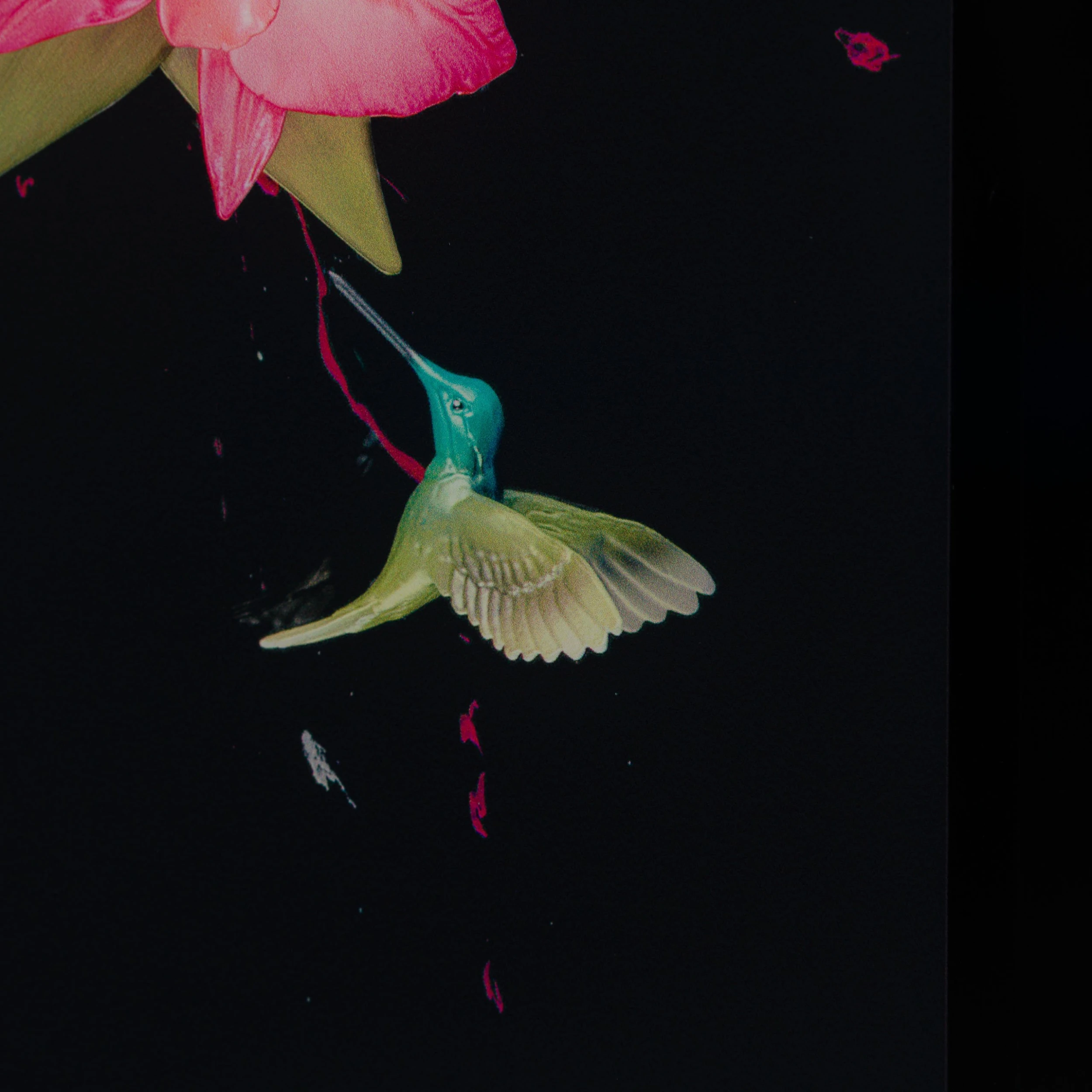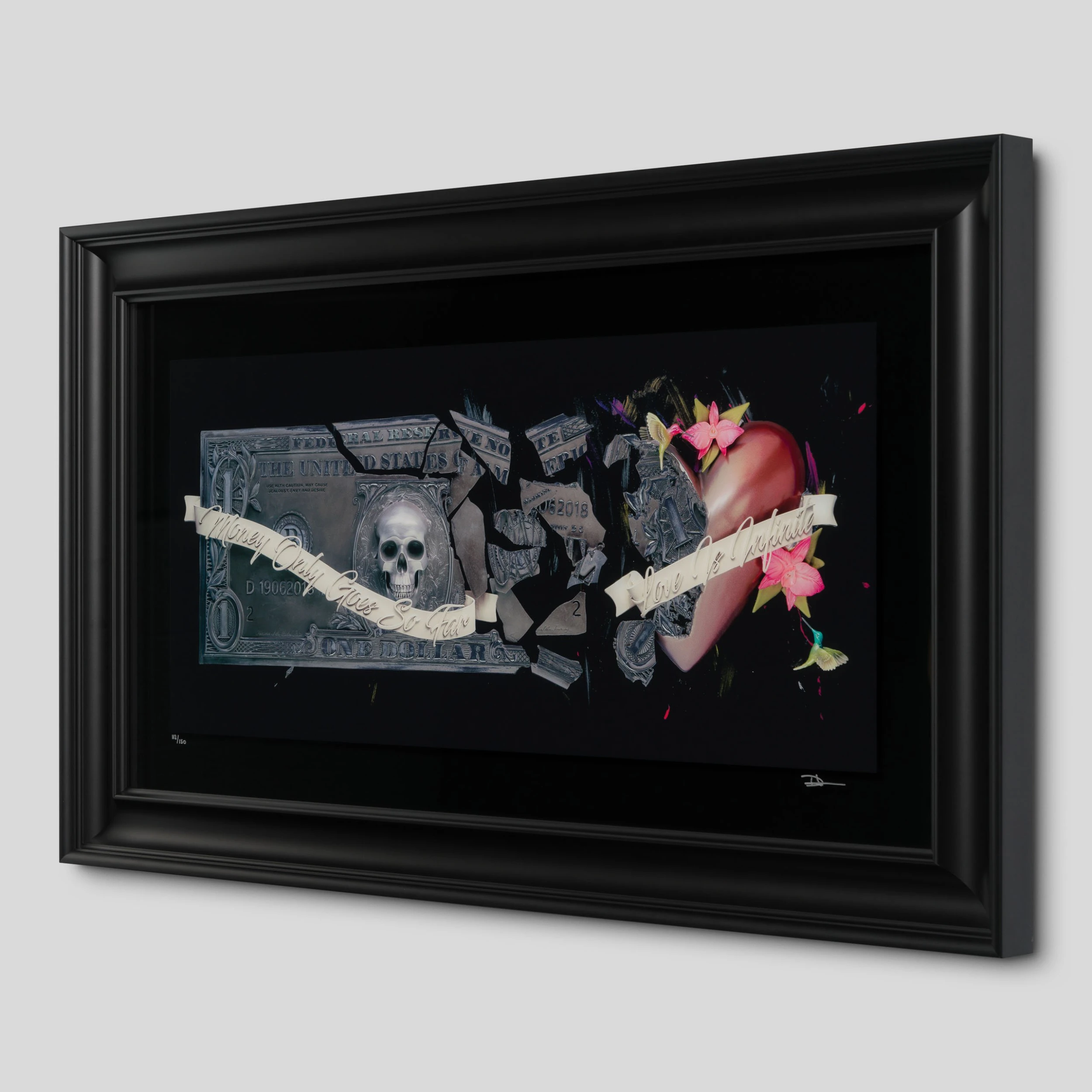 Constantly constructing concepts as physical creations, Lane’s development and experimentation methods coupled with his ability to blend thematic elements, results in work that is simultaneously stylistically distinct and ever evolving. This elegantly portrayed on glass, bold limited edition is a statement piece in any room. The limited edition is as unique as the original, printed with expertise that highlights the metallic and silver details, adding depth to the smallest elements like the flowers surrounding the heart and the dollar bill.