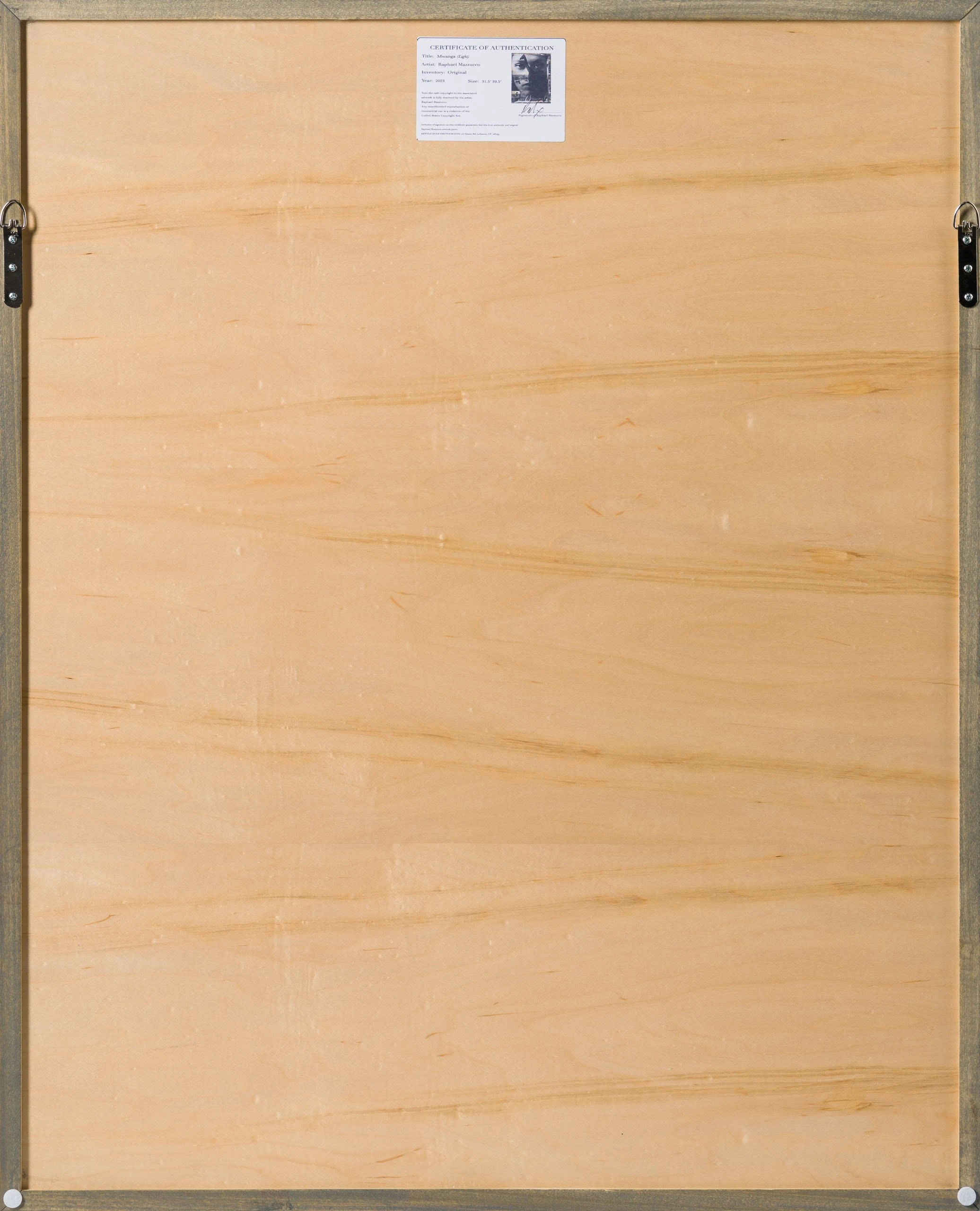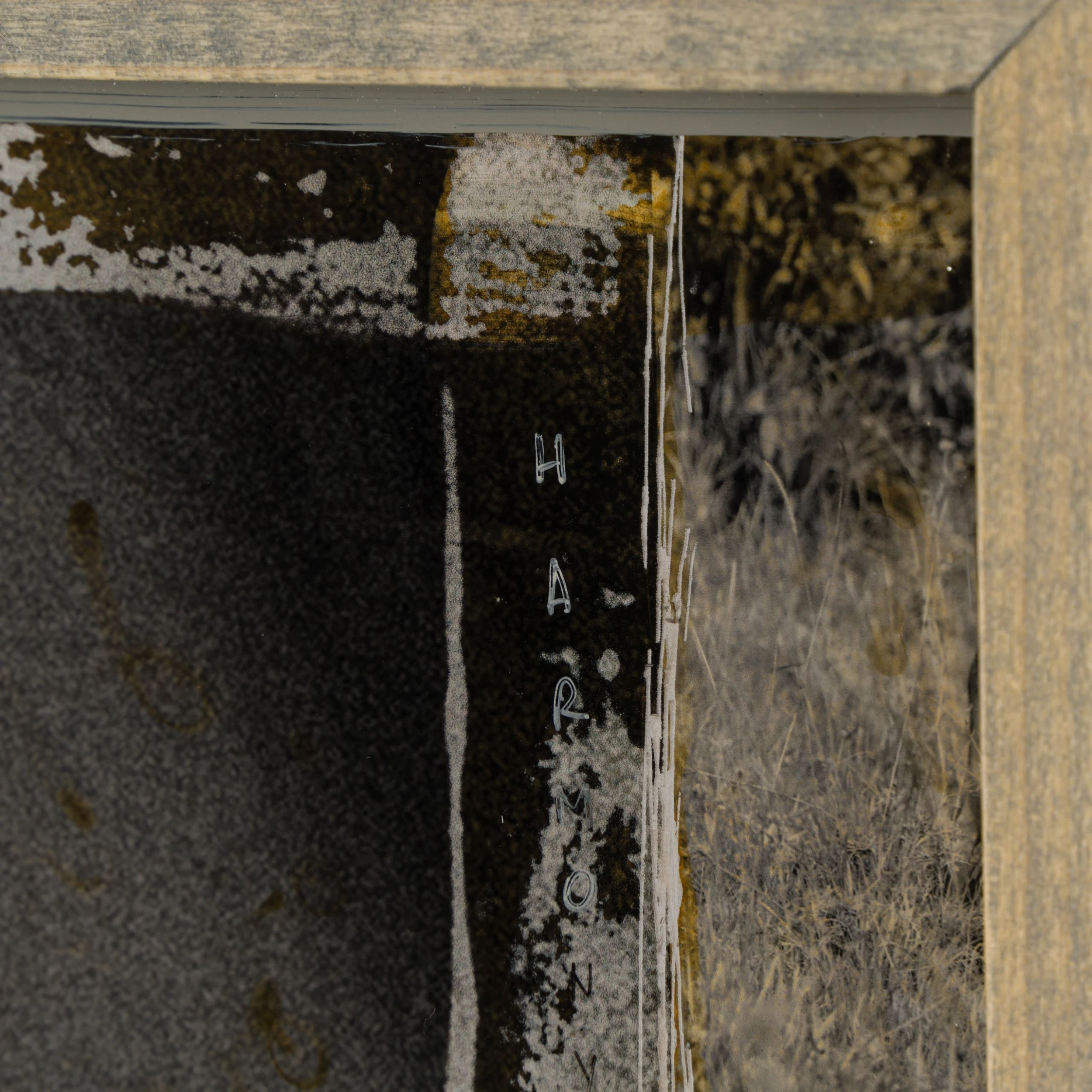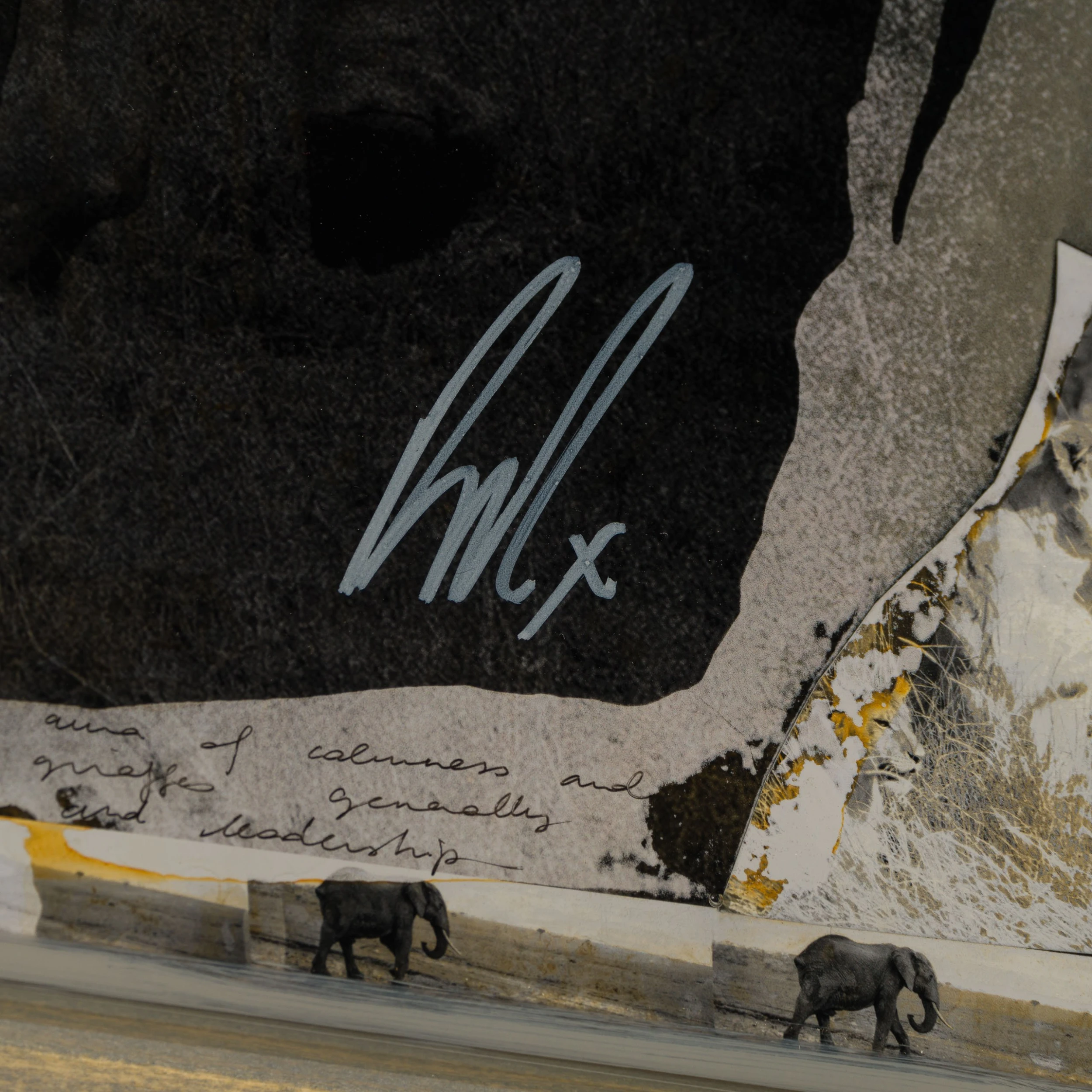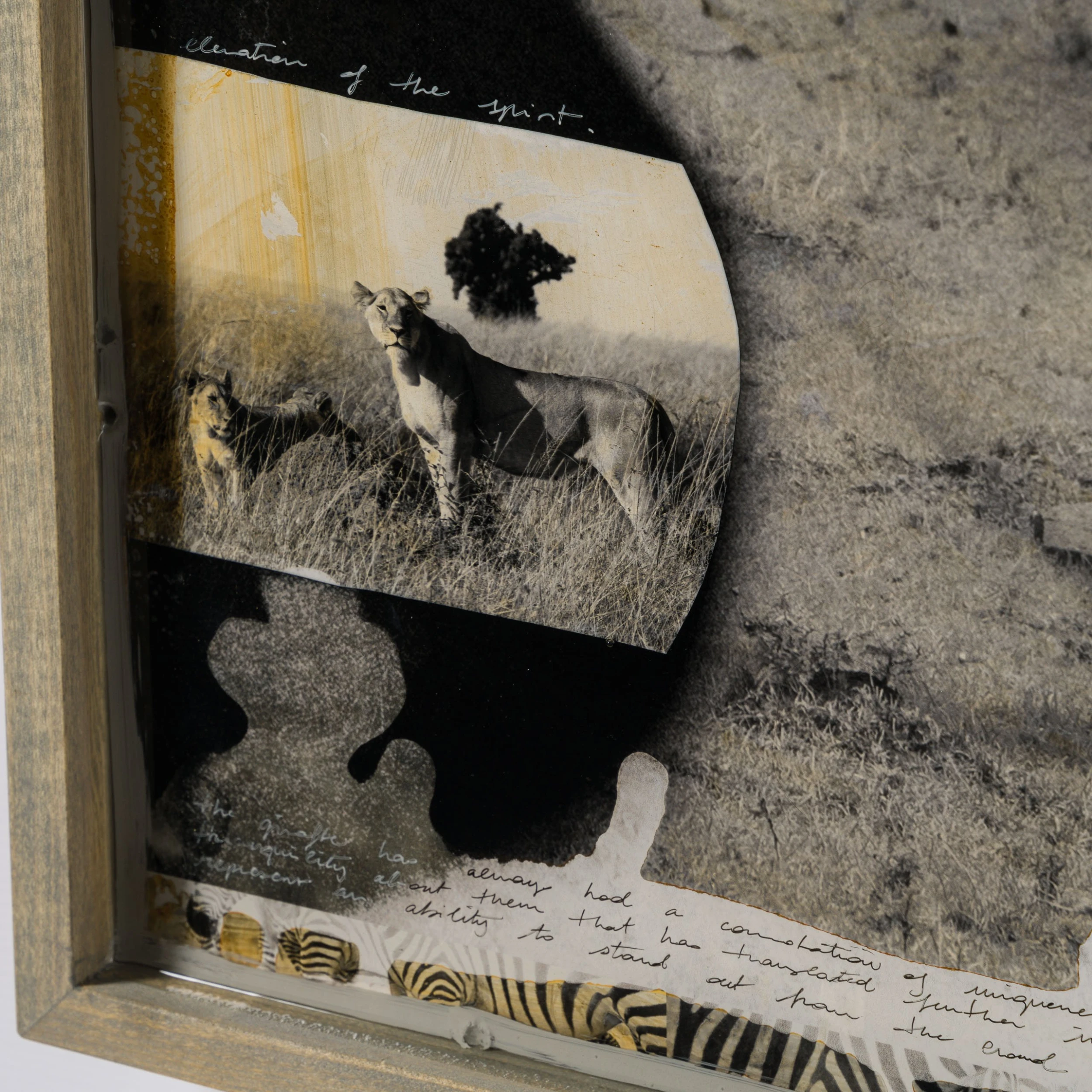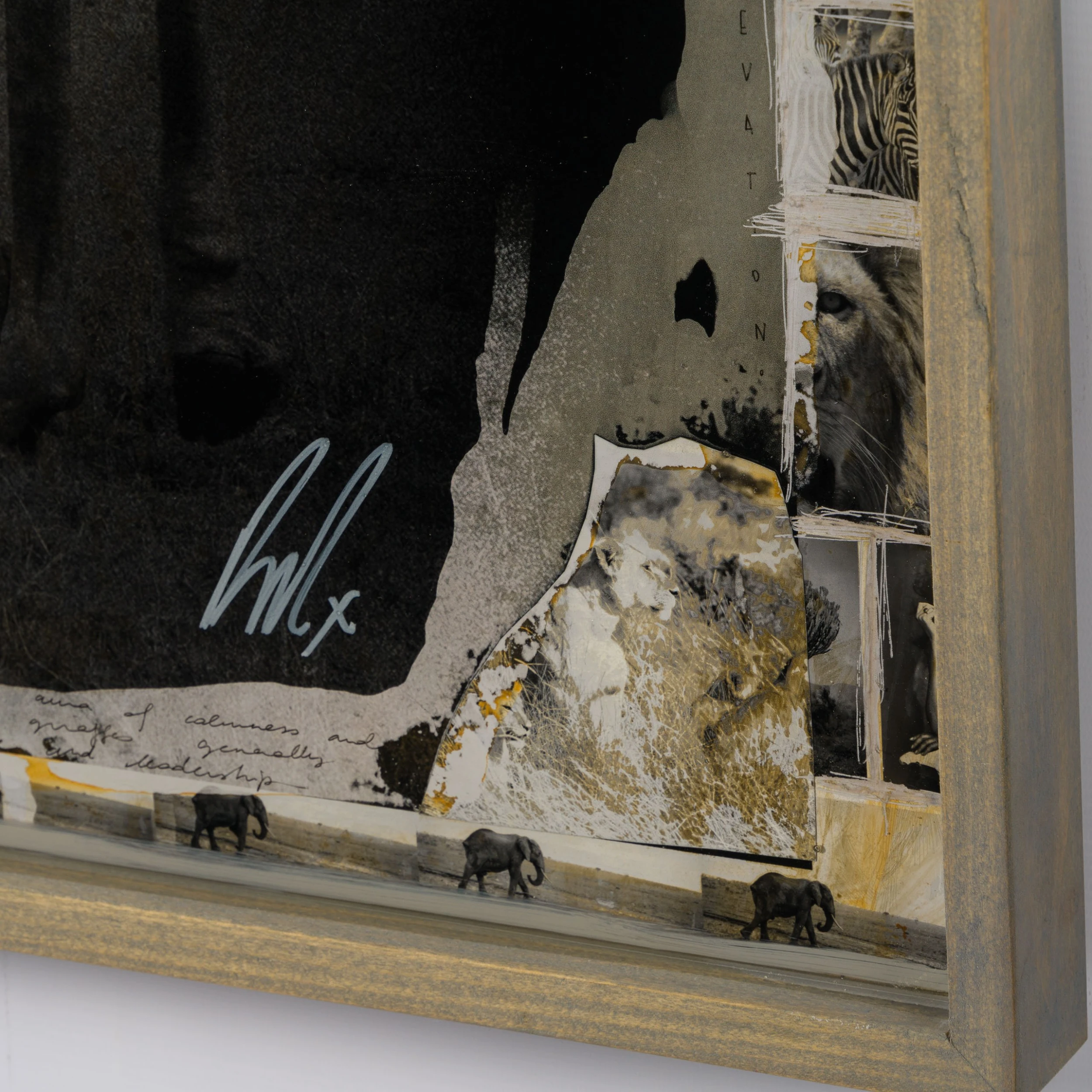 With Moroccan pigments and Vietnamese paints, Mazzucco’s pieces are characterised by the juxtaposition between wildlife and cultural photography, this incredible piece forms part of his introspective collection Grass Roots 2023. “Mwanga (Light)” features photography, mainly in sepia earthy tones, enhancing the raw beauty of the images. The piece tells a story in layers. The overlaying of photography, paint, handwriting, and resin adds life into the composition, creating a statement original.