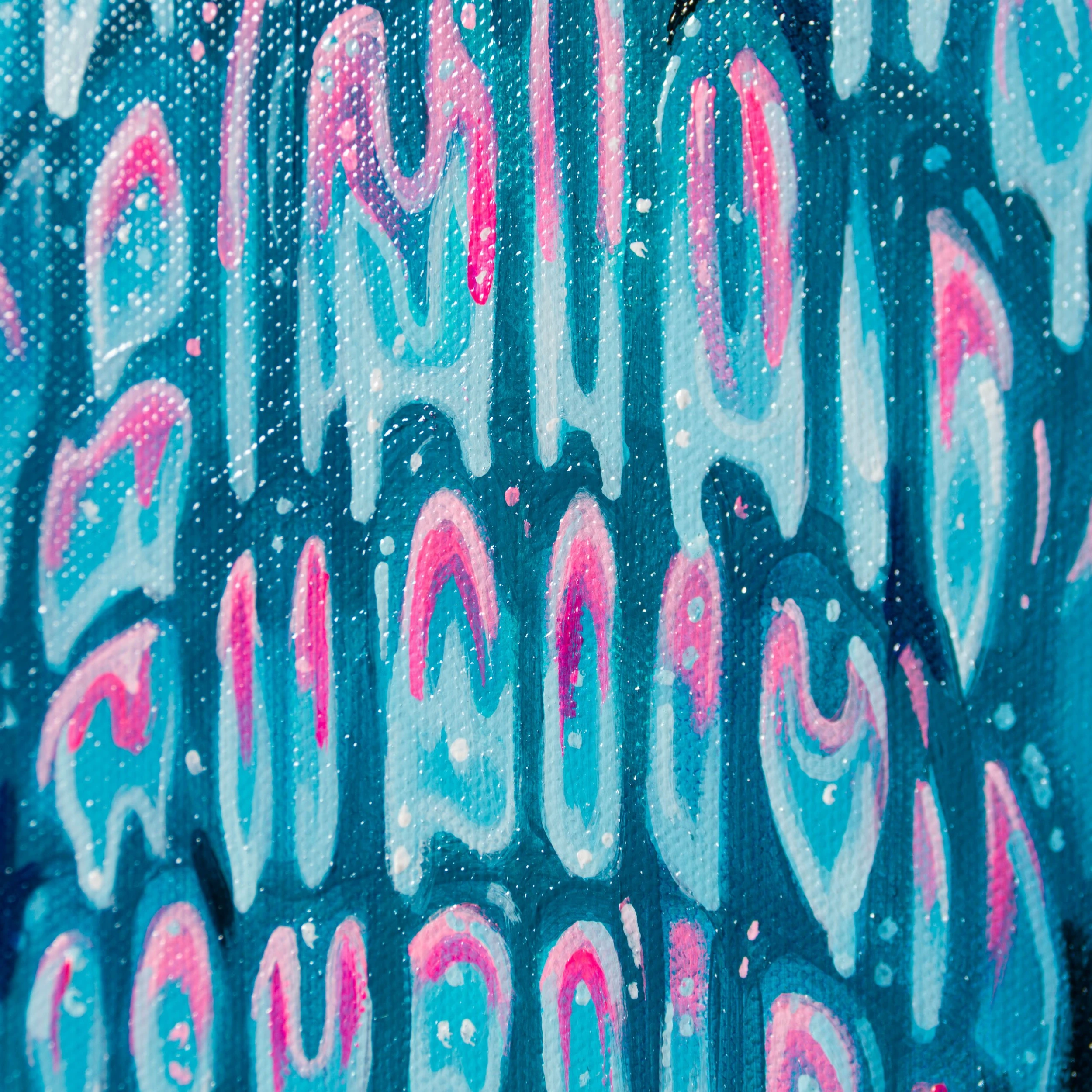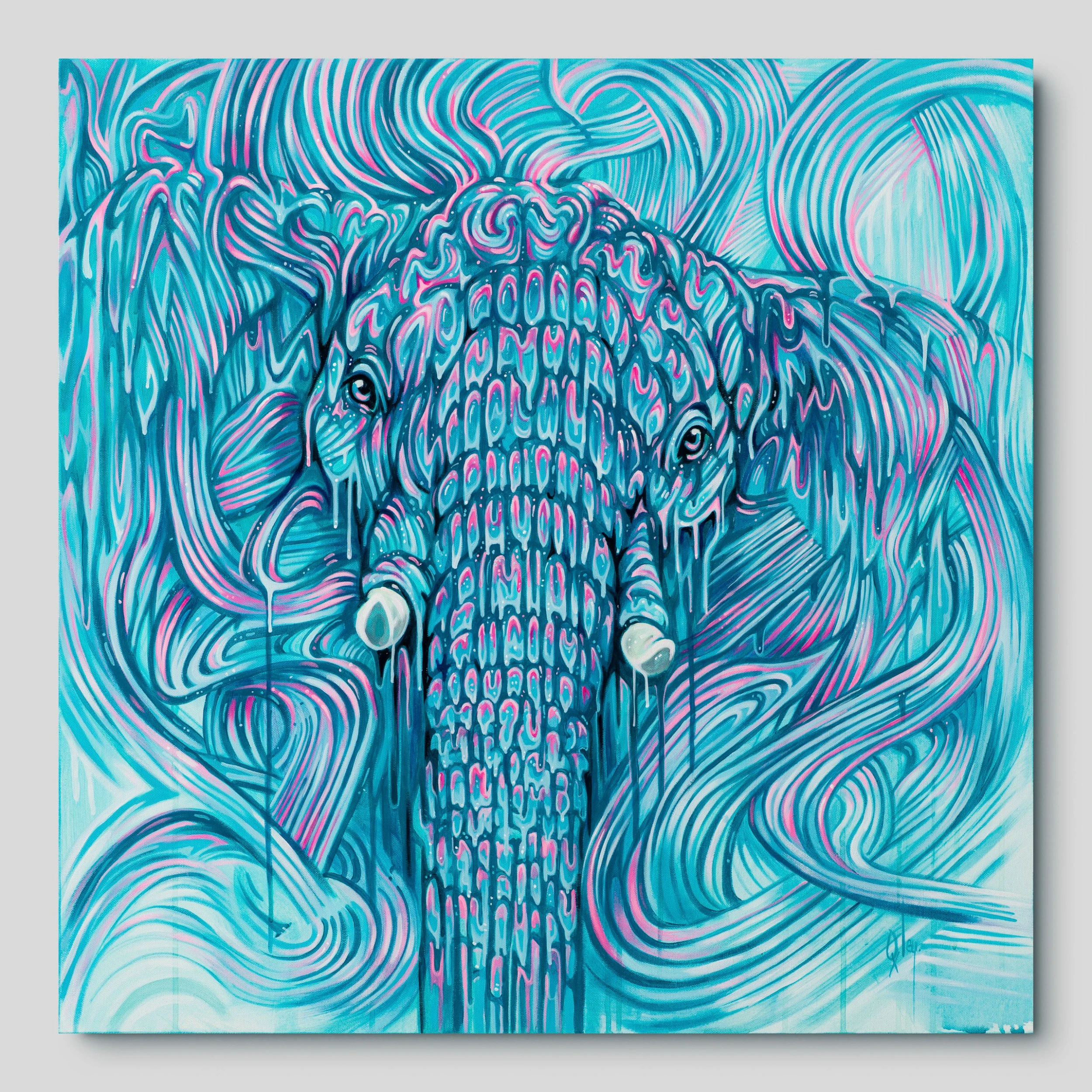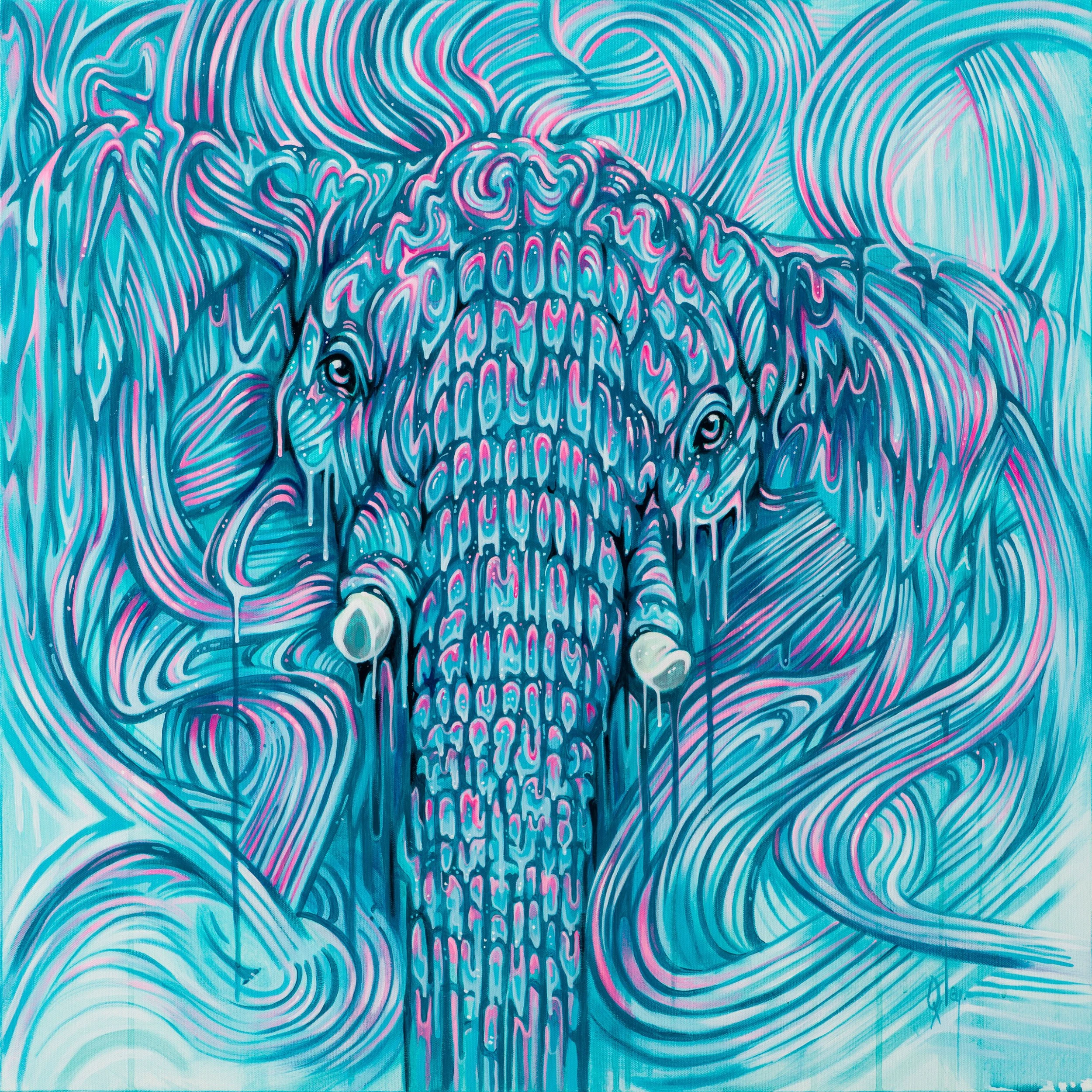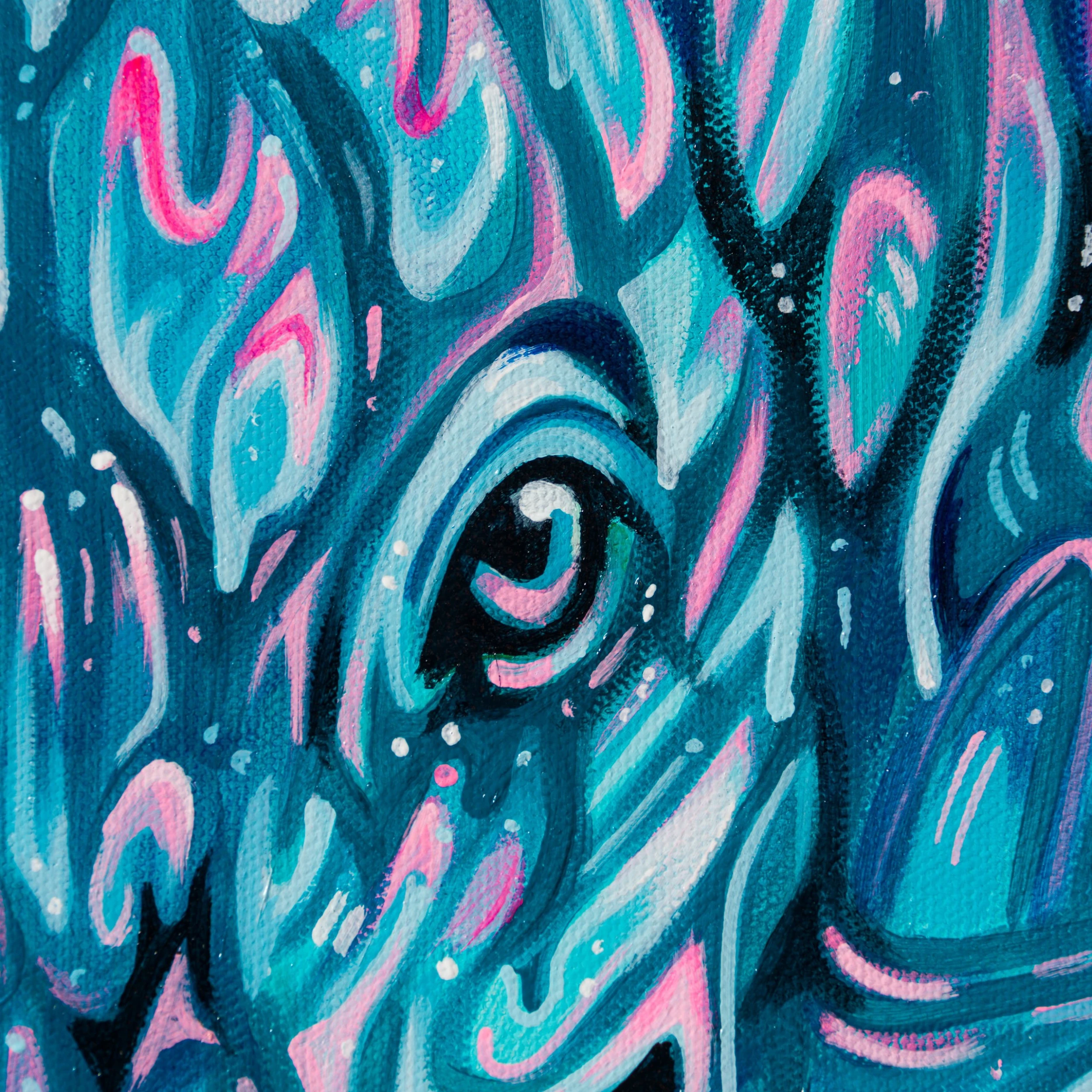 Many of Oxley’s pieces skilfully blend elements of surrealism and expressionism, infusing each piece with energy and emotion. His expressive brushwork is energetic and fluid, giving his paintings a sense of movement and spontaneity as his captivating portraits feature wild animals created through intense patterns and psychedelic colour. The traditional colours of the animal are overthrown by exciting vibrant shades, transforming it into an “ethereal, astral” being through his kaleidoscopic use of colour and form. The strong rainbow shades contrast beautifully with the white background.