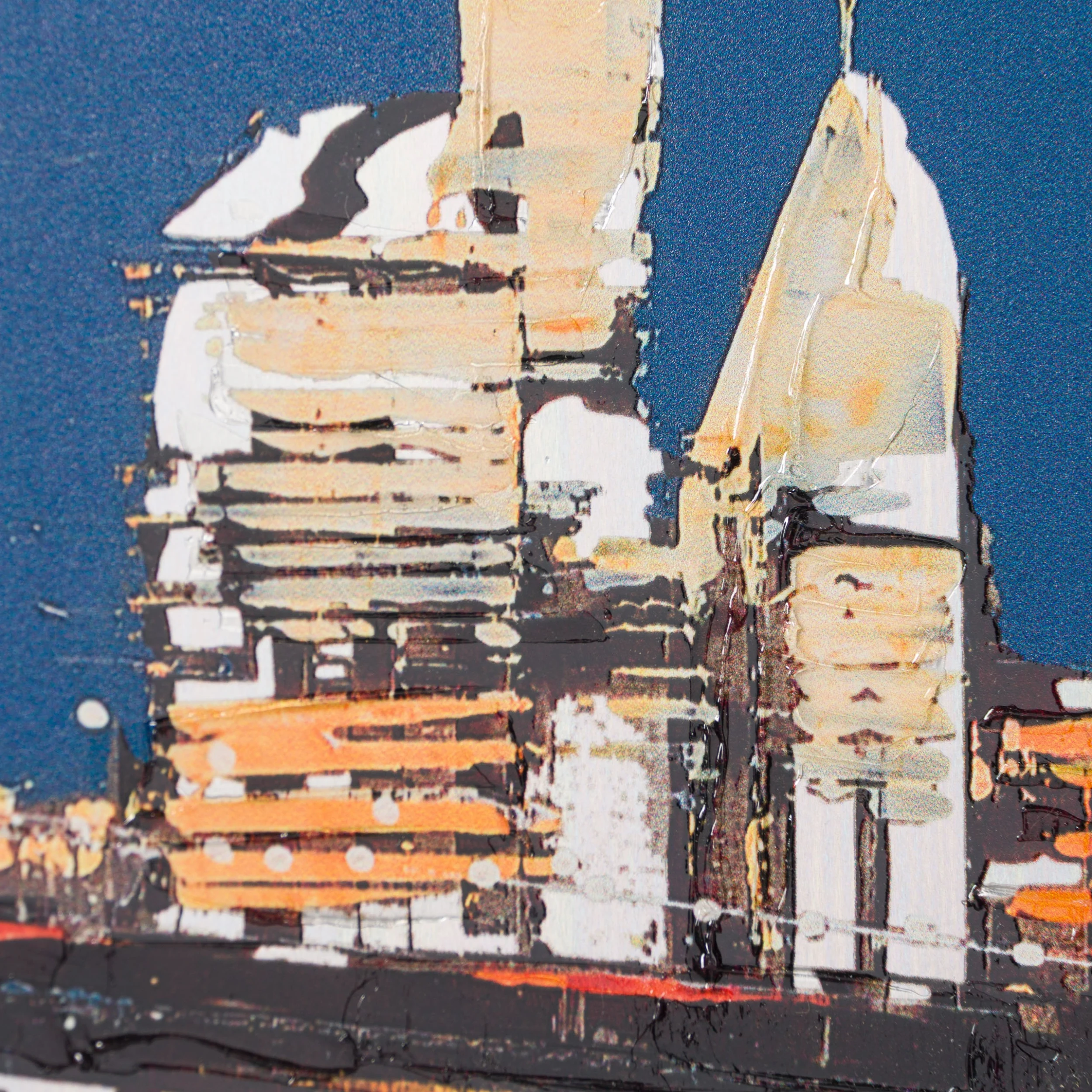 This incredible signed limited-edition artwork by Paul Kenton is simultaneously full of colour and darkness. Using sharp, small, and colourful accents, the artist has brought the gritty and hustle of New York city to life accentuated by the representation of light, which has always been a key medium for Kenton’s breath-taking cityscapes. The Manhattan skyline comes alive with the dazzling lights and their reflection on the river, creating a feeling of both calm and excitement.