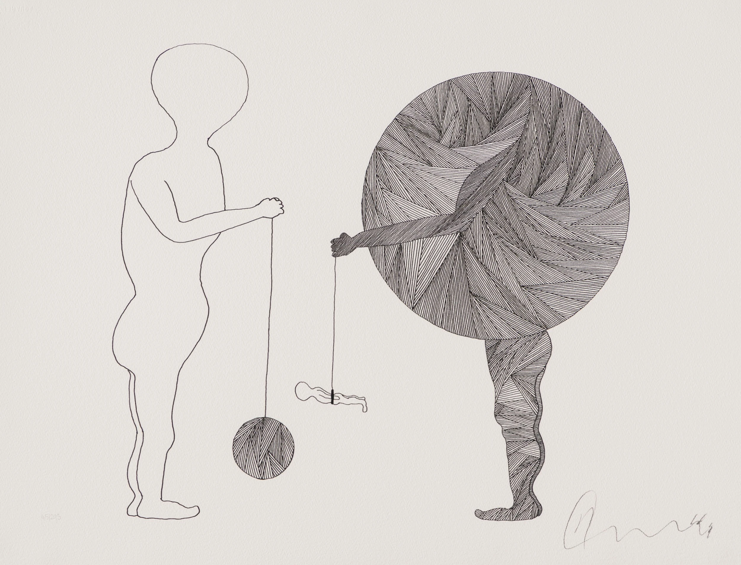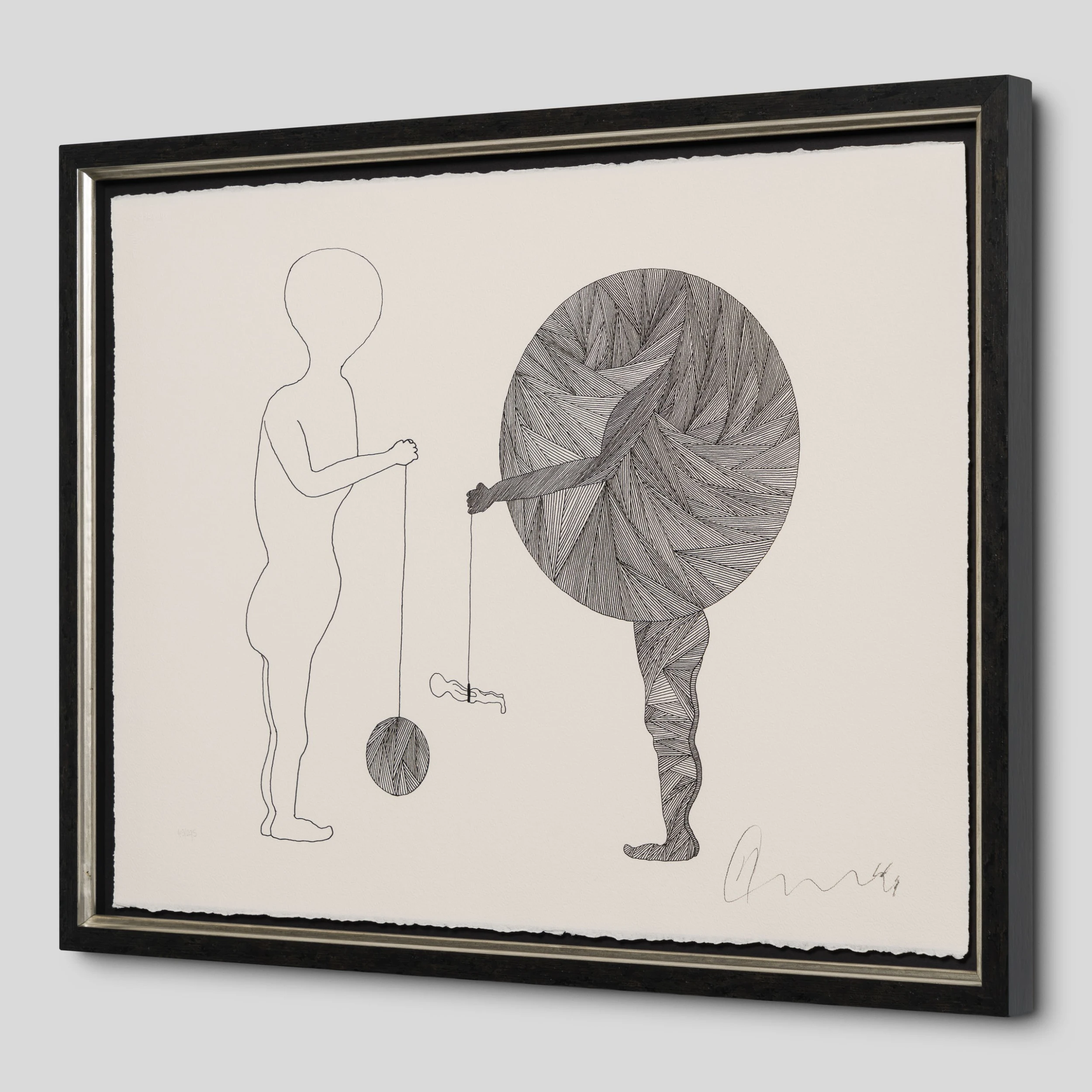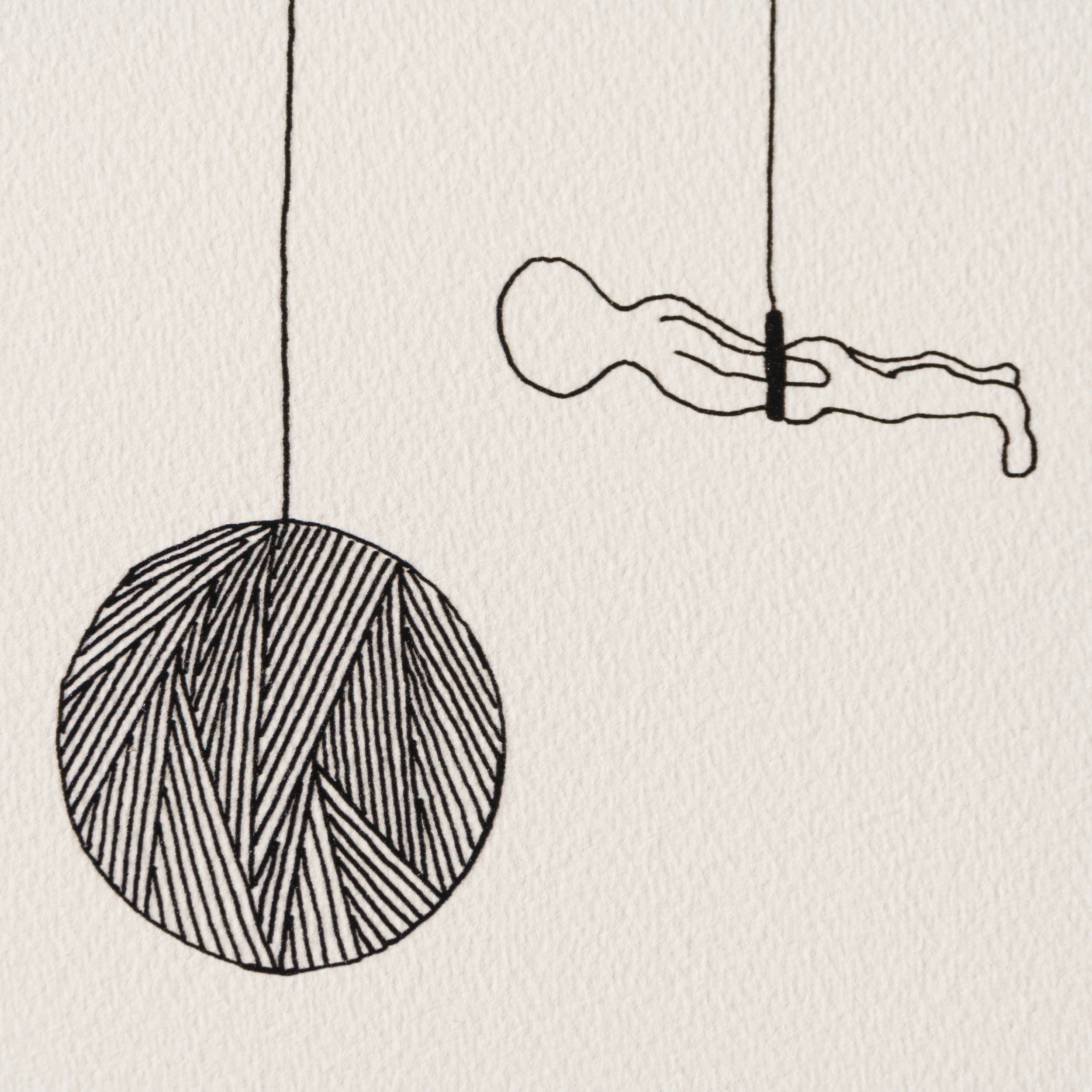 In his unmistakeable monochrome style, Connolly has revisited his own original style with the return of black and white drawings. While there’s pathos and darkness, the humour and wit reflected in the freehand artwork “Nightmare” is a true contemplation of Connolly’s character. Drawing inspiration from his own nightmares, Connolly’s representation of a nightmare is the dual contrast between his statement figure with a yo-yo and a yo-yo holding a man. Even though the artist changed his mind during the creative process, the change of shapes and lines came very naturally, creating this simplistic yet intrinsically captivating piece. “Dreams and nightmares, they are weird things that I wish I could remember them! I never do. But that makes it closer to me, the fact that I don’t know what it is; it’s just a nightmare.”