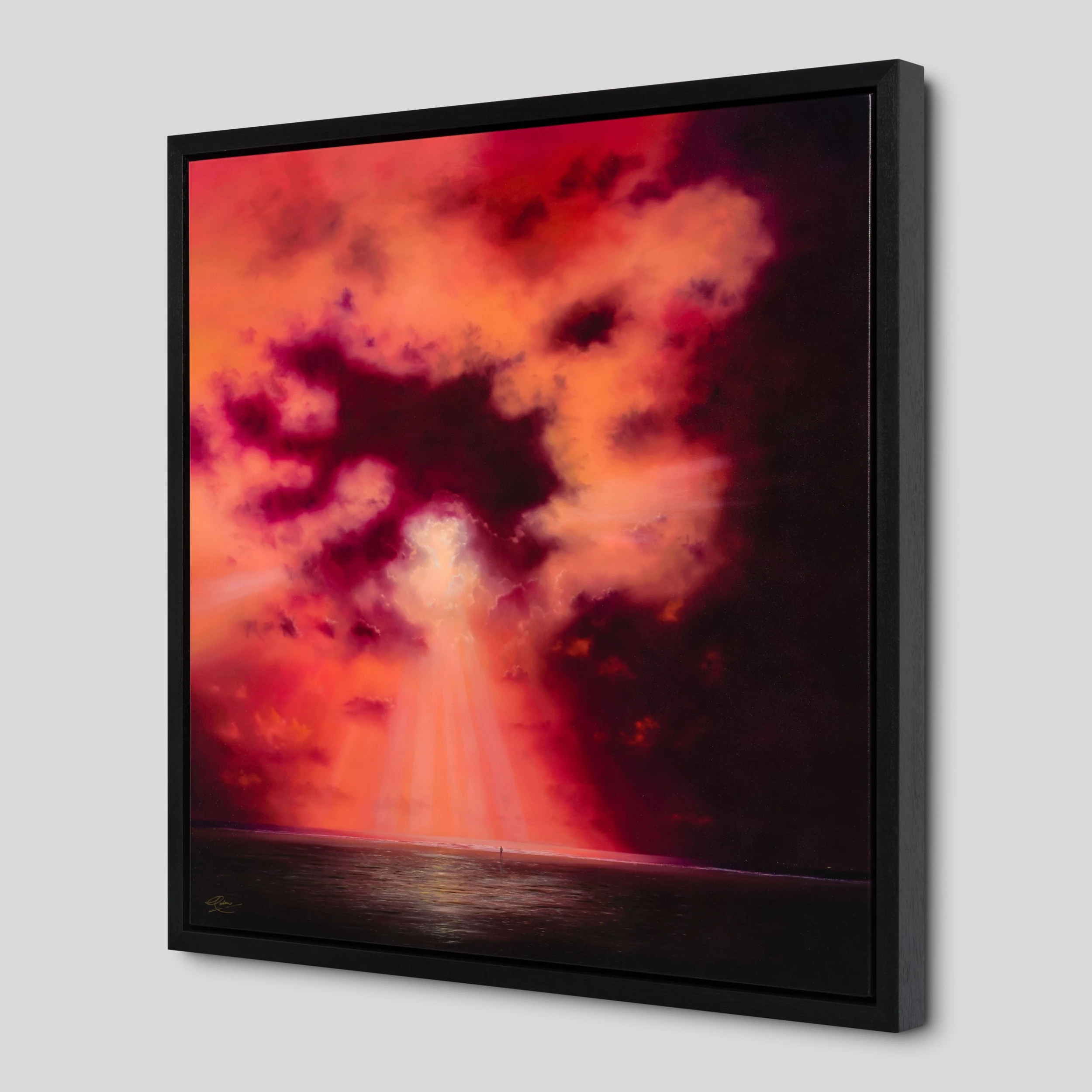 In ‘One Man Show’, the artist creates a magnificent piece where the main focal narrative is the beam of light, making the painted figure an added elements with expressive detail and creating the perfect dreamlike atmosphere. This evocative painting illustrates the power of nature. The light peering through the soft coloured clouds to the beams of light on the shoreline, this artwork has an ethereal surreal feeling to it. With the title phrase and the musical, theatrical feelings it encompasses as inspiration, Coulson created this piece around it. As a conductor of the epic display in front of him, the human figure is witnessing nature at its greatest, but in that moment it’s his ‘One Man Show’.