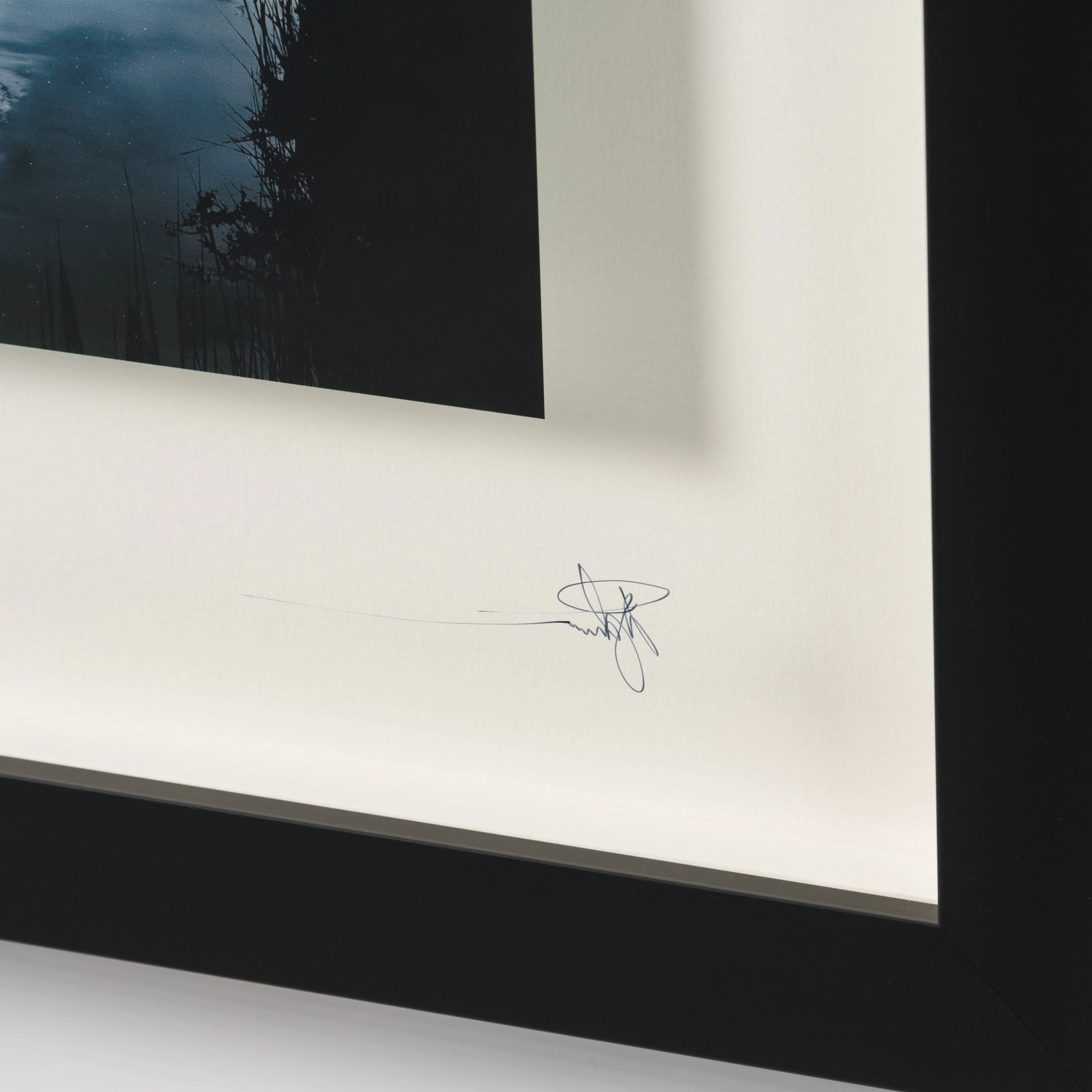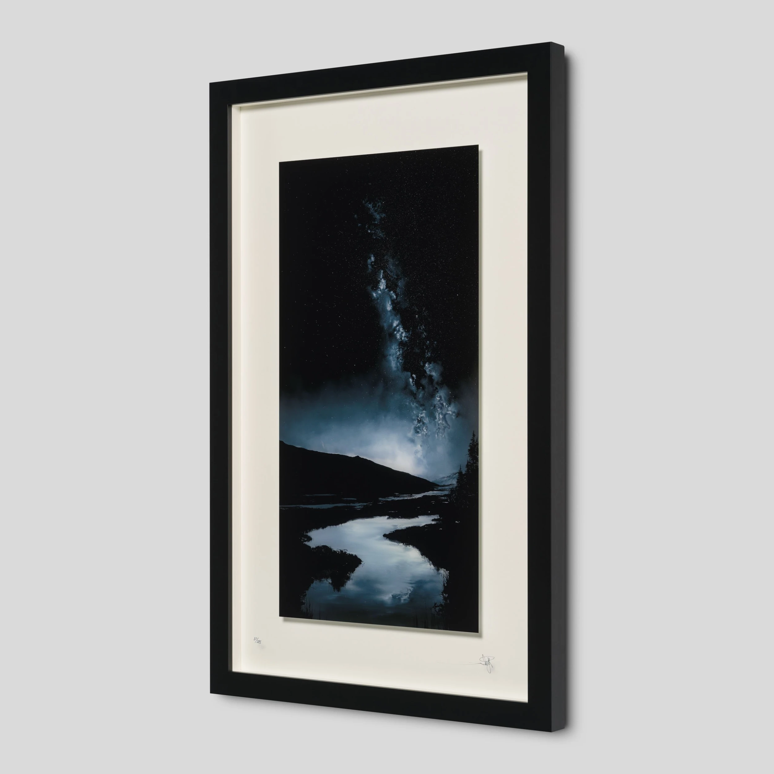 Rowan brings us a new instalment to his , with the addition of two monochromatic limited-edition prints. Inspired by Icelandic landscapes and the beauty of the Scottish Highlands, the artist wanted to work on a project focused on capturing his surroundings and memories of the places he’s seen the milk way. By combining his environment with the milky way, the artist reminds us to find awe in the world we live in and the night sky. Given the difficulty of creating a glass painting with a reduced palette as opposed to with vivid aurora colours, the artist wanted to experiment in portraying the beauty of the sky in just two monochromatic tones. Testing his skills, specially shading, was the hardest part of the process, but the artist created a really atmospheric painting with monochrome shading.