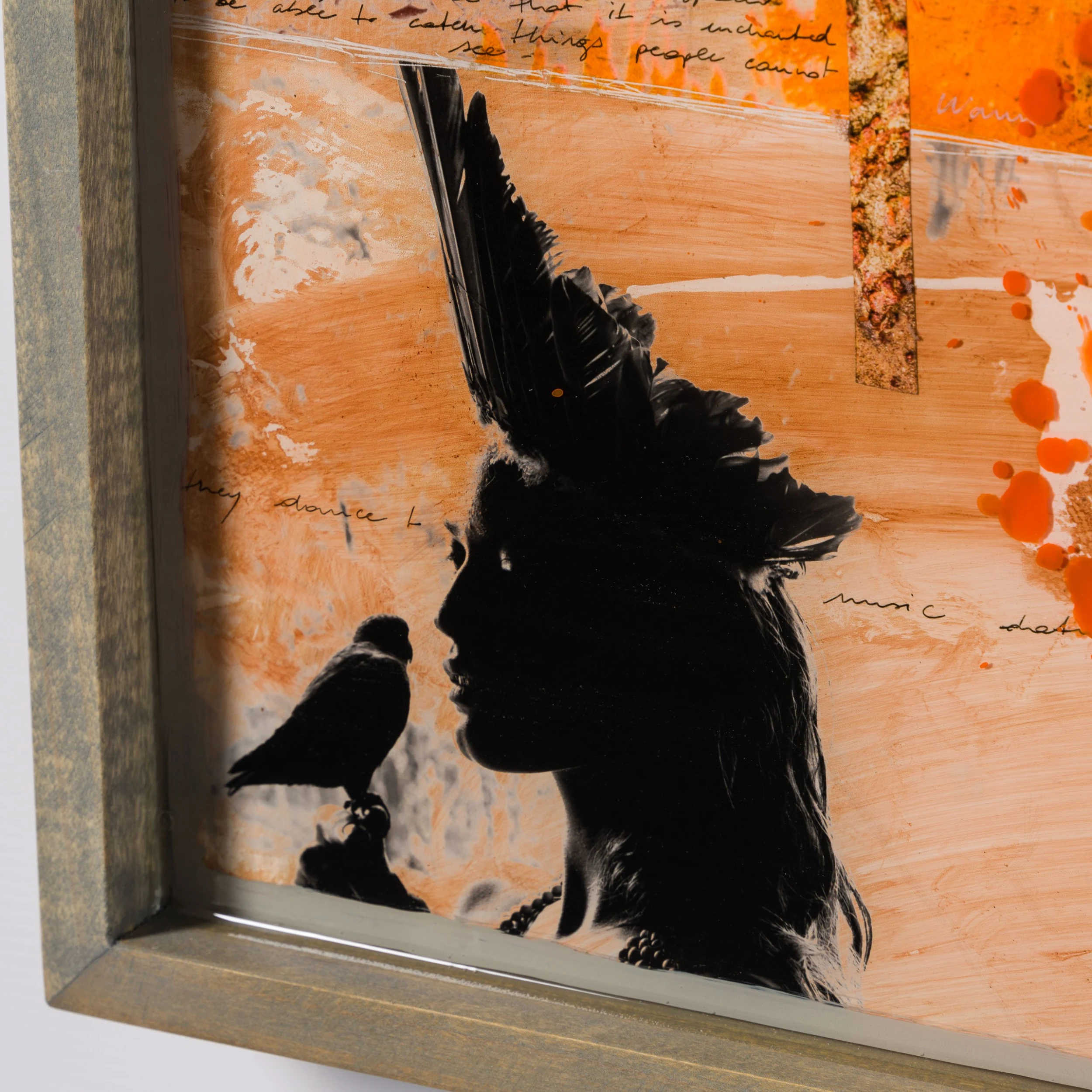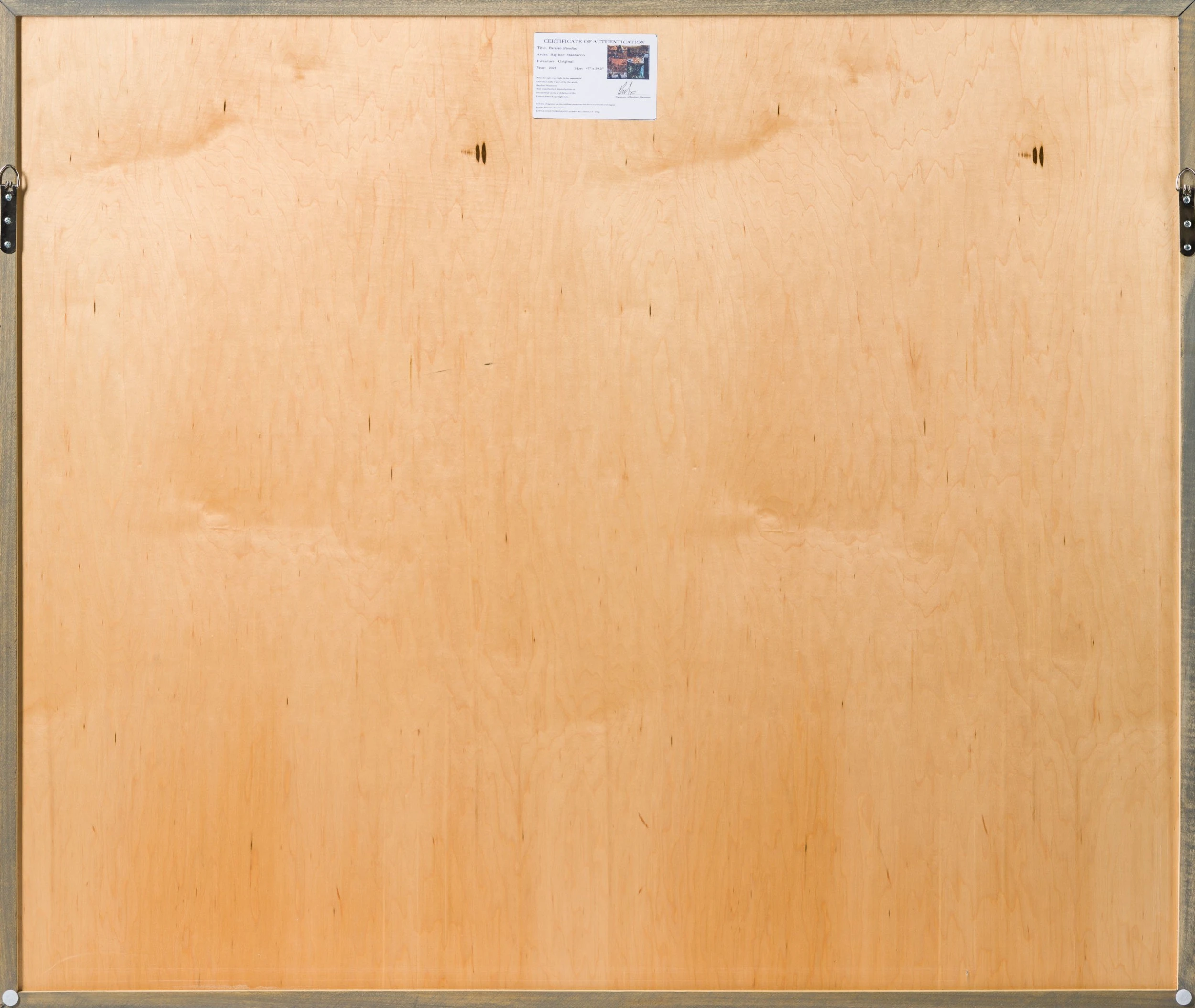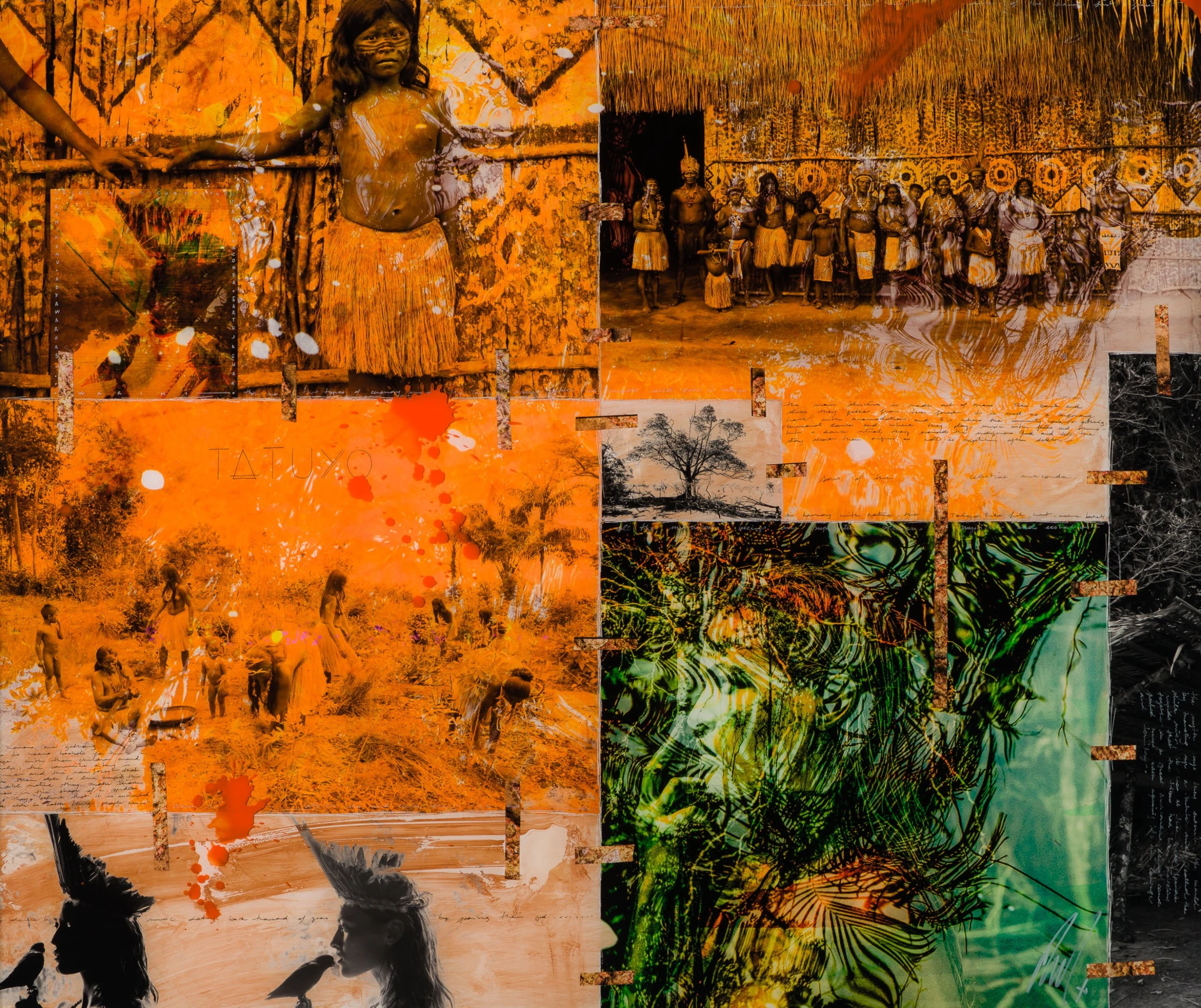 With Moroccan pigments and Vietnamese paints, Mazzucco’s pieces are characterised by the juxtaposition between wildlife and cultural photography, this incredible piece forms part of his introspective collection Grass Roots 2023. “Paraíso (Paradise)” tells a story in layers. The overlaying of photography, paint, handwriting, and resin adds life into the composition, creating a statement original. The pops of colour added sporadically throughout the composition create the spontaneous dynamic that this wildlife piece represents. The use of different images sizes and its repetition create the intrinsic depth, characteristic of Mazzucco’s originals.
