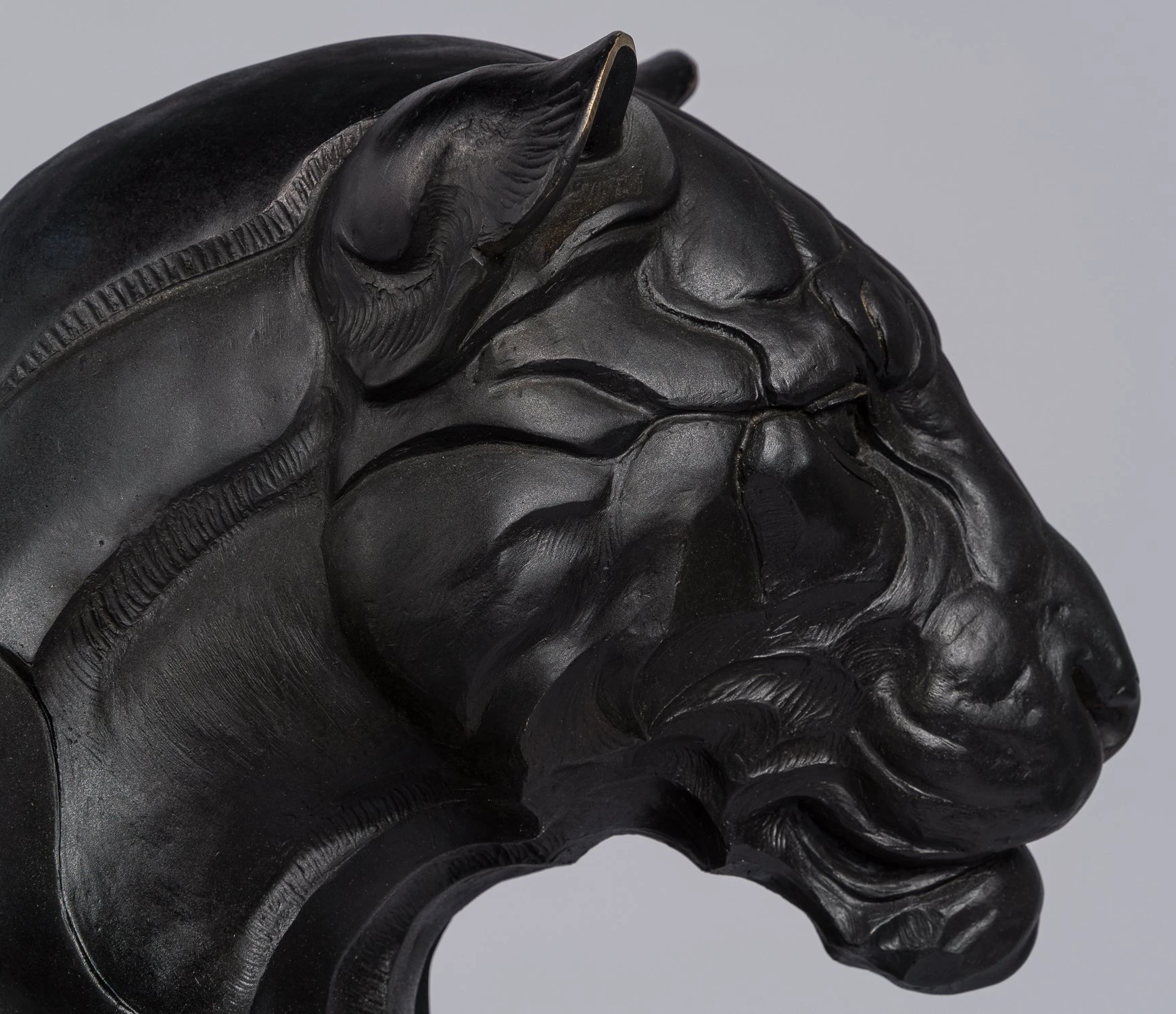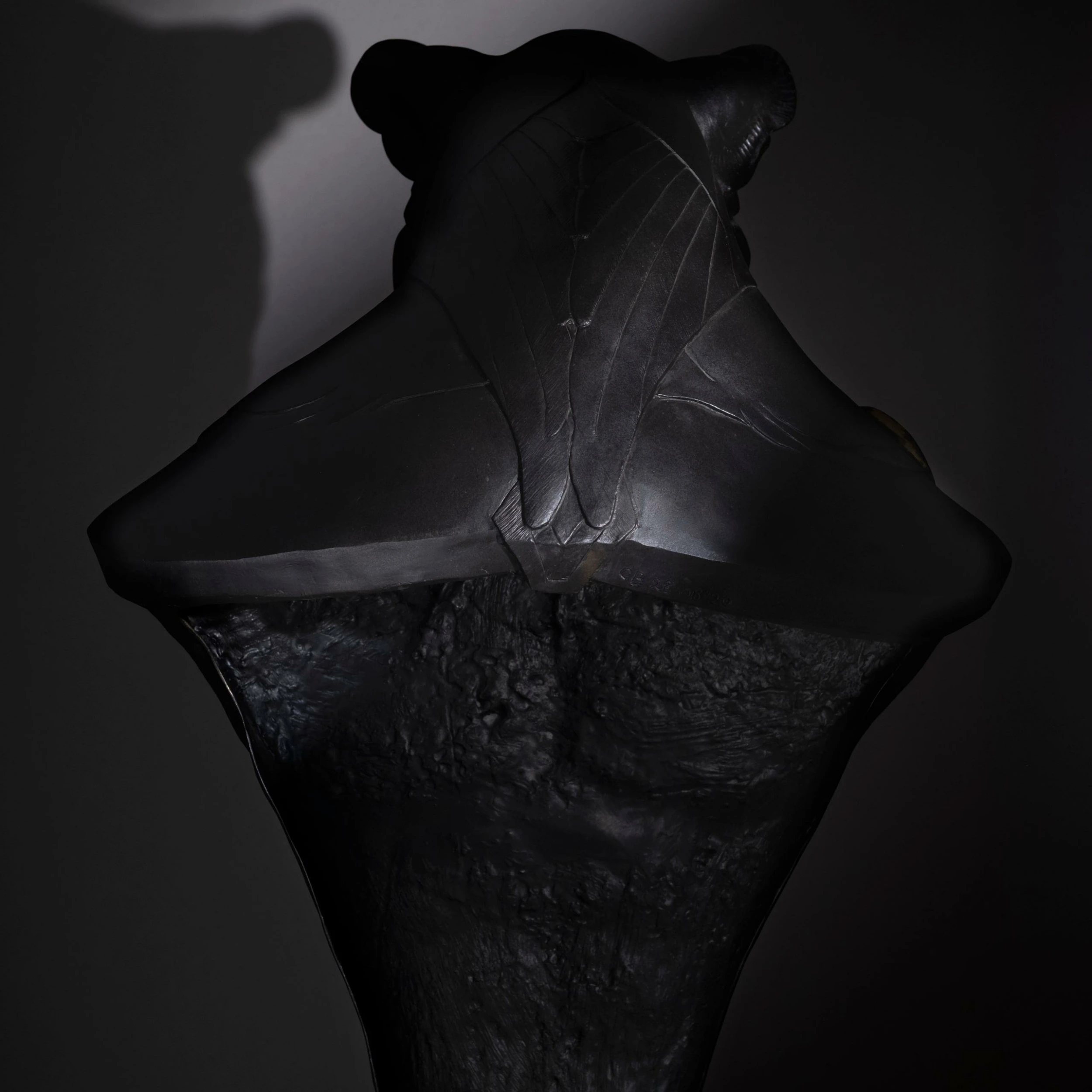 The artist’s travels have fostered an interest in mythology from around the world including Greek, Persian, Middle Eastern and beyond. In many of these cultures, animals are synonymous with aspects of mythology and can be seen in historic temples and depictions. Winterburn notes that in the past, realistic references for ferocious animals like panthers were not as readily available as they are today. Consequently, the depiction of animals in temples focuses on a sense of power and presence rather than realism. Not only did this influence the sculptural form and composition of Winterburn’s piece but also the tribal decoration on the collar. The inspiration for these designs comes from his exploration of temples and also his love of tattoos as a visual language that can reference ancient imagery from Celtic, Middle Eastern, and Sanskrit cultures.