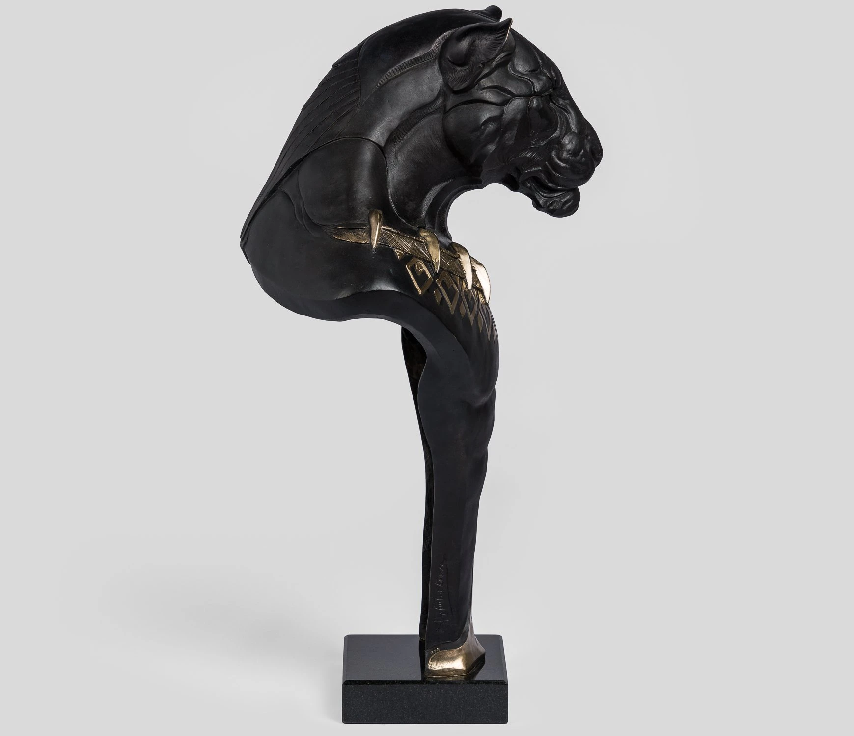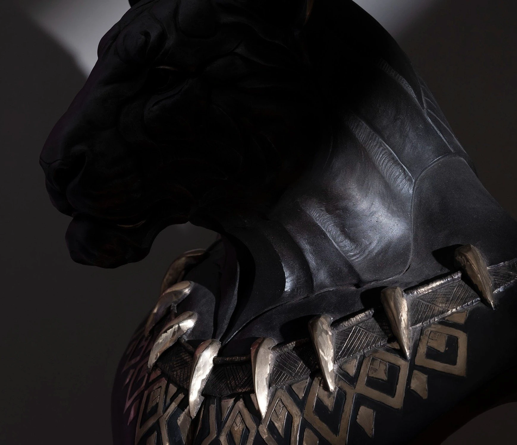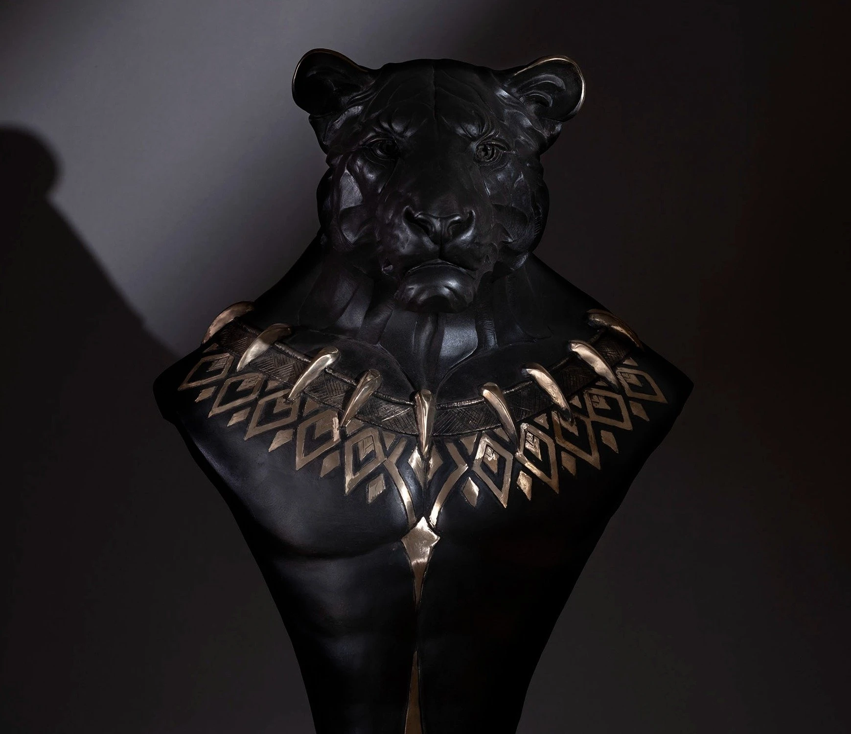 Established wildlife sculptor Steve Winterburn did not set out to create a sculpture inspired by the famous Marvel superhero Black Panther, yet his travels and research in South Africa led to the creation of an anthropomorphic panther who wore a bone necklace much like those worn by the tribes he encountered. The resulting reaction from Steve’s collectors over the undeniable resemblance to the Marvel character led to the creation of this collection; however, the signs, symbols and animal behind this artwork go further than any comic book references.