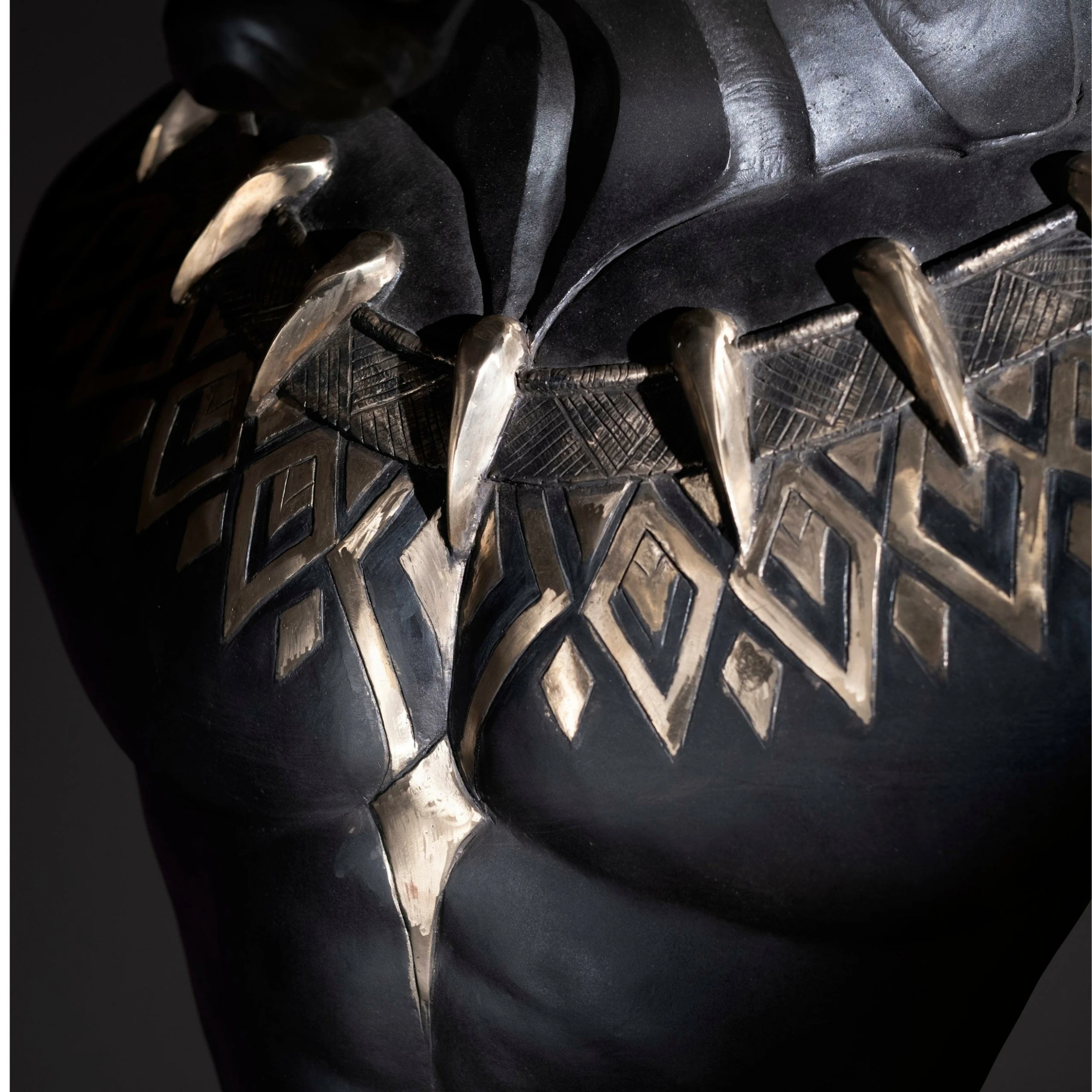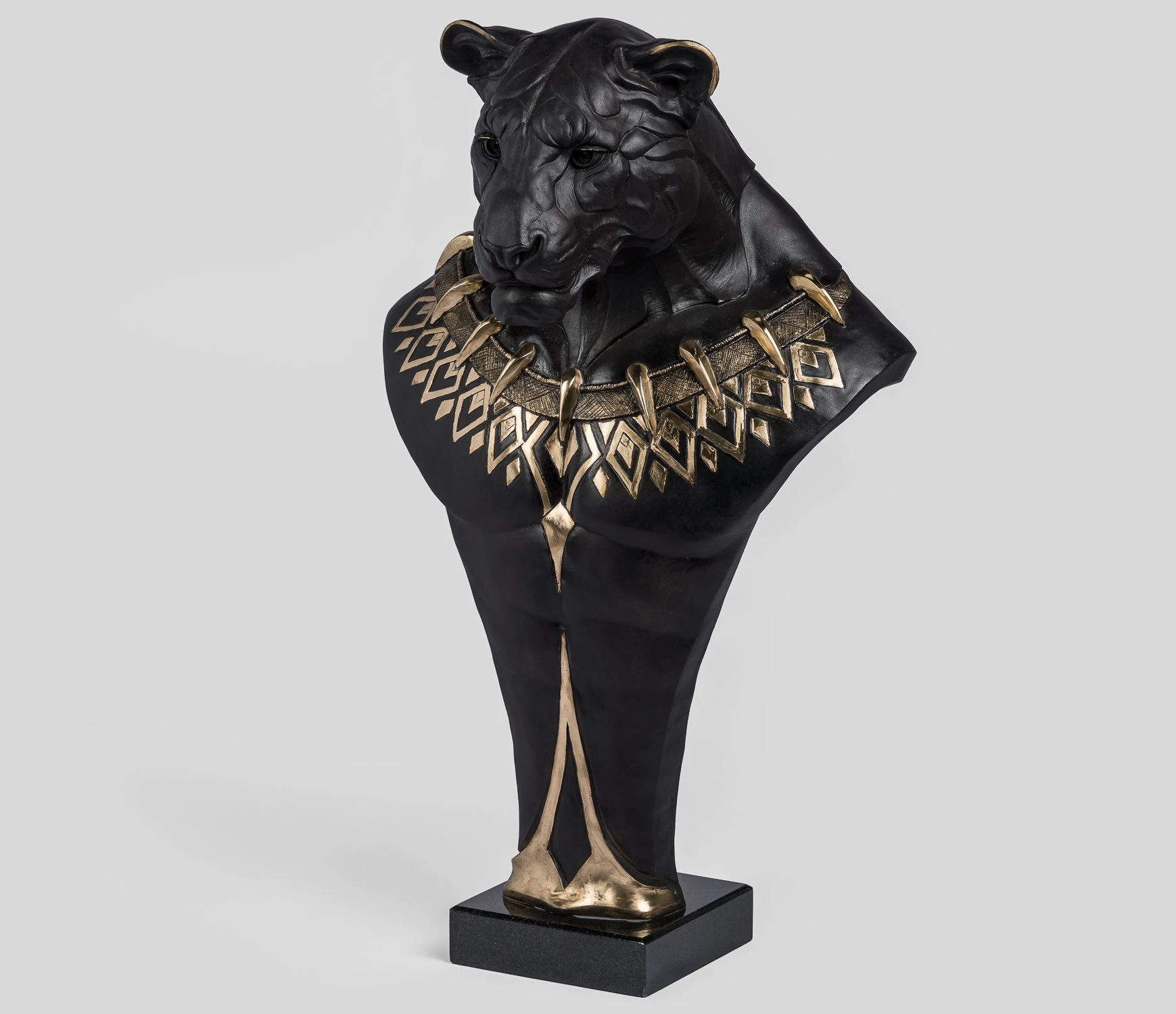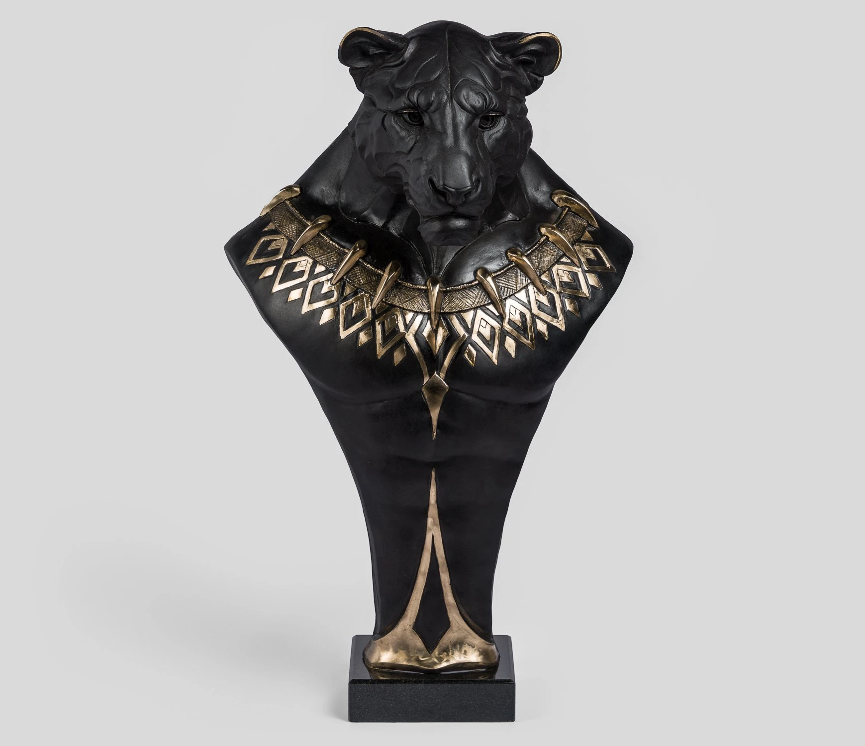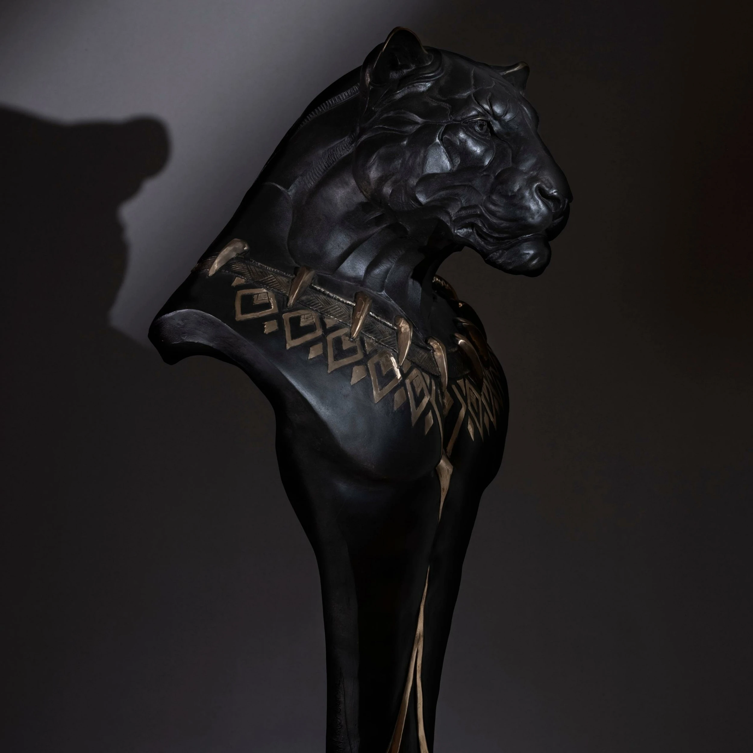 Established wildlife sculptor Steve Winterburn did not set out to create a sculpture inspired by the famous Marvel superhero Black Panther, yet his travels and research in South Africa led to the creation of an anthropomorphic panther who wore a bone necklace much like those worn by the tribes he encountered. The resulting reaction from Steve’s collectors over the undeniable resemblance to the Marvel character led to the creation of this collection; however, the signs, symbols and animal behind this artwork go further than any comic book references.