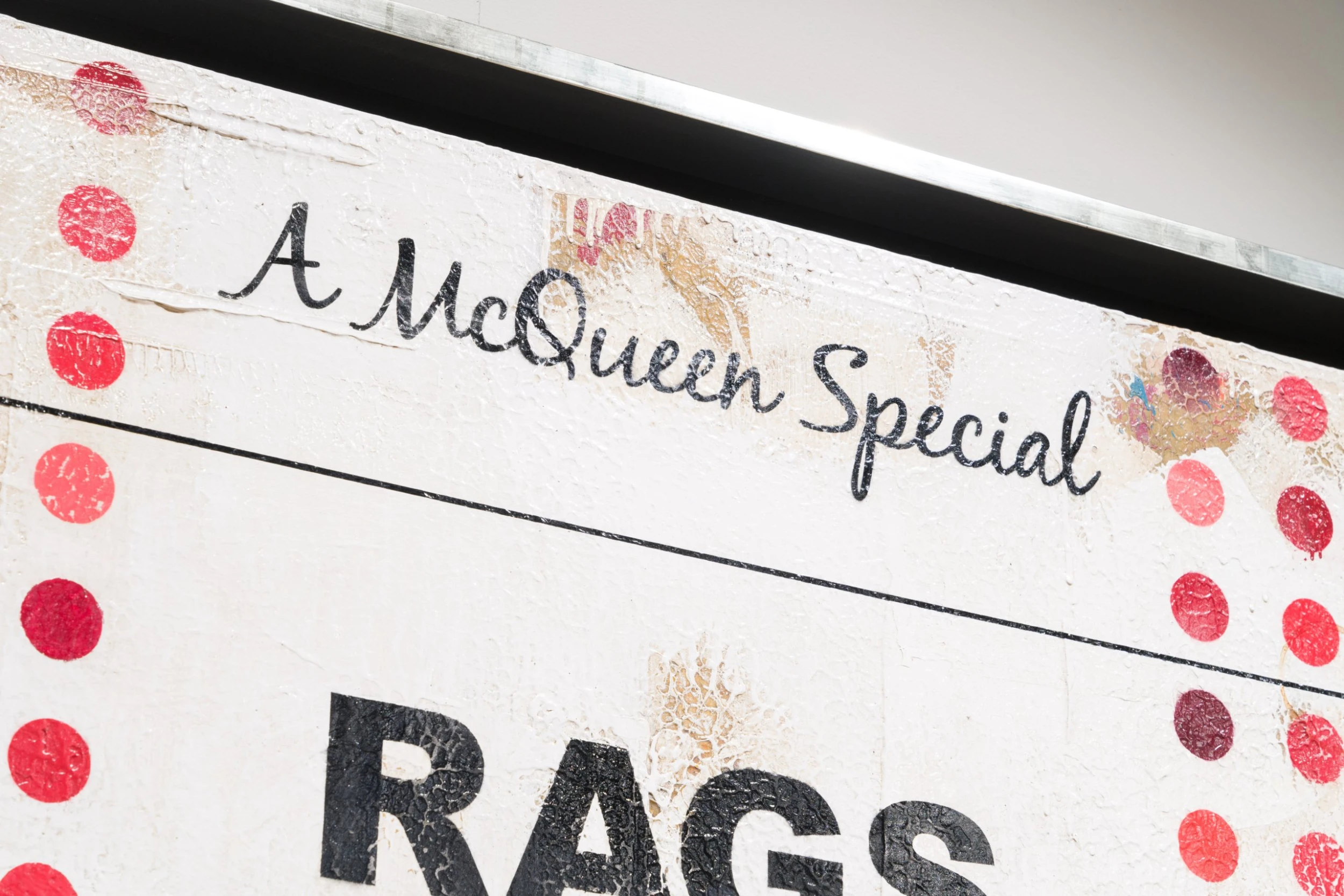 McQueen’s technique is a process of layering the canvas with an abundant application of paint in a number of colours and shades before, once dry, he sands the work down so that a multitude of layers are visible in the finished piece. Finally, the surface is covered with lacquer to add extra richness and vibrancy. His complex use of paint elevates his art beyond the mere imitation of a nostalgic object towards an art that is rich and expressive.