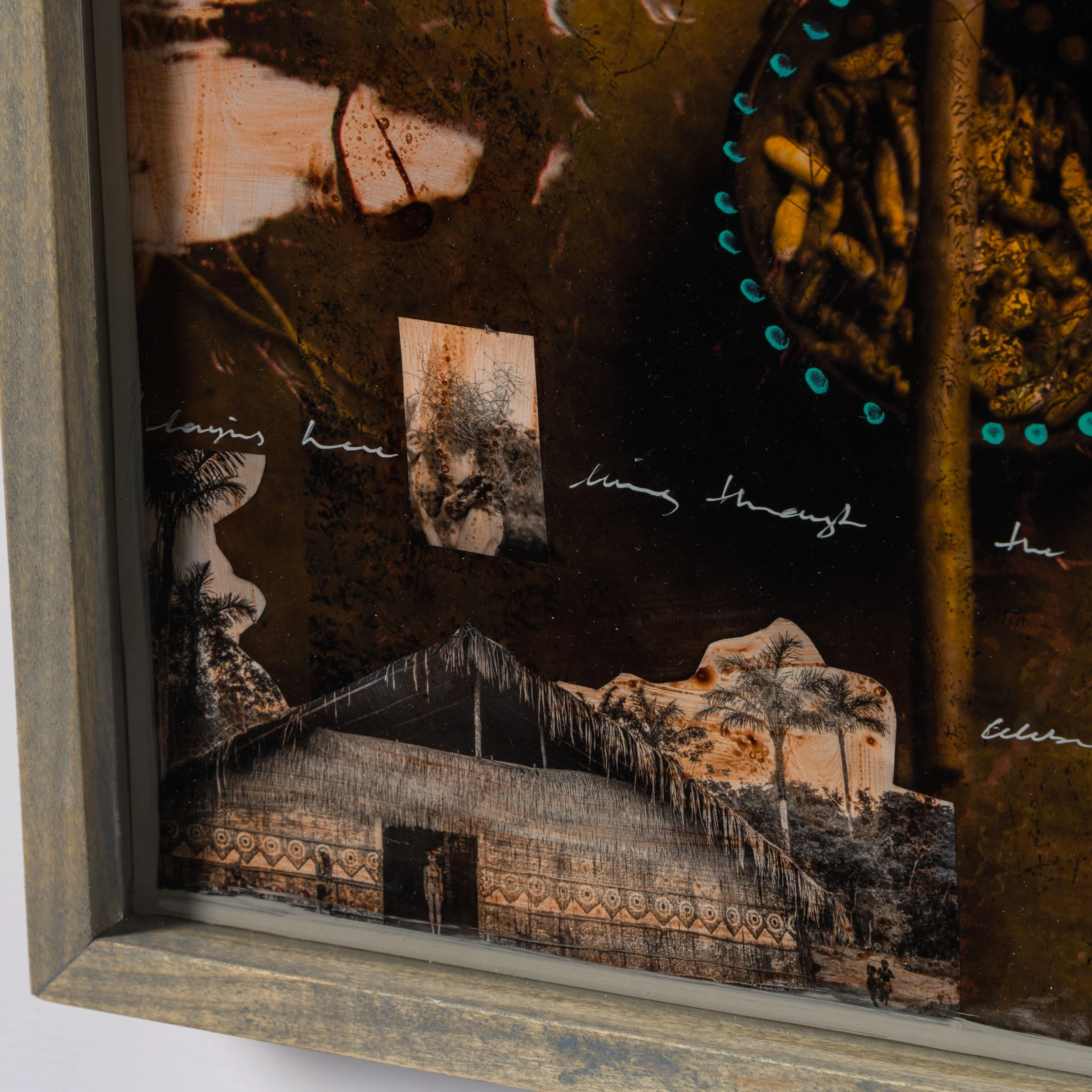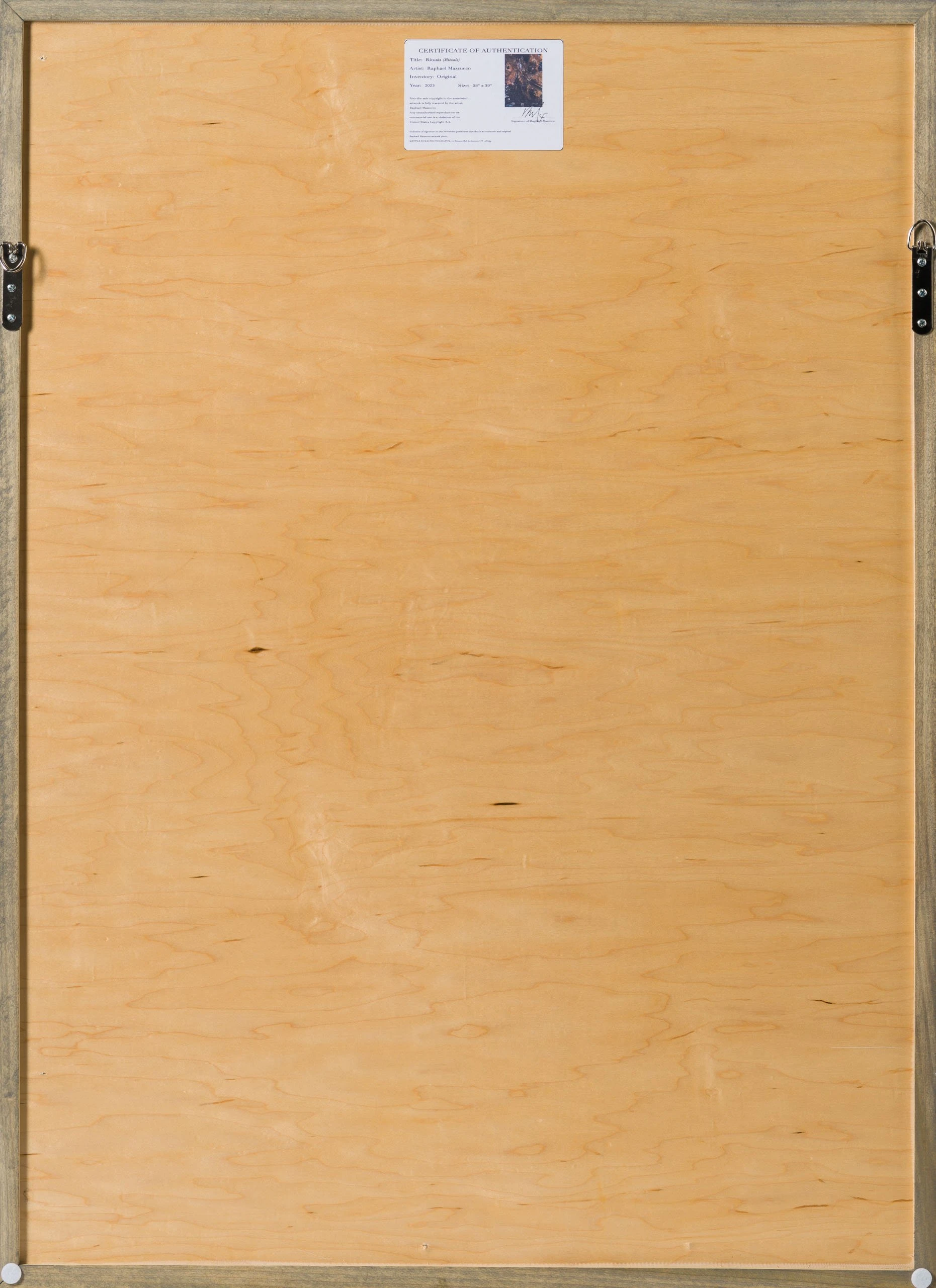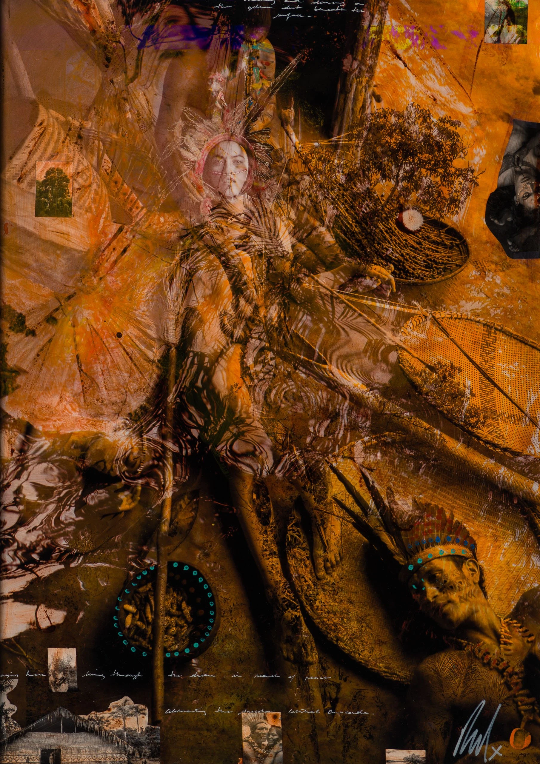 With Moroccan pigments and Vietnamese paints, Mazzucco’s pieces are characterised by the juxtaposition between wildlife and cultural photography, this incredible piece forms part of his introspective collection Grass Roots 2023. “Rituais (Rituals)” mainly in sepia earthy tones, enhancing the raw beauty of the images. The piece tells a story in layers. The overlaying of photography, paint, and resin adds life into the composition, creating a statement original.