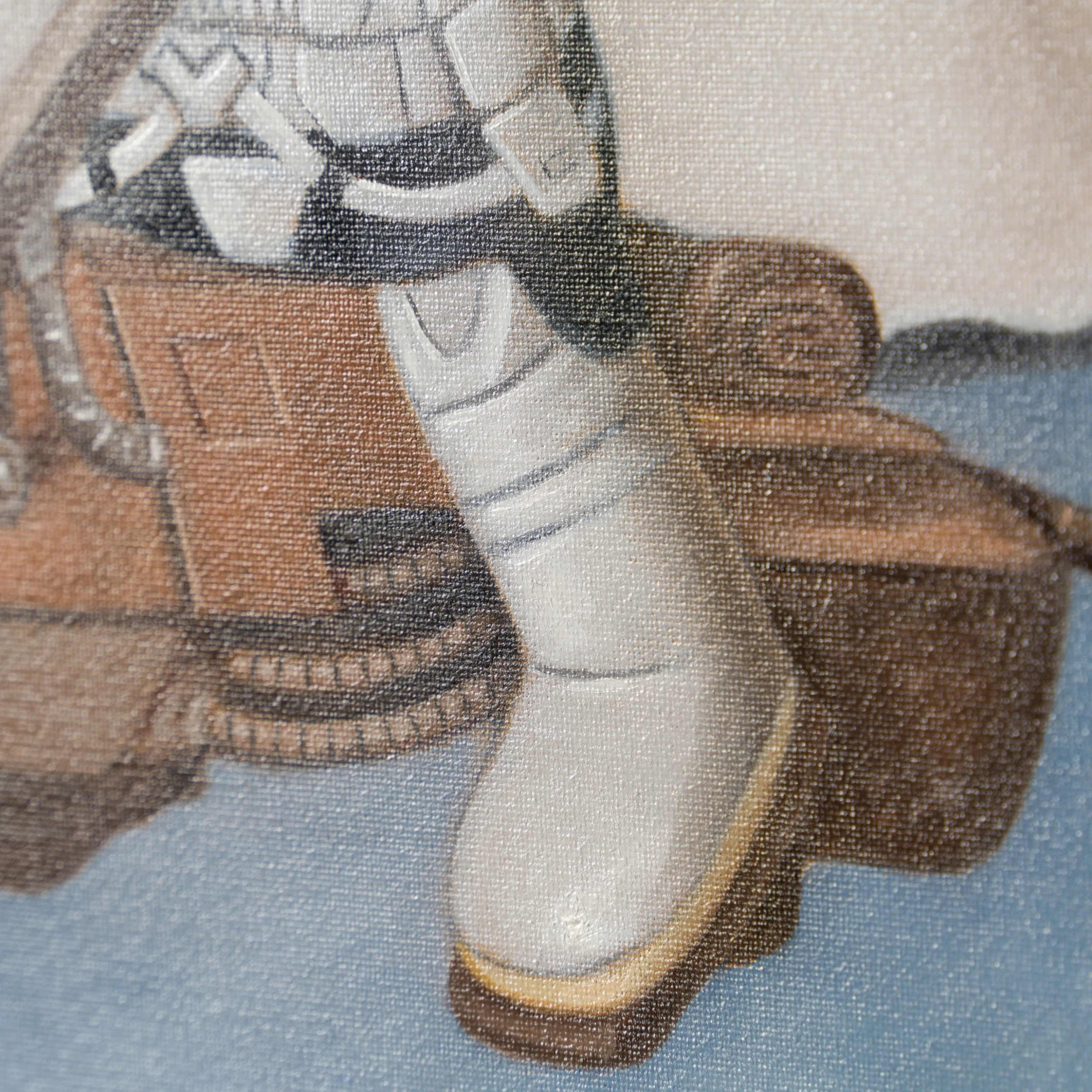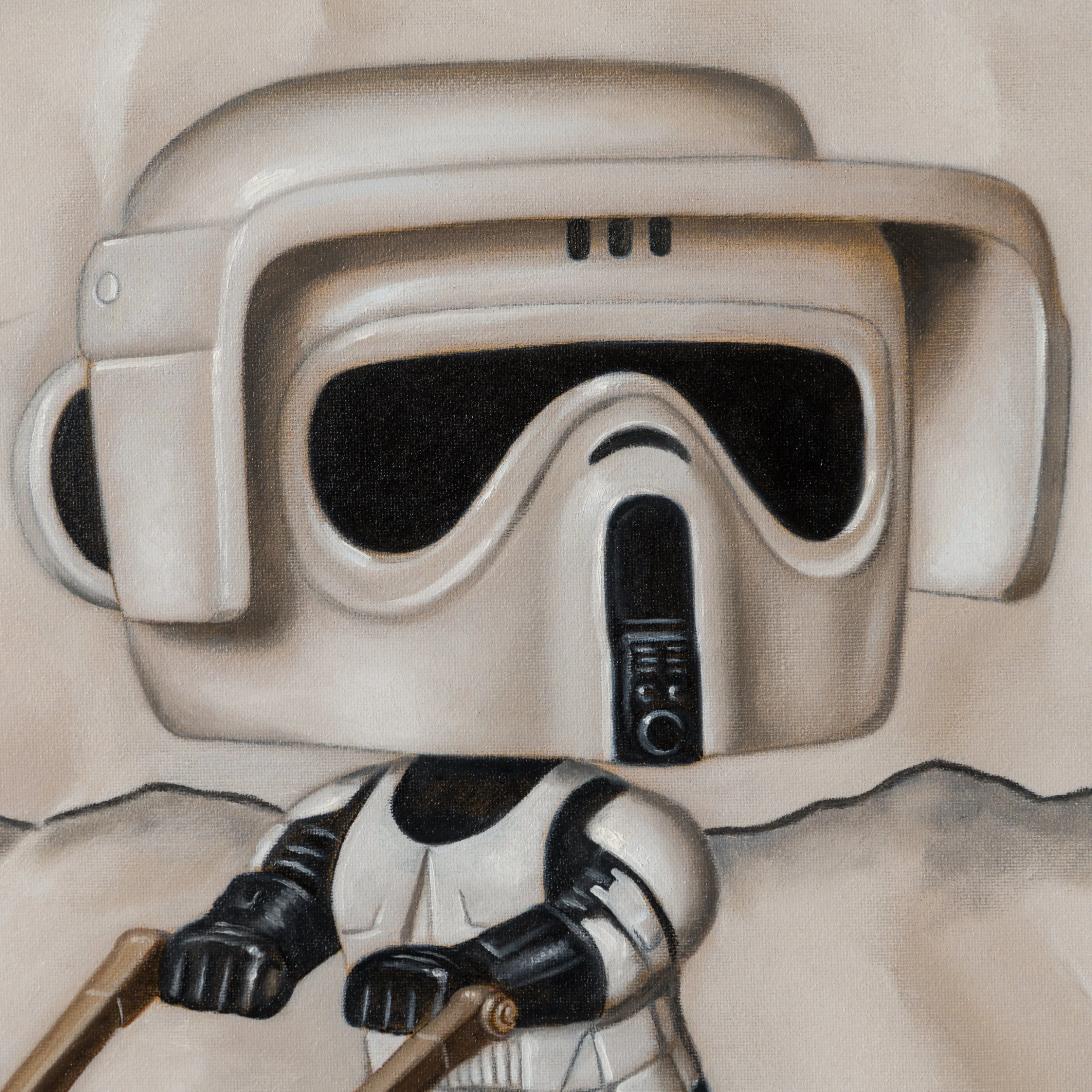 In this feisty original oil on board by Nigel Humphries, we see one of the world’s most iconic bad guys rendered in an extra-ordinarily adorable way. You can almost hear the Stormtroopers race through the forests of Endor atop their speeder bikes depicted here against a dual toned background that accentuates the monochromatic colour of their armour.