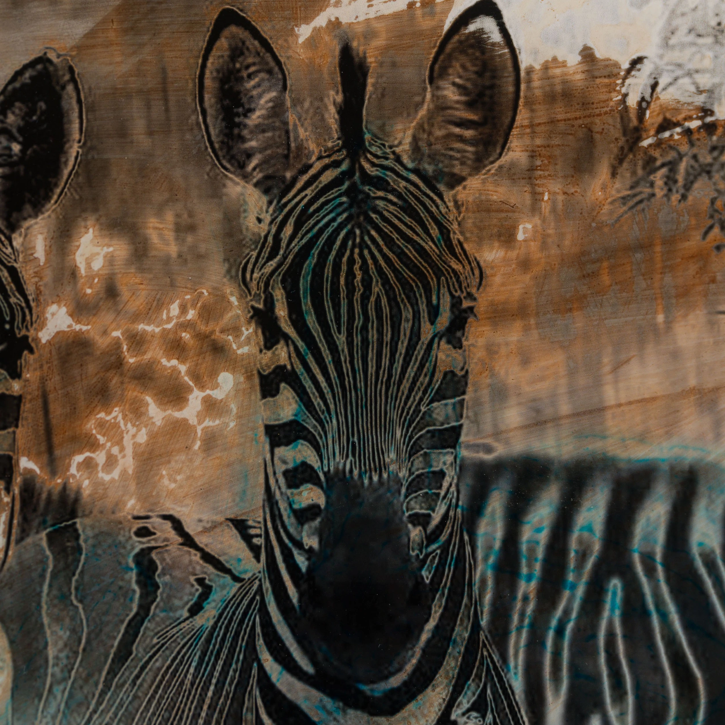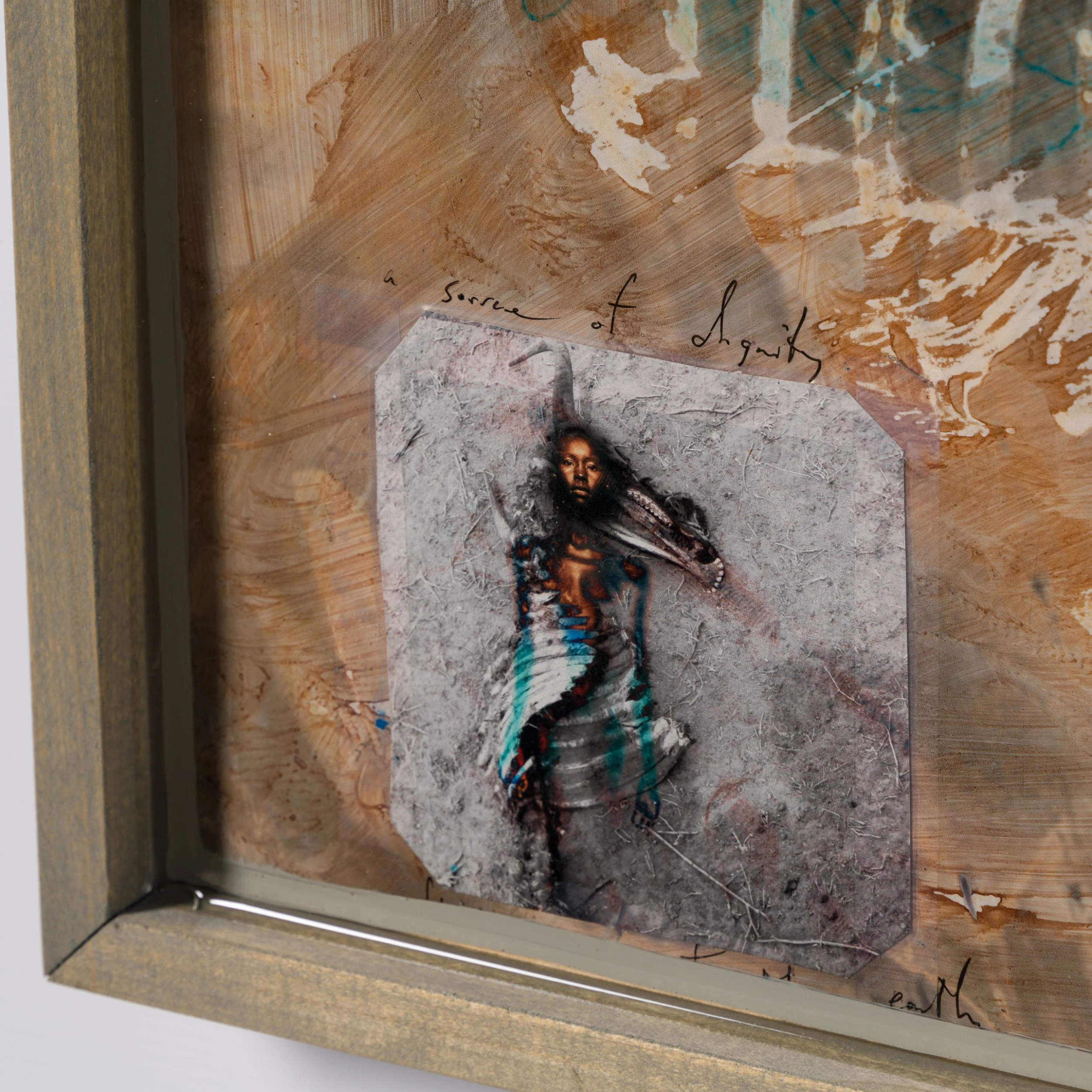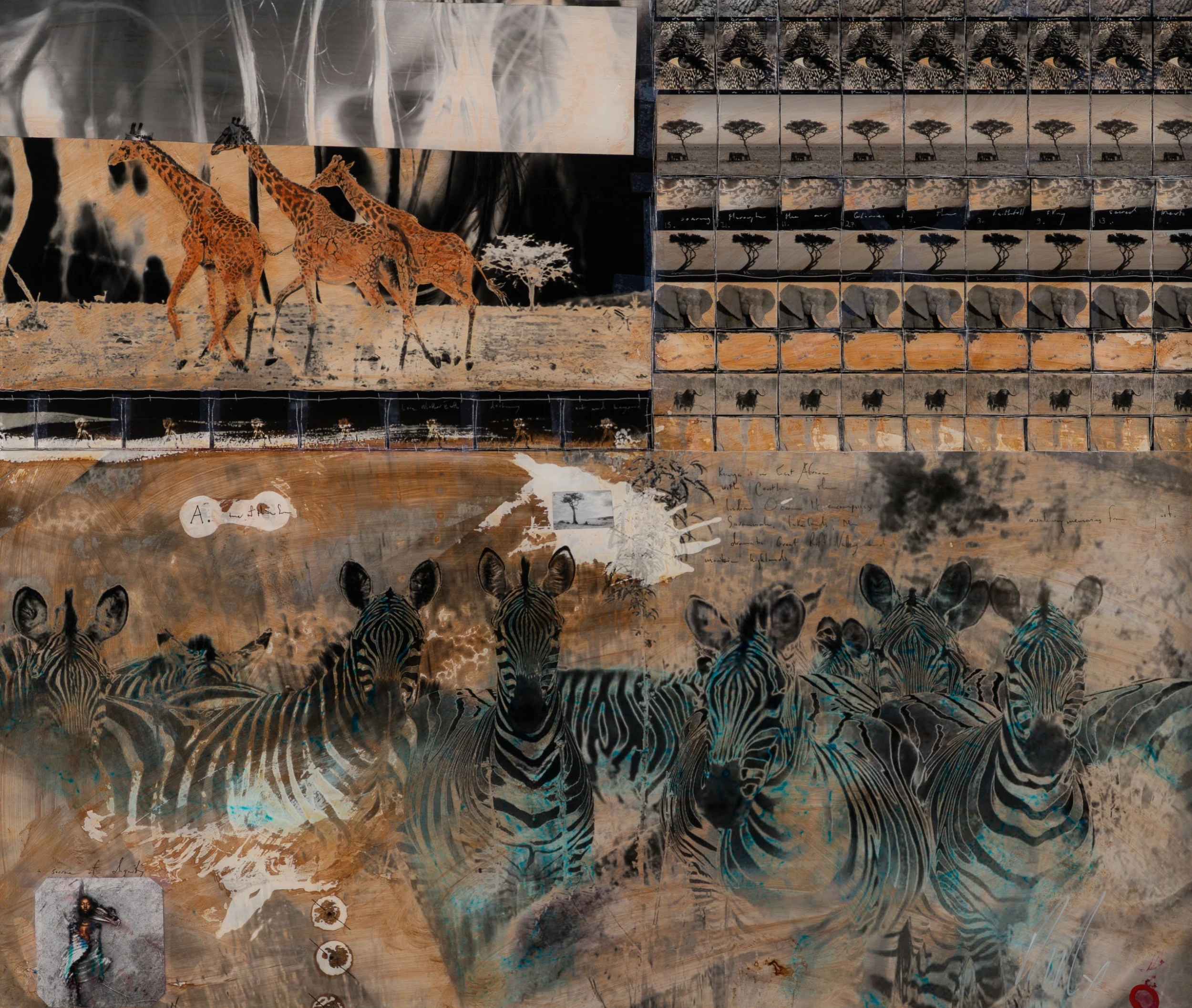 With Moroccan pigments and Vietnamese paints, Mazzucco’s pieces are characterised by the juxtaposition between wildlife and cultural photography, this incredible piece forms part of his introspective collection Grass Roots 2023. “Shahidi (Witness)” features photography taken in Kenya, Africa mainly in sepia earthy tones, enhancing the raw beauty of the images. The piece tells a story in layers. The overlaying of photography, paint, handwriting, and resin adds life into the composition, creating a statement original. The pops of colour added sporadically throughout the composition create the spontaneous dynamic that this wildlife piece represents. The use of different images sizes and its repetition create the intrinsic depth, characteristic of Mazzucco’s originals.