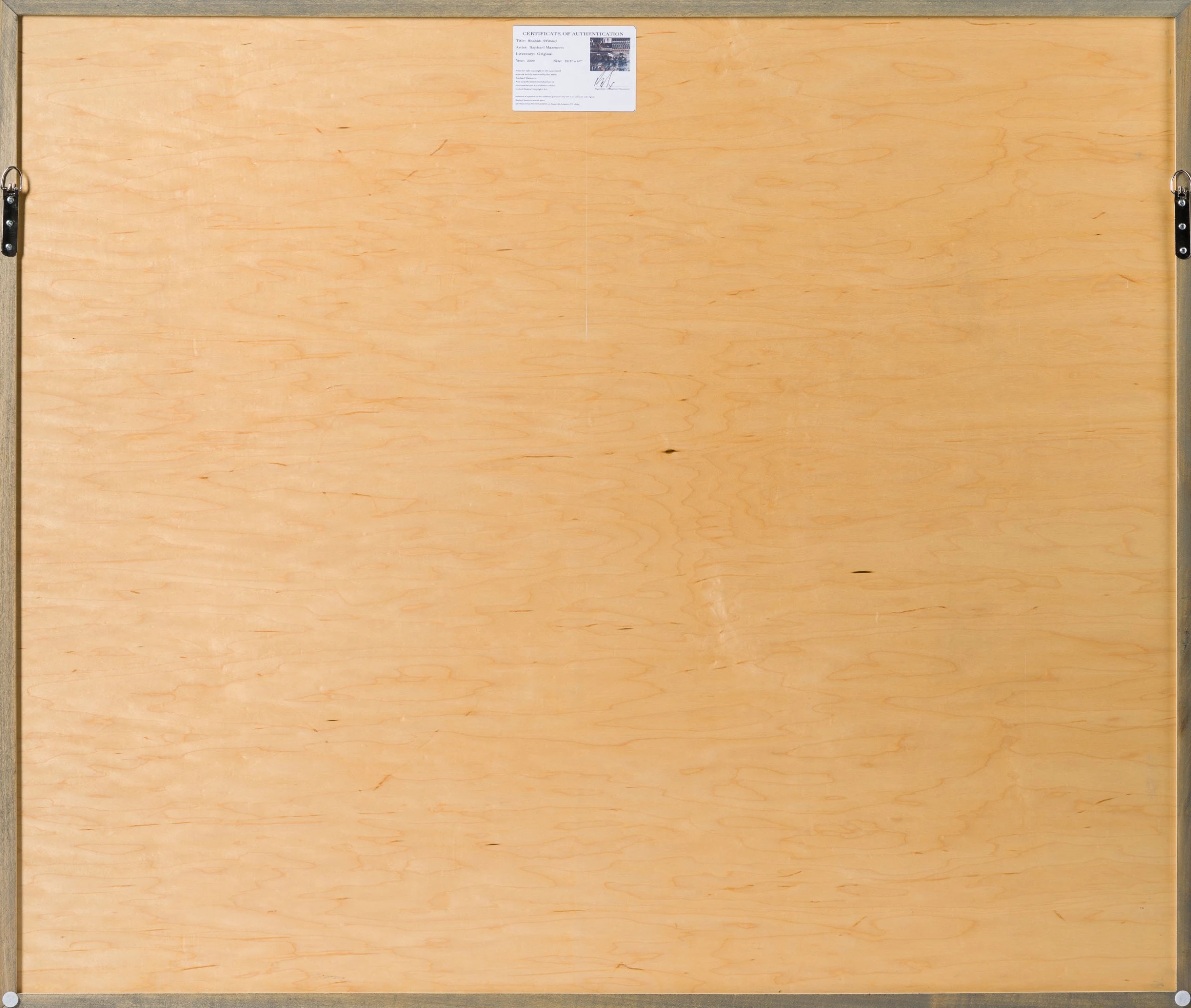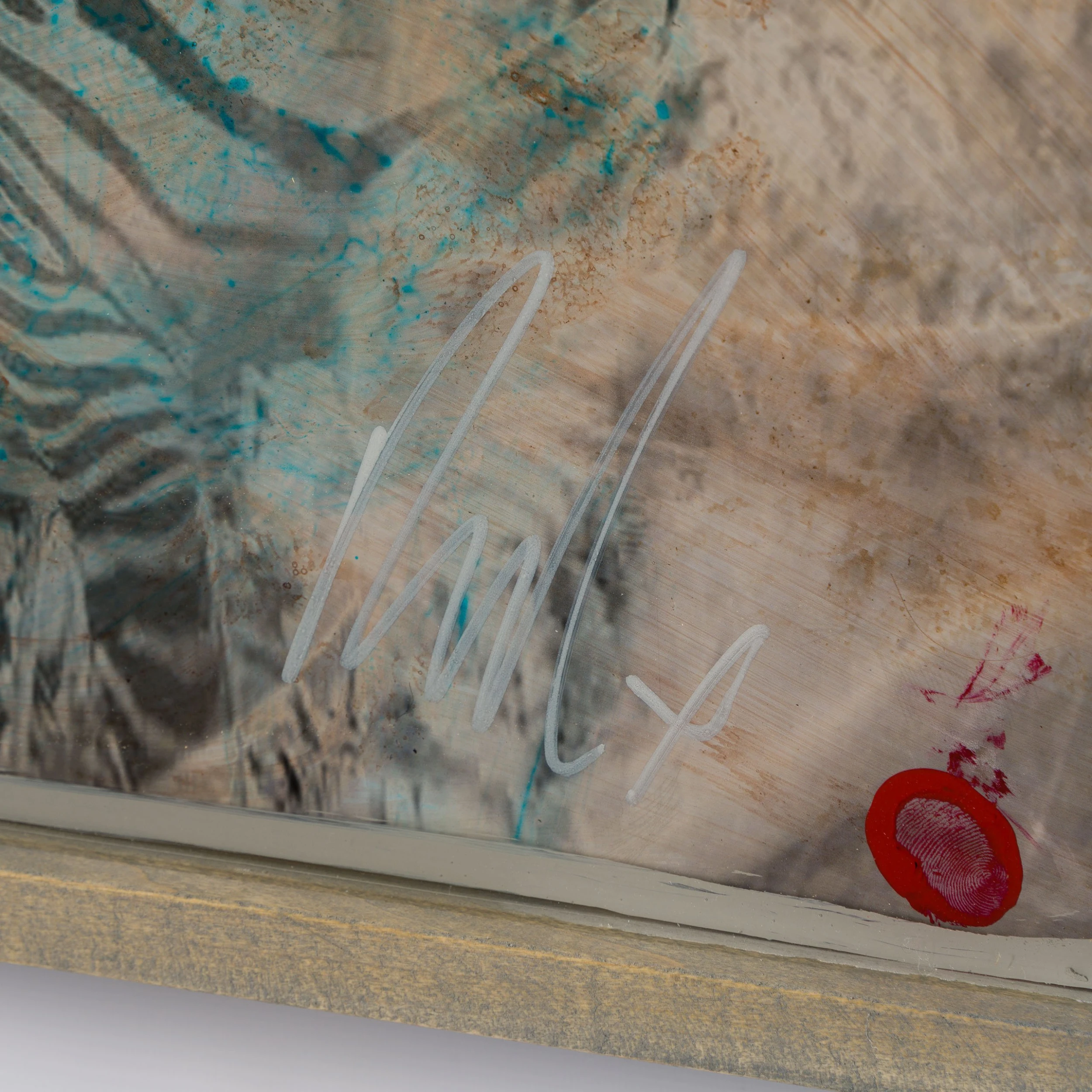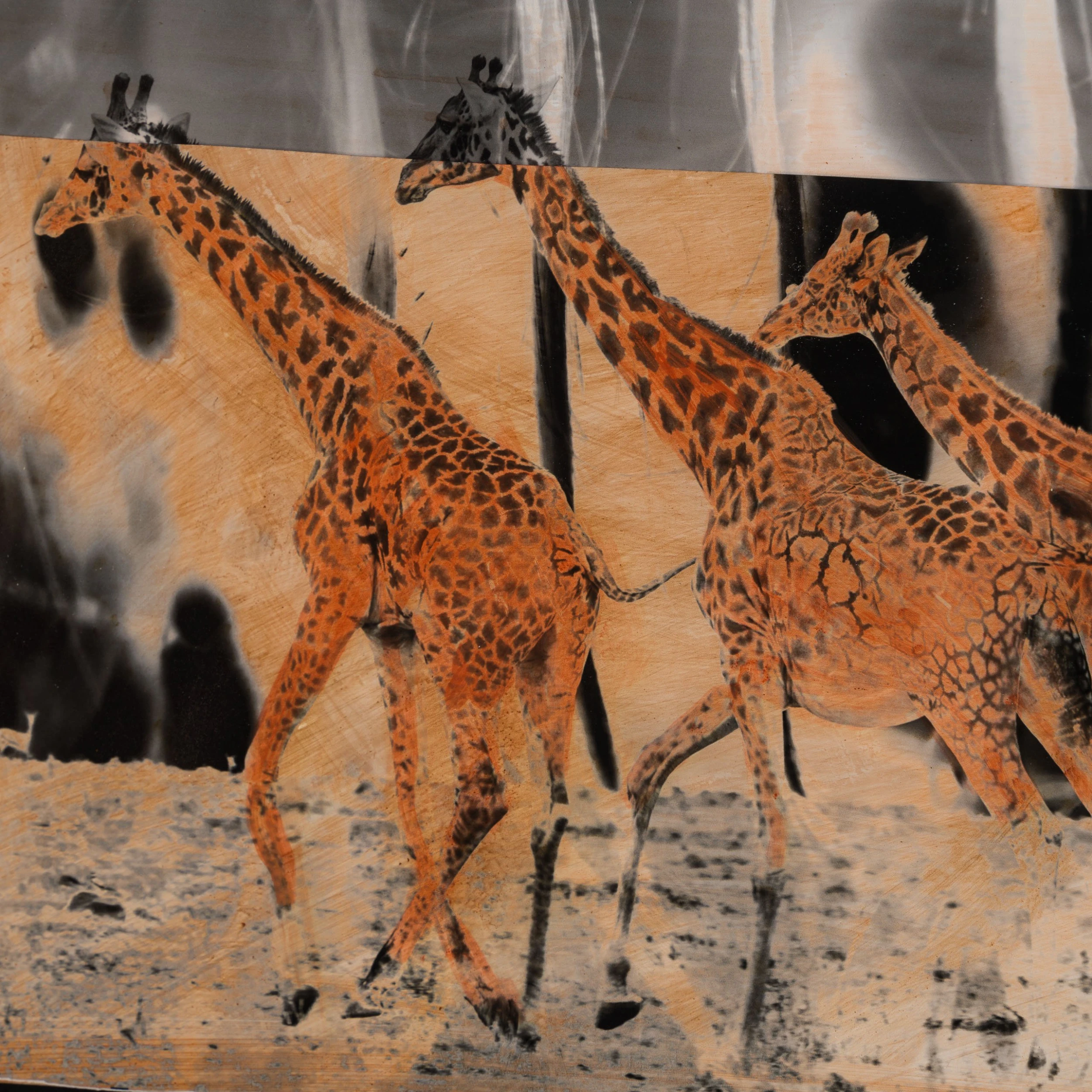 With Moroccan pigments and Vietnamese paints, Mazzucco’s pieces are characterised by the juxtaposition between wildlife and cultural photography, this incredible piece forms part of his introspective collection Grass Roots 2023. “Shahidi (Witness)” features photography taken in Kenya, Africa mainly in sepia earthy tones, enhancing the raw beauty of the images. The piece tells a story in layers. The overlaying of photography, paint, handwriting, and resin adds life into the composition, creating a statement original. The pops of colour added sporadically throughout the composition create the spontaneous dynamic that this wildlife piece represents. The use of different images sizes and its repetition create the intrinsic depth, characteristic of Mazzucco’s originals.