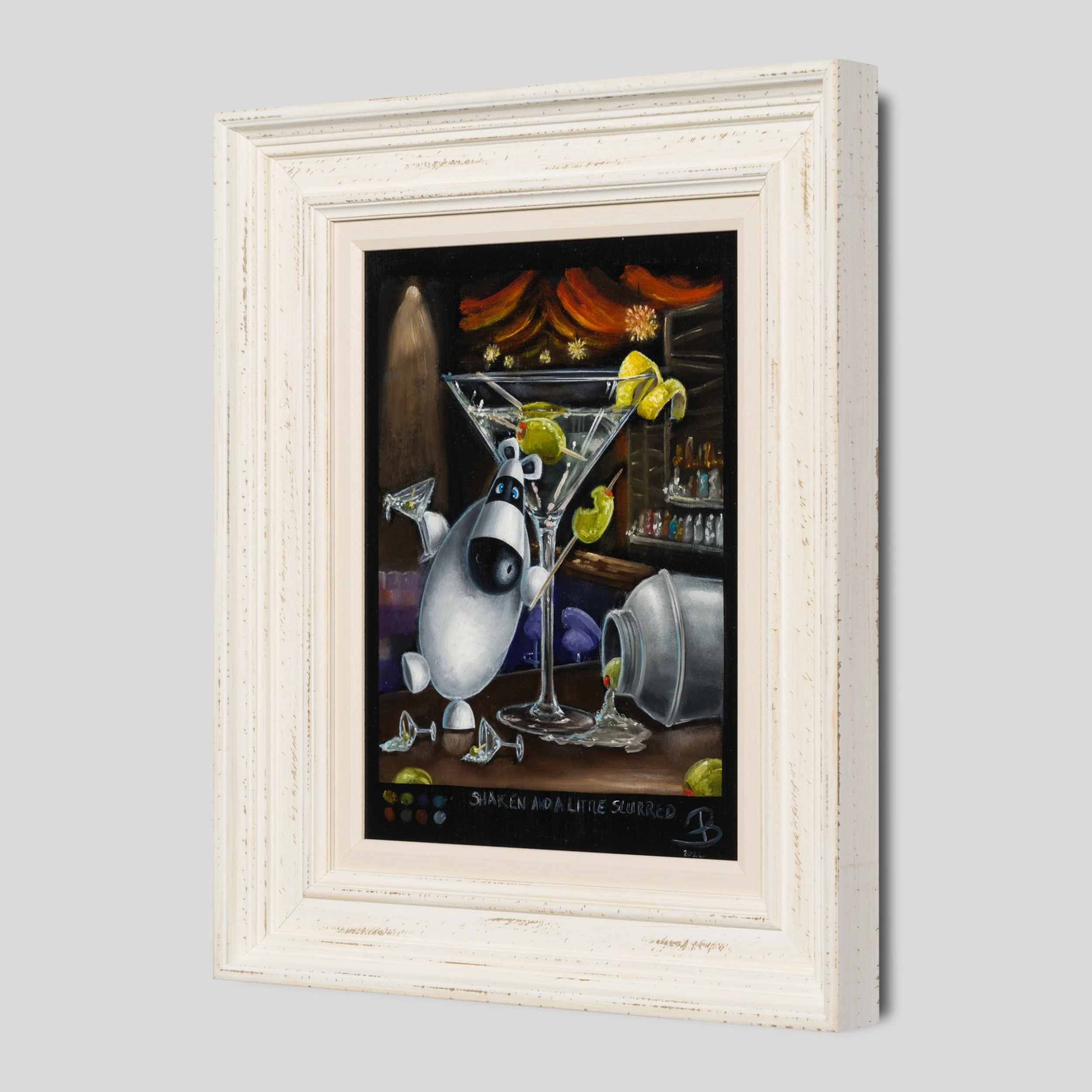 Bright and vivid colours pop out of a dark yet detailed background in this hilarious artwork by Peter and Jayne Smith. Part of their 2022 collection Ticklish Allsorts, here the artists playfully mix provocative themes with imagery of delectable delights and crafty cocktails to create a beautifully bonkers masterpiece.