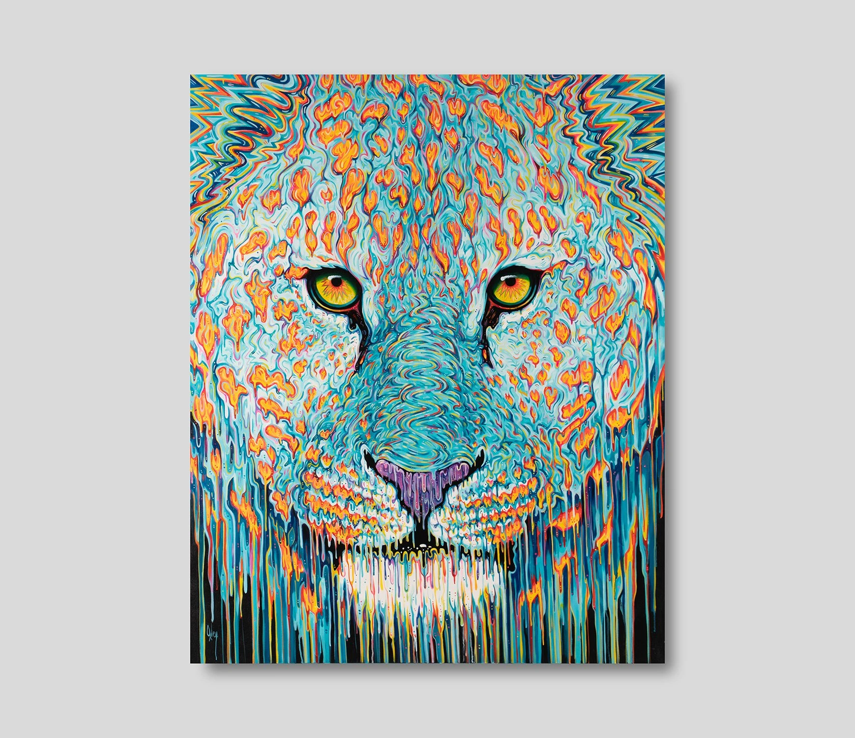 This 2022 installation of Robert Oxley’s fierce collection The Dark Knights sees the artist transform three big cats into ‘ethereal, astral’ beings through his kaleidoscopic use of colour and form. Inspired by mythology and Arthurian Legend, this original artwork harnesses the powerful image of a jaguar to create a poignant piece that comments on the simultaneous strength and vulnerability of some of our endangered species of big cat.