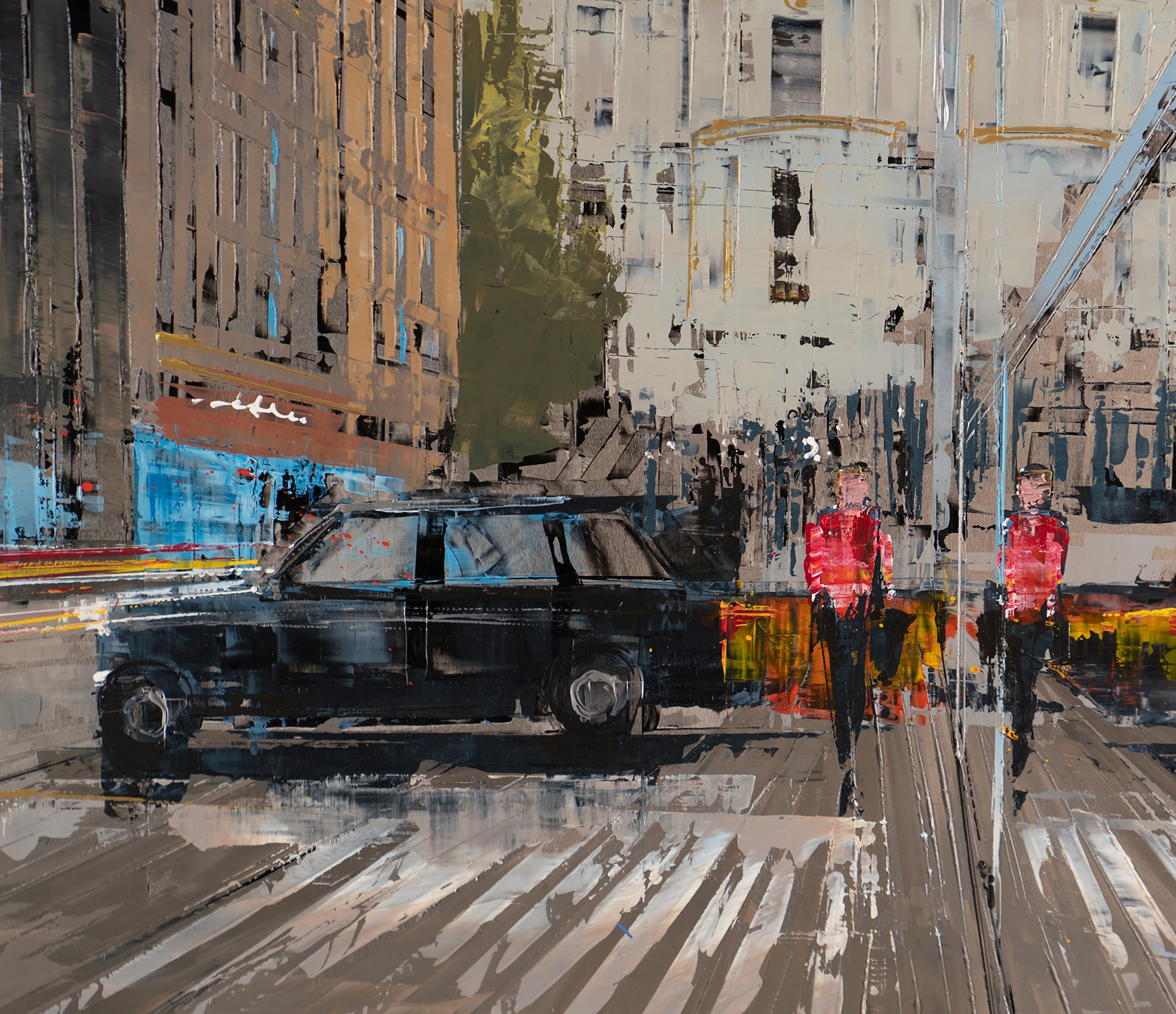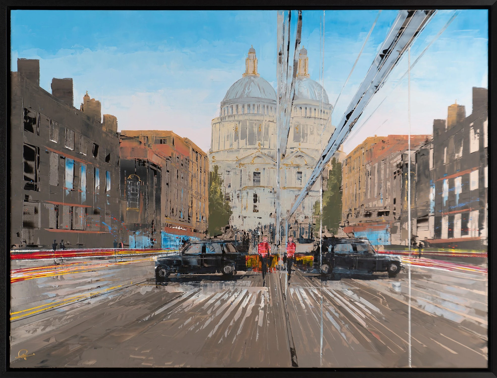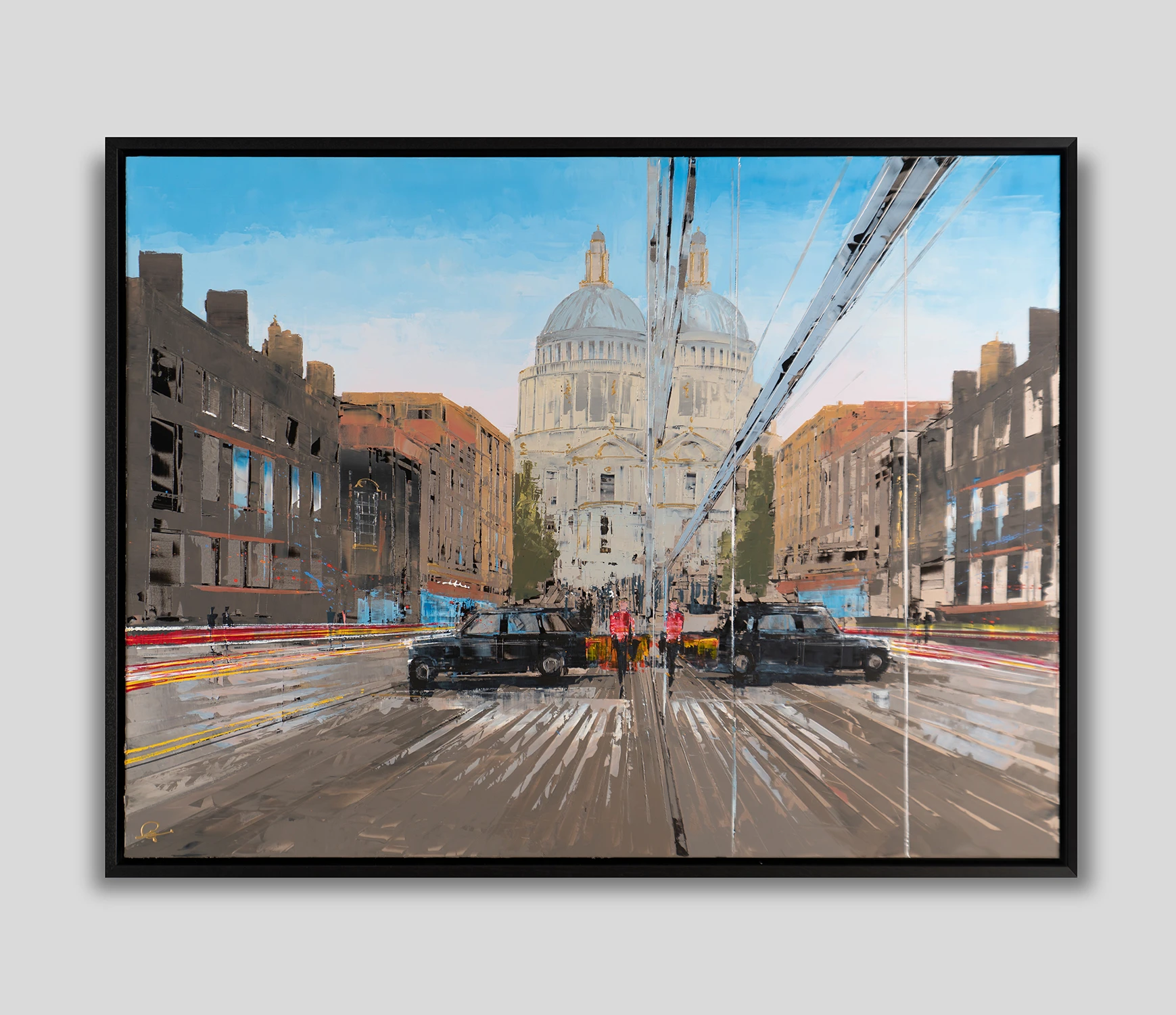 The genre of cityscapes in fine art was made famous by impressionist artists like Claude Monet and Camille Pissarro, although the genre can be traced back as early as the Middle Ages. Paul Kenton brings this genre into contemporary art through unconventional canvases, brushstrokes, tools and perspectives. The material of this artwork, for example, brings the bright and industrial nature of London to the forefront and creates a truly unique textured original artwork.