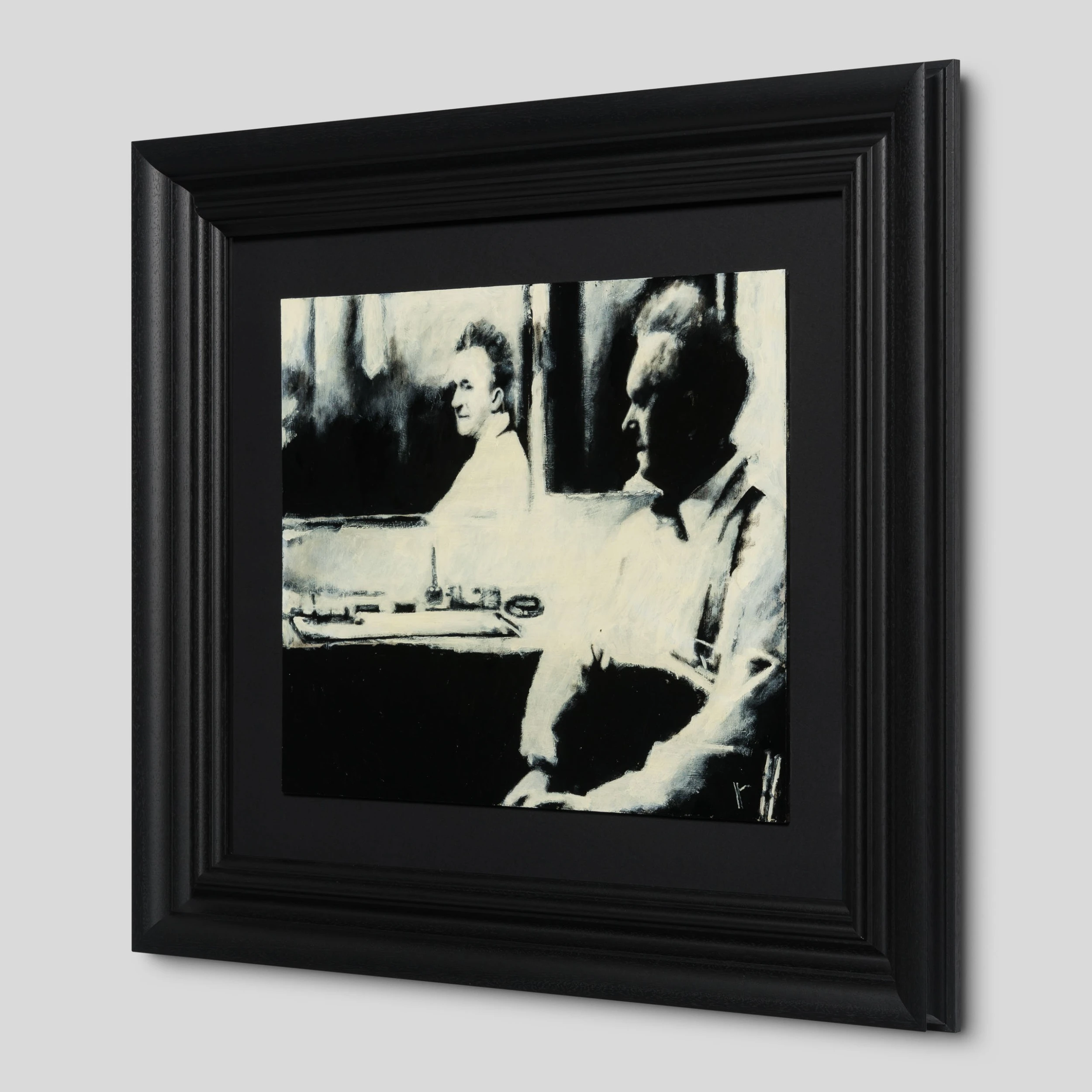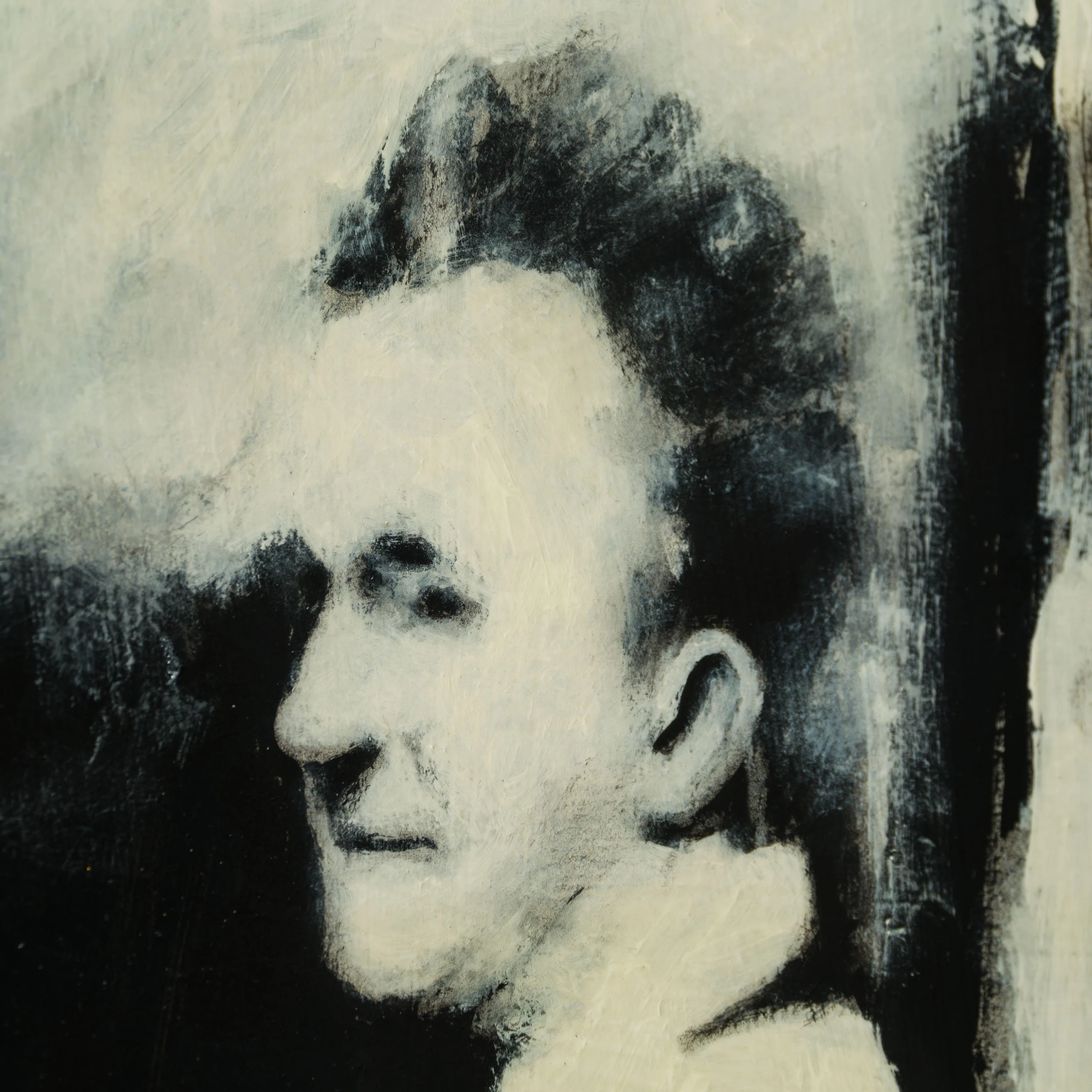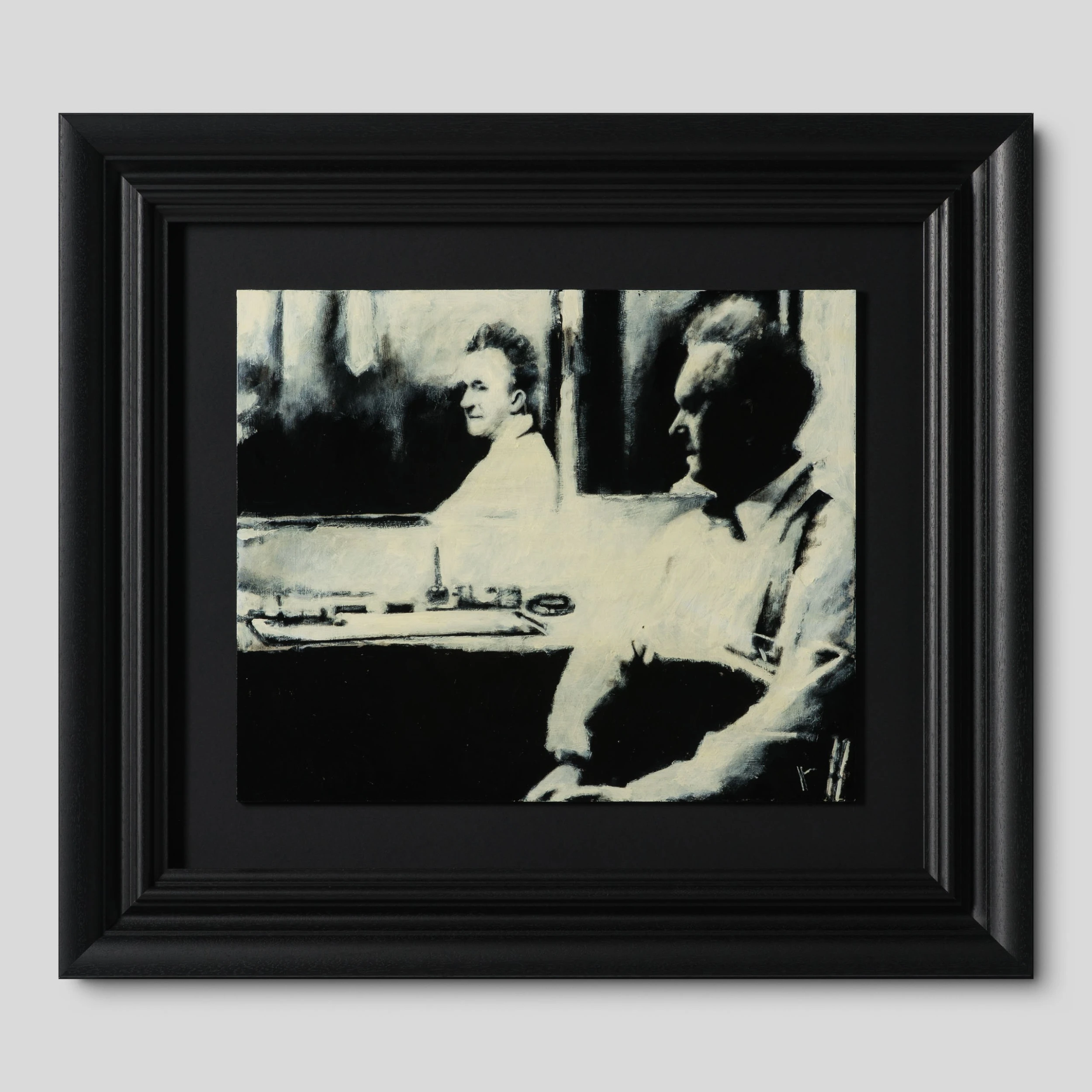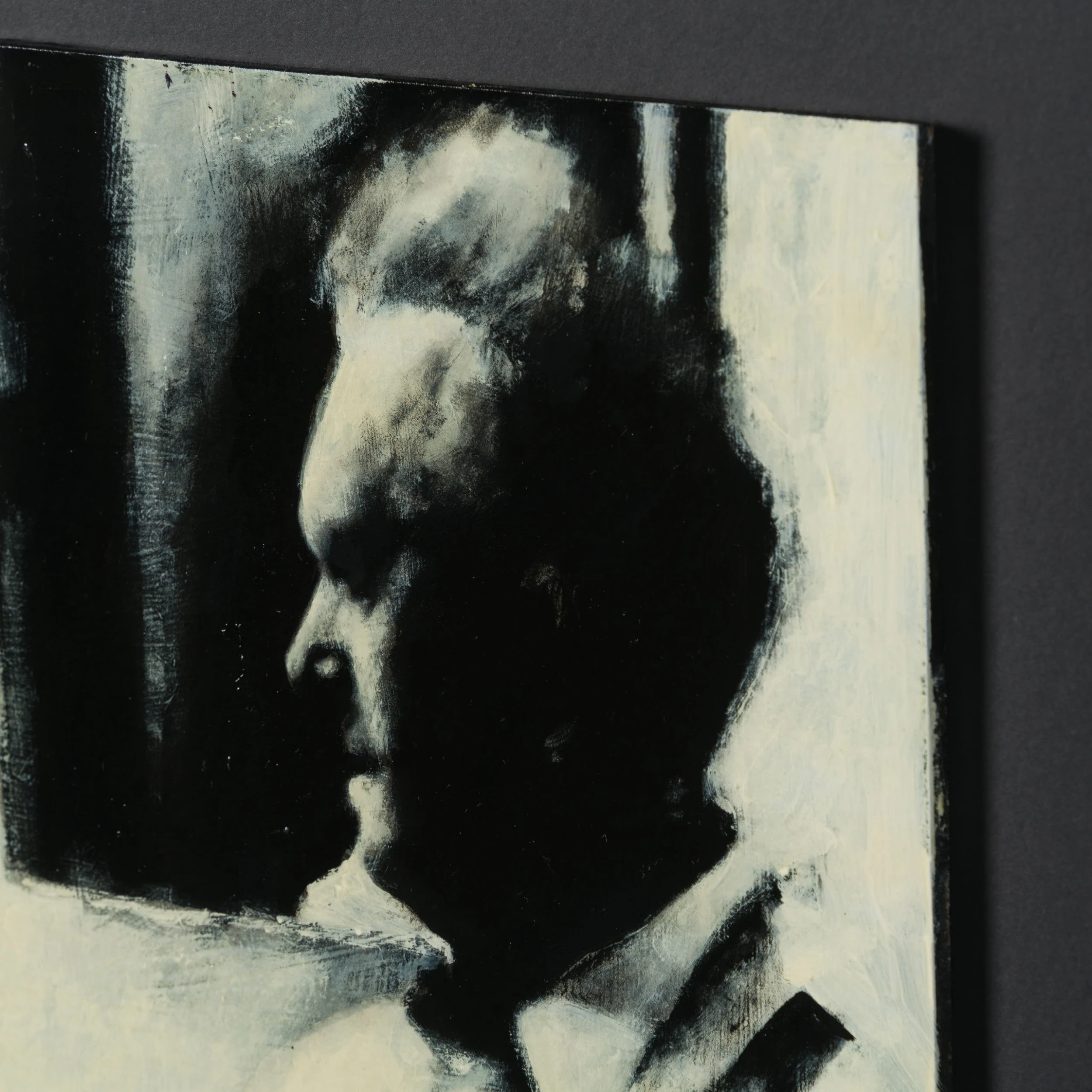All the individual portraits are from people who have interested or inspired the artist in this case Stan Laurel in his dressing room at the Birmingham Hippodrome during a music hall tour in 1953. Using conflicting tones of cream white, black and grey to create a highly atmospheric figurative artwork with an essence of realism capturing a monochrome scene. The deep swathes of black paint are skilfully blended and contrasted with white accents to create detailed and moving masterpieces.