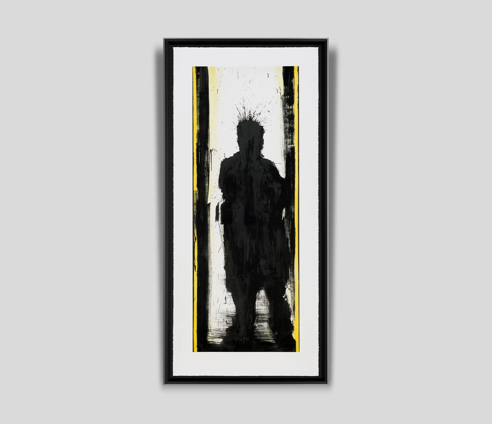 The satin black pine and spruce frame contrasts the torn-edged paper, reflecting the rawness of Hambleton’s original surfaces, which included brick walls and concrete. Sharp yellow accents add an architectural dimension to the artwork and perfectly frames the rough and expressive strokes of the figure.