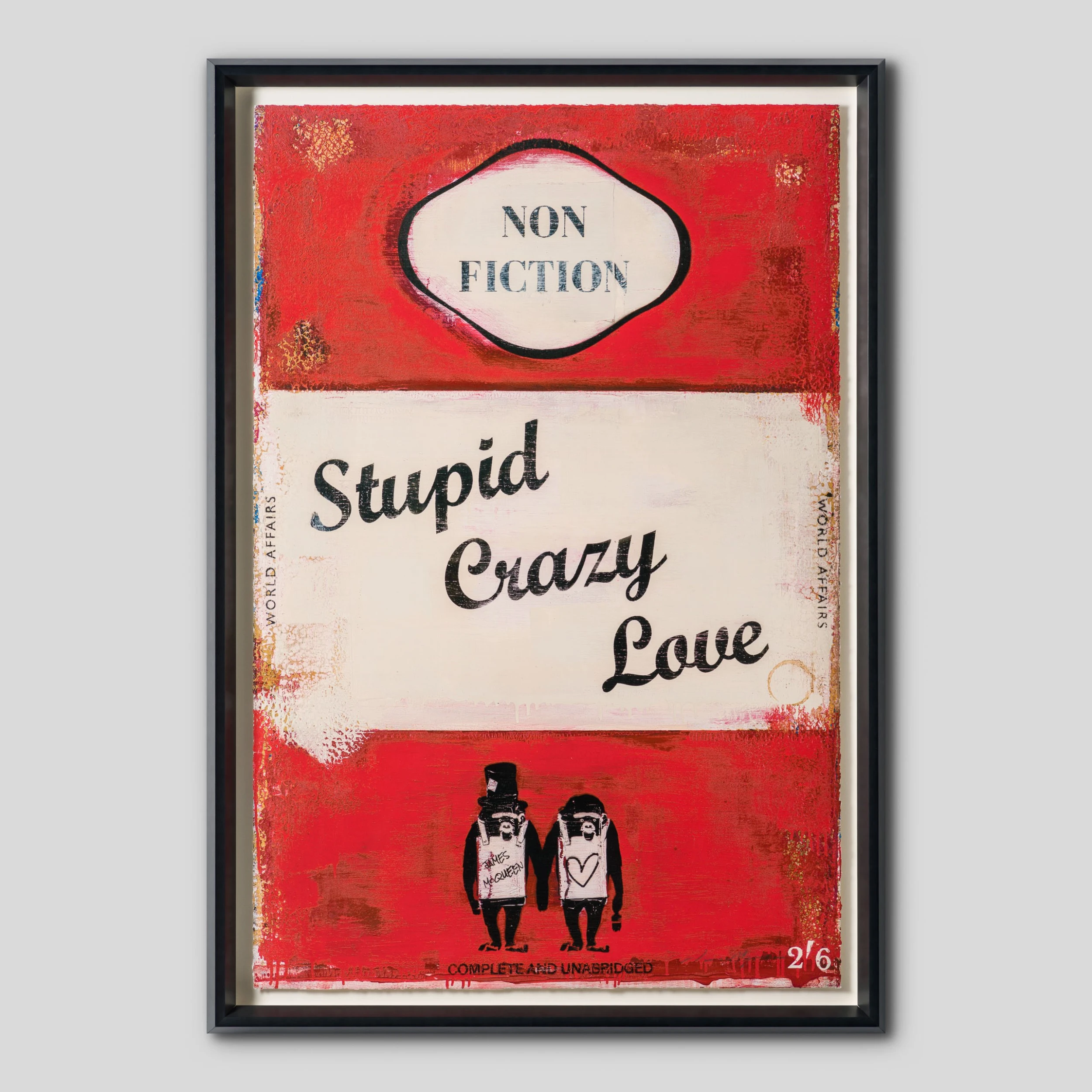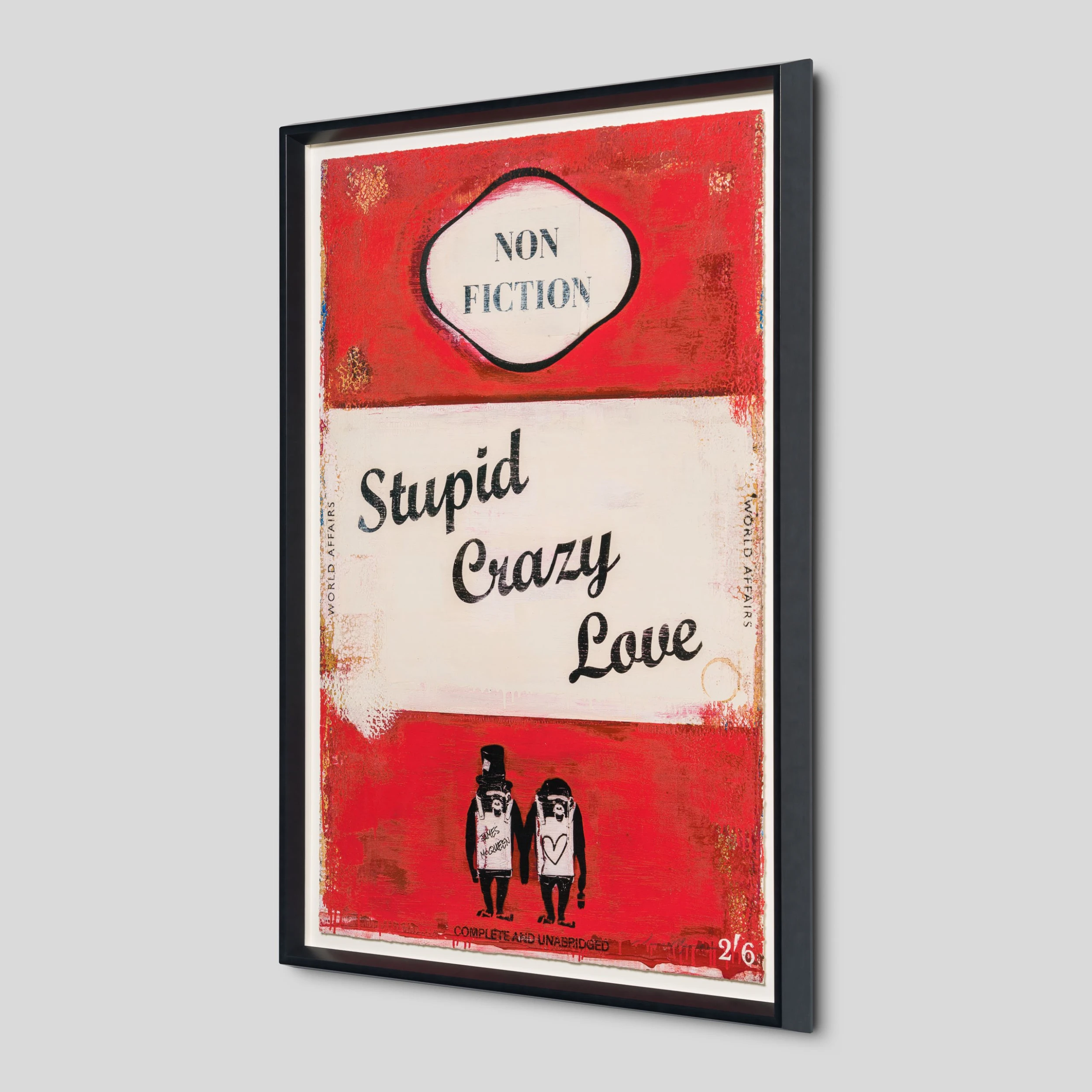 Framed and mounted in angled, charcoal pine and spruce, the bold colour palette of this artwork reflects its satirical quote; subverting the vintage aesthetic of a historical book. The elegant and poignant text thus completes this bold modern artwork also replete with contemporary art influences, from Rothko to Tracey Emin.