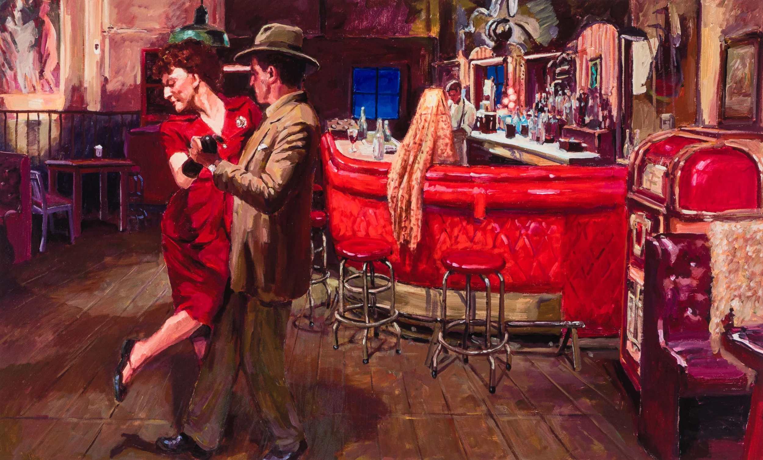 Dylan’s cinematic references result in evocative, often mysterious, compositions suspended between life and theatre, while conjuring a distinctly tangible pictorial experience. Although these new works prominently depict figures and portraits, much of the iconography that was featured in Dylan’s earlier series The Beaten Path is still recognisable – diners, motels, roadsides and city streets.