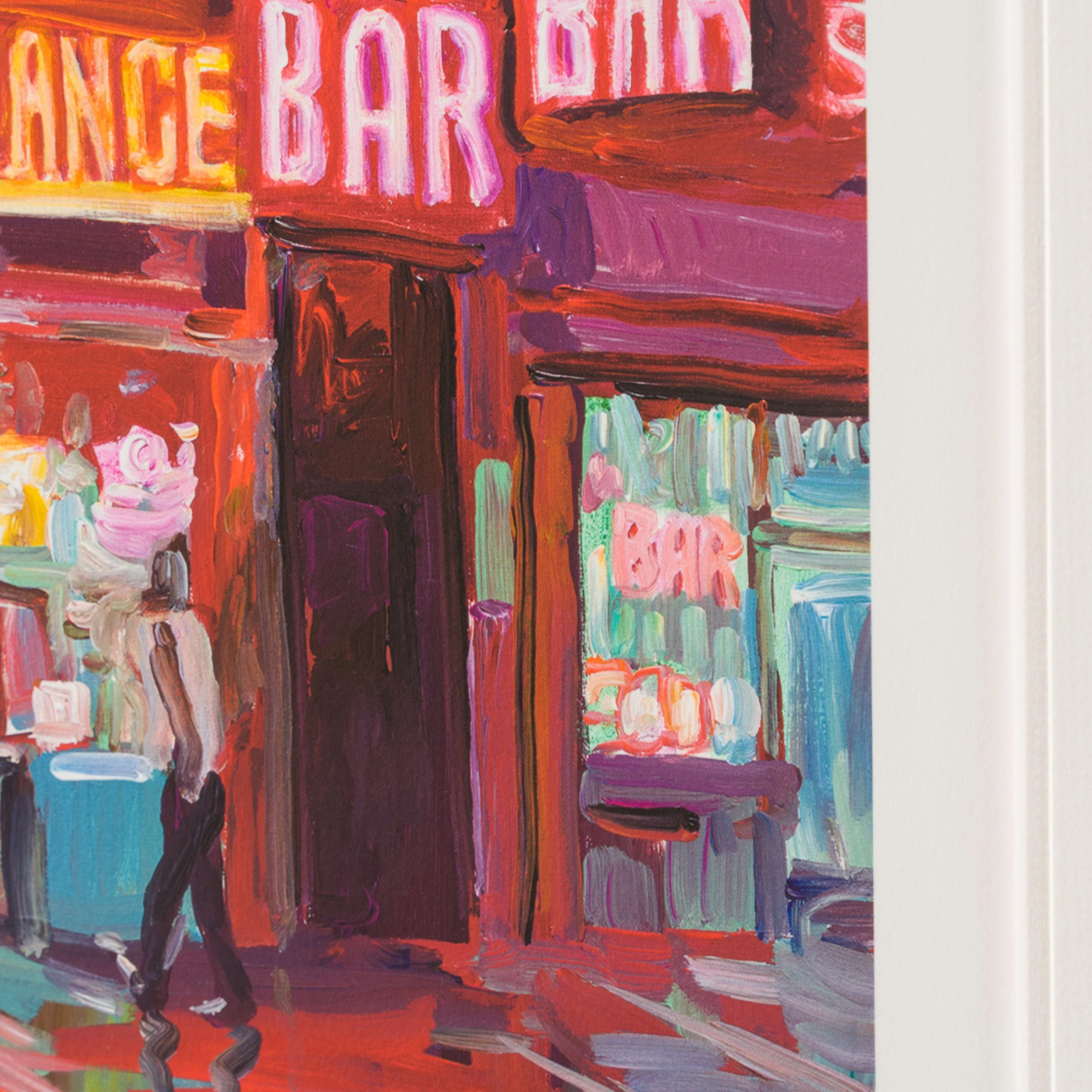Released as part of 2023 The Beaten Path collection and exclusively to Castle Fine Art, in ‘Terminal Bar’, the artist uses an electric rainy scene as a backdrop to his distinctive iconography of bars and city streets.