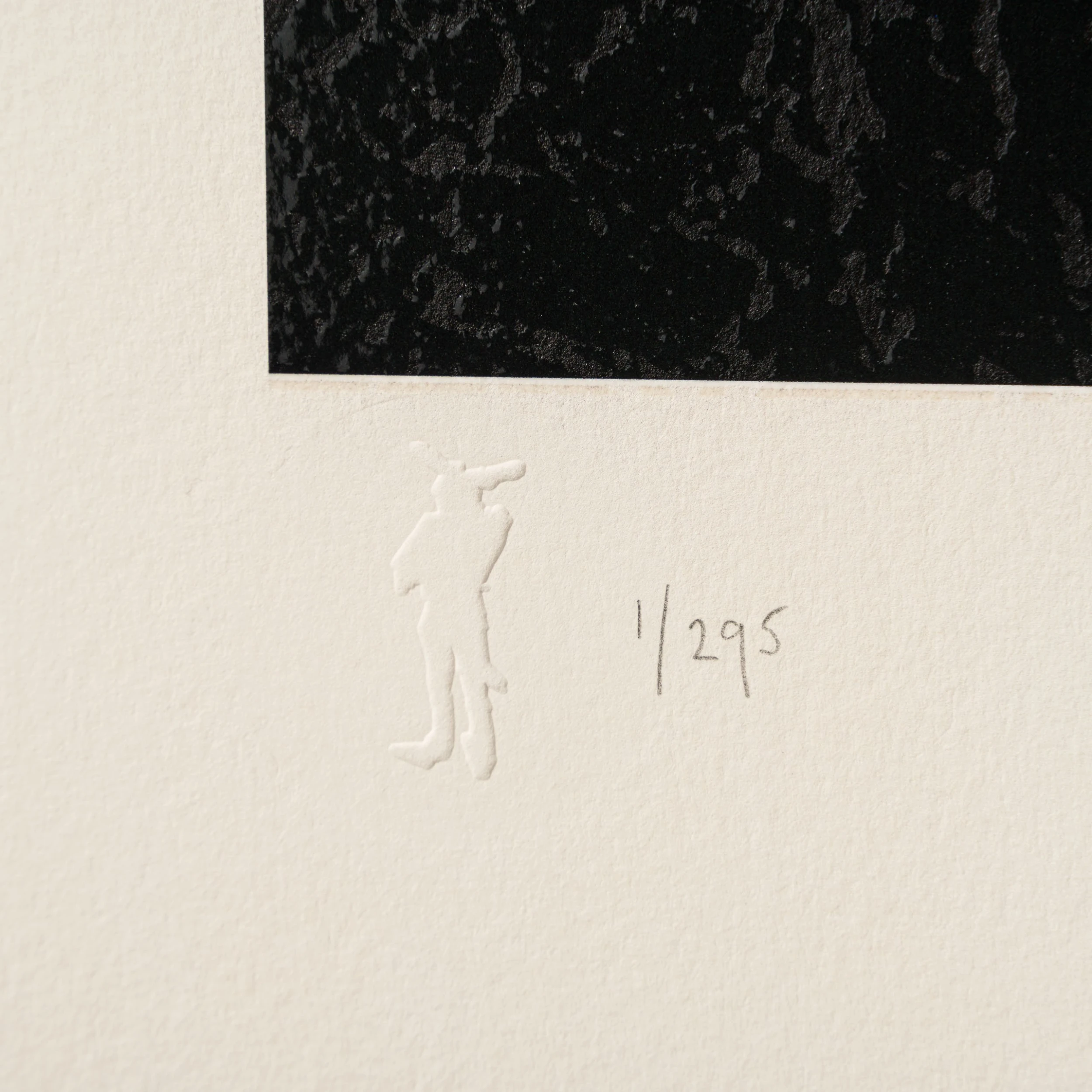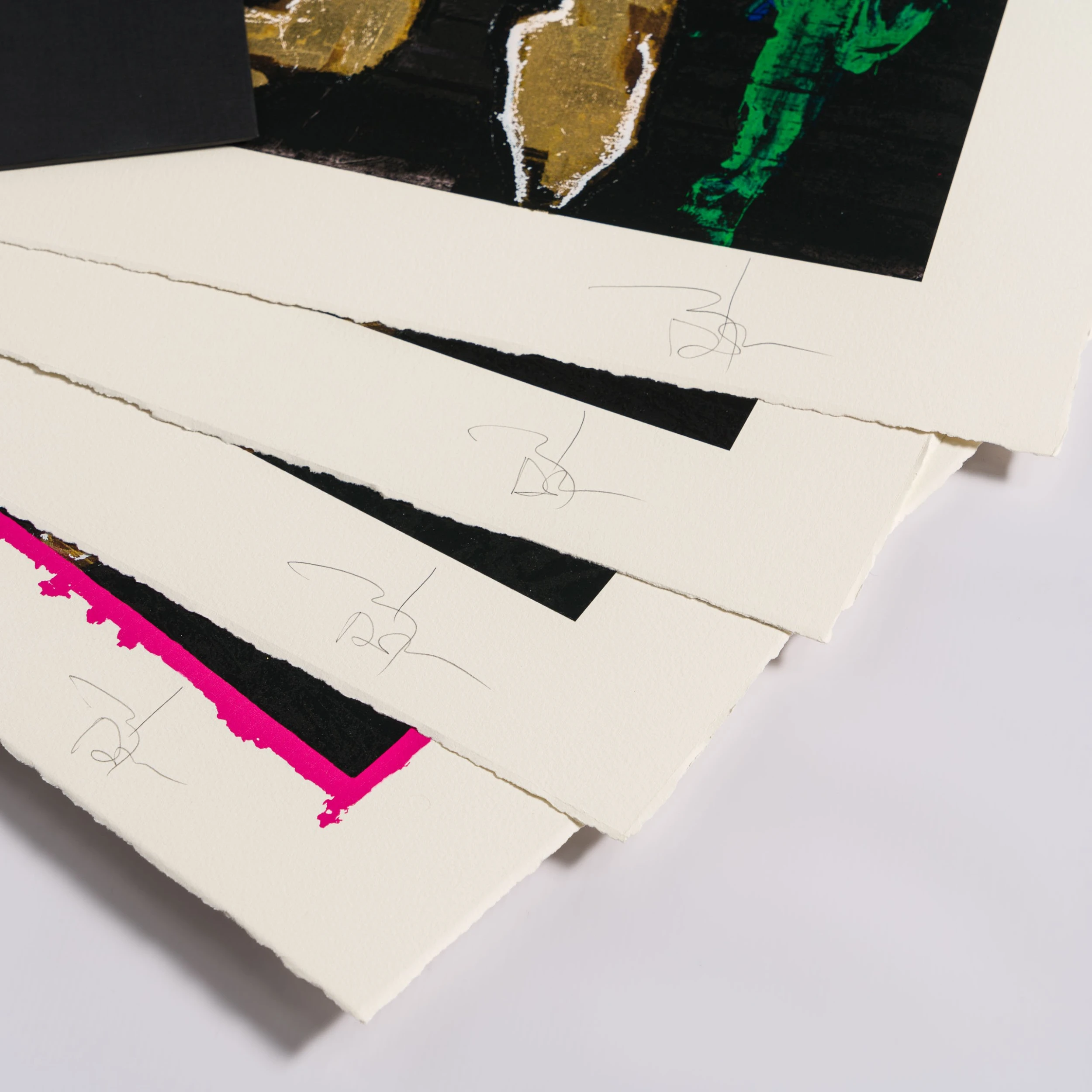 These hand-signed limited edition artworks are Silkscreen and Archival Pigment with Gold Leaf on paper. Each artwork is printed on high-quality heavyweight 640gsm Waterford NOT paper with deckle edges, hand-signed by Johnny Depp and emboss stamped by hand with Johnny’s personal mark of authenticity, The Bunnyman. Presented in a portfolio, handmade using the finest materials, hand-screened branding, and logos to the front, reverse and interior in silver and black archival pigment. The interior is covered in high-quality archival black and red paper with inserts to hold the artwork securely and help protect the paper’s deckled edges. The interleaf, which protects the face of the artwork inside the folio, is a 90gsm acid-free, PH-neutral semi-transparent paper.