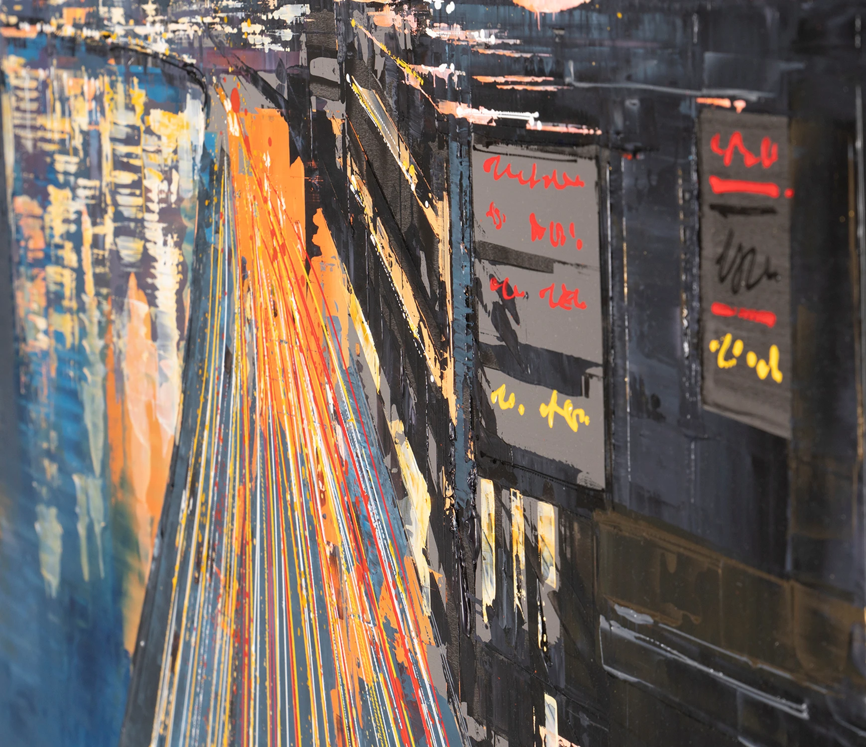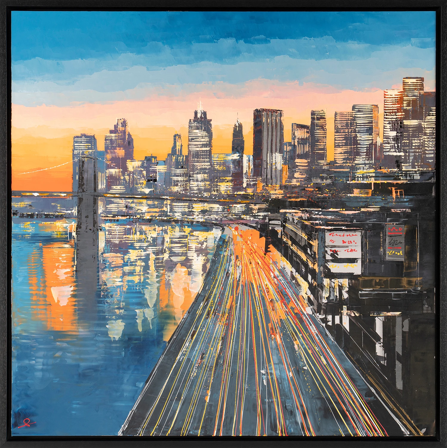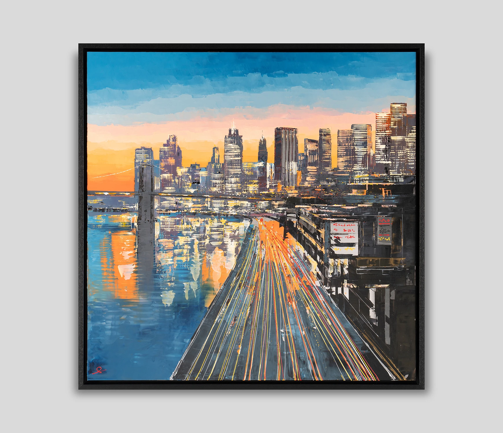 Light has always been a key medium for Paul Kenton in his breath-taking landscapes; from lily ponds and mountain peaks, to bustling Parisian scenes and American avenues. This artwork forms part of Searching Light, a collection that celebrates the artist’s extraordinary use of metal and light that bring two-dimensional artworks life. The metallic canvas of the artist’s work has a transformative effect; in different lights, the paintings take on a new life – glowing one minute and shimmering the next.