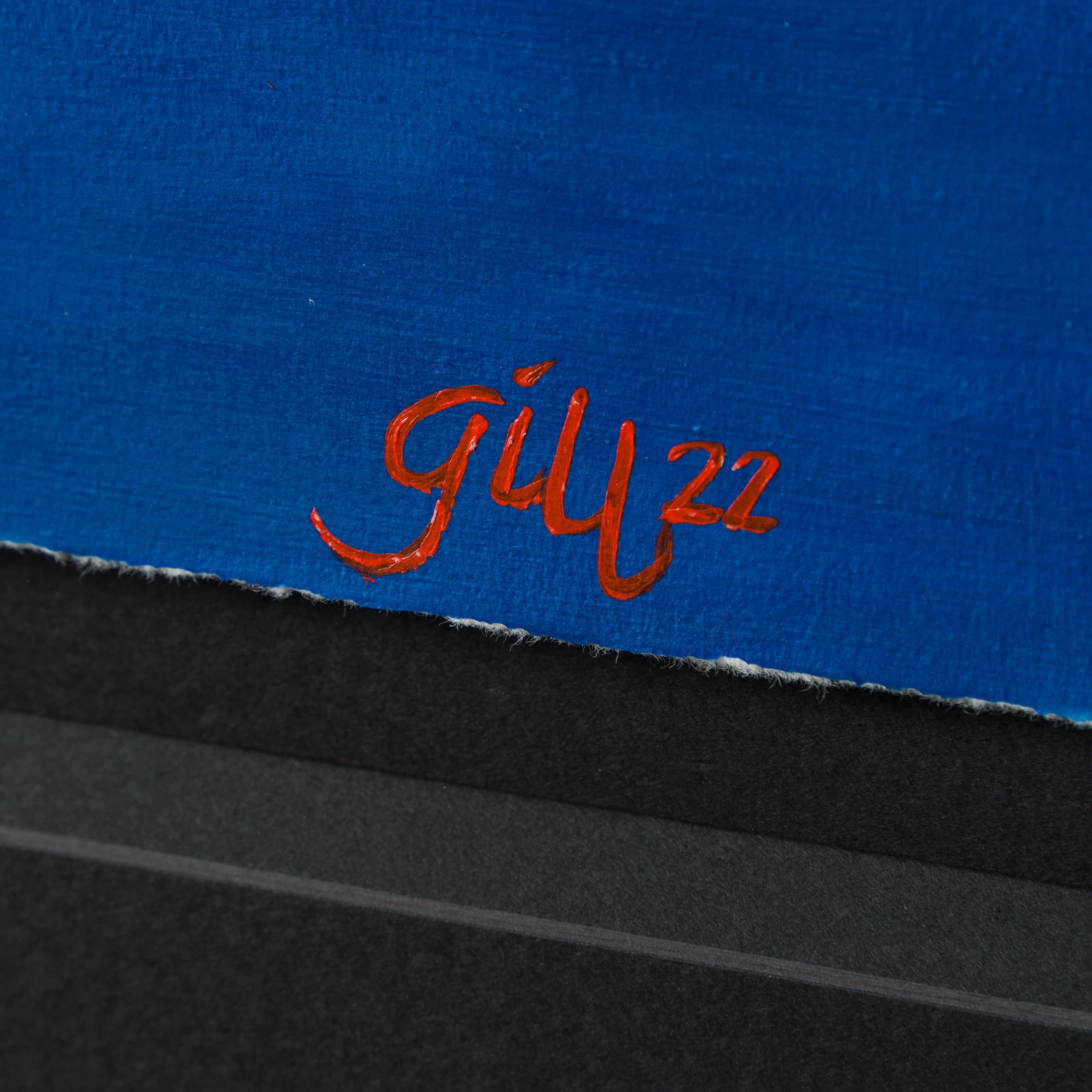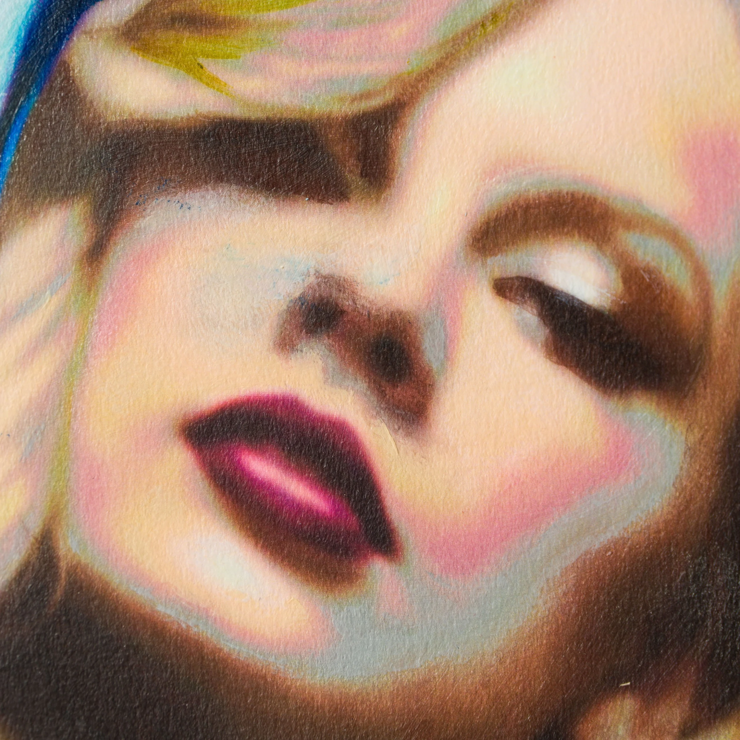 In this piece, Gill created an up-close piece that focuses predominantly on the model’s face and the car in his style of overlaying ‘montage’ imagery. The surrounding strong blue is characteristic of Gill’s pop art, highlighted by the shadows and interesting elements. The background colours are cool toned and create interesting shapes creating movement in the art. This iconic original is a statement piece!