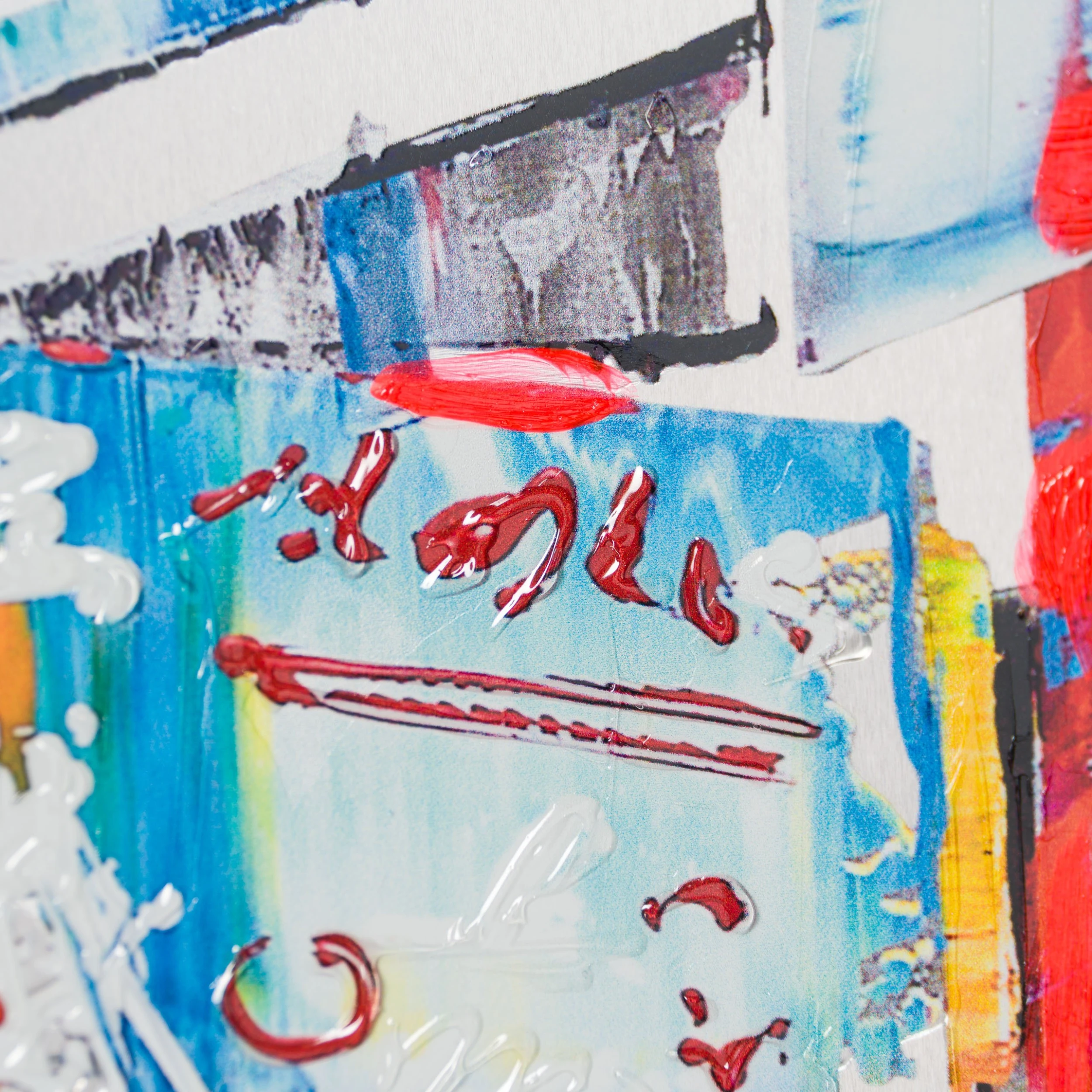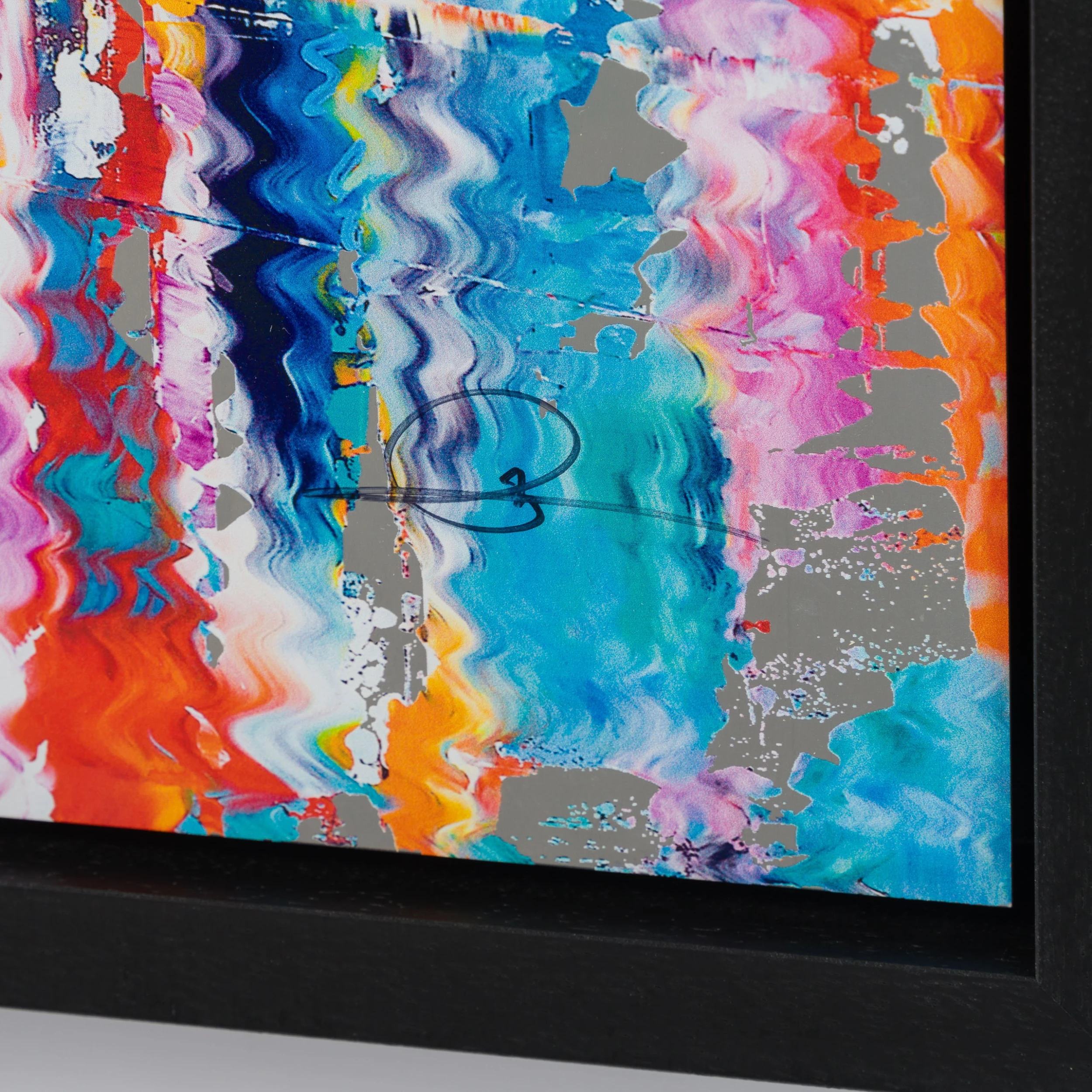 Rather than a still moment in time, the artist tries to capture a sequence of movements in his cityscapes, resulting in a hypnotising and energetic piece with a riot of fluorescent colours, sparkling lights, bold dripped lines, and a vivid colour palette. This piece is Hand Embellished Triple Strike Flatbed Print on Aluminium which best showcases the texture of the different layers of paint used.