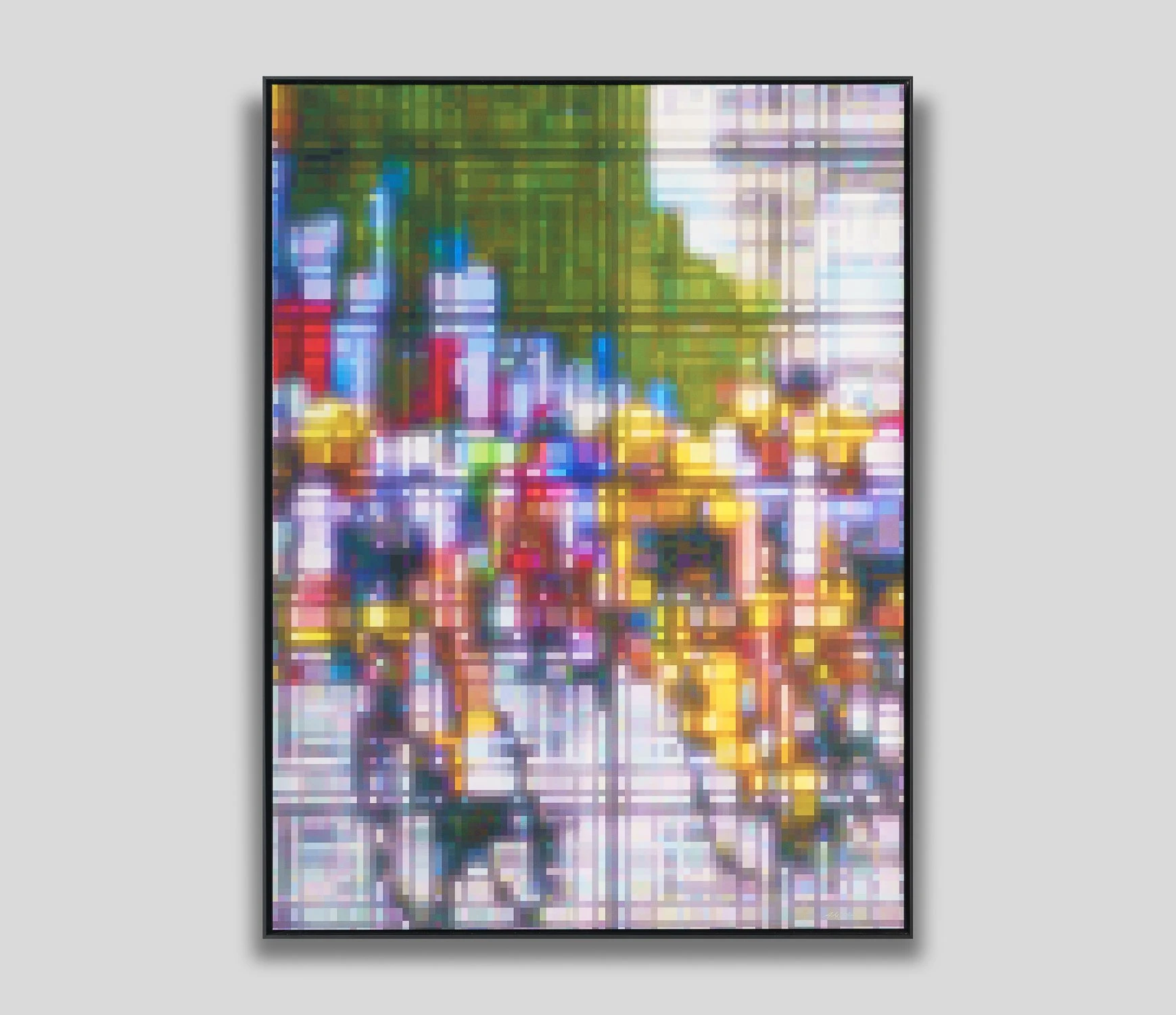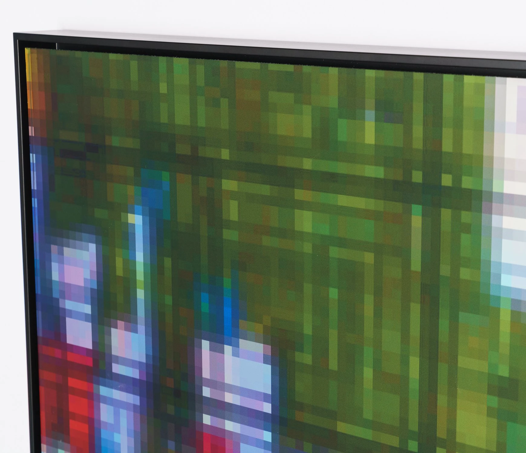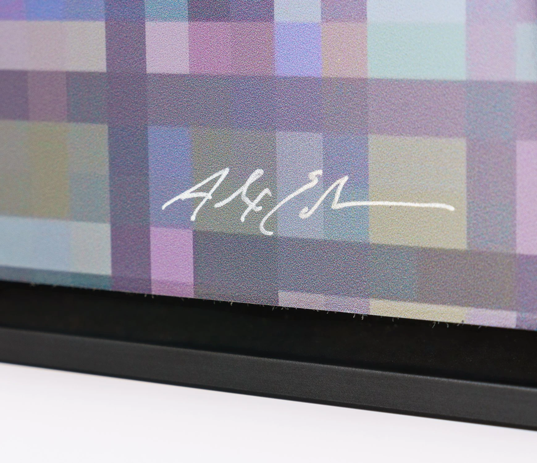 Here, Alex Echo has combined his abstract and colourful artistic approach with digital media to create this contemporary and abstract artwork. Using vibrant squares as pixels, the well-known image has been distorted but remains recognisable; commenting on the role of images in the digital age.