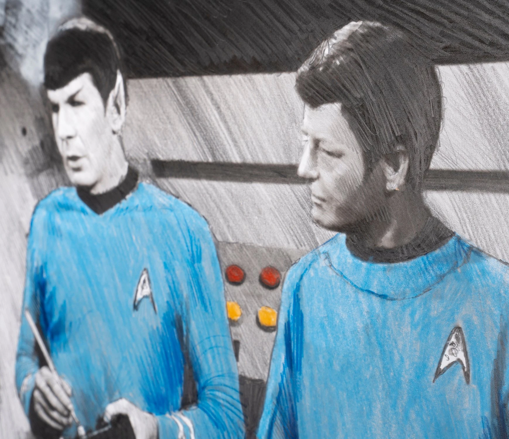 With bright pops of blue and yellow accentuating the different tones of delicate graphite, this otherworldly original drawing by Robert Bailey perfectly captures the iconic characters and retro quality of Star Trek: The Original Series.