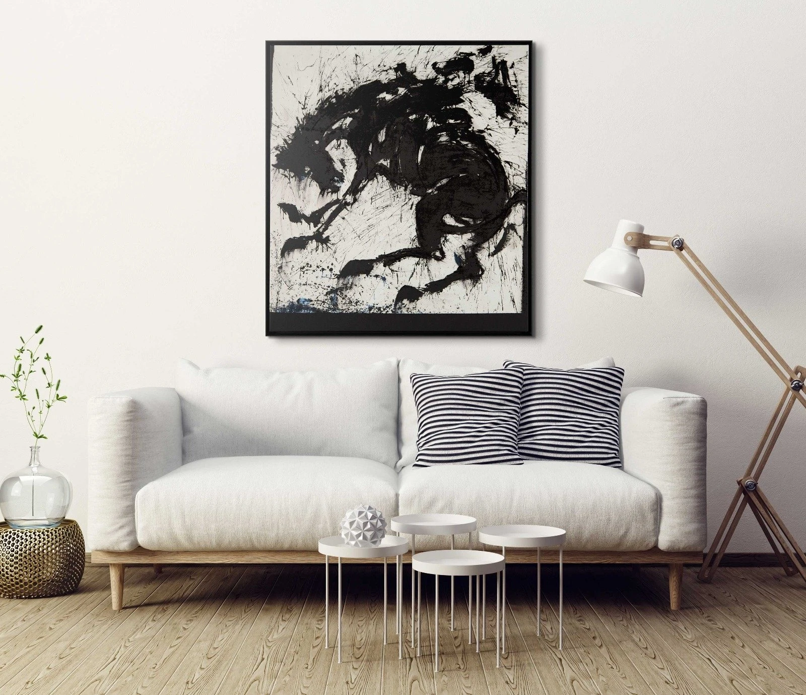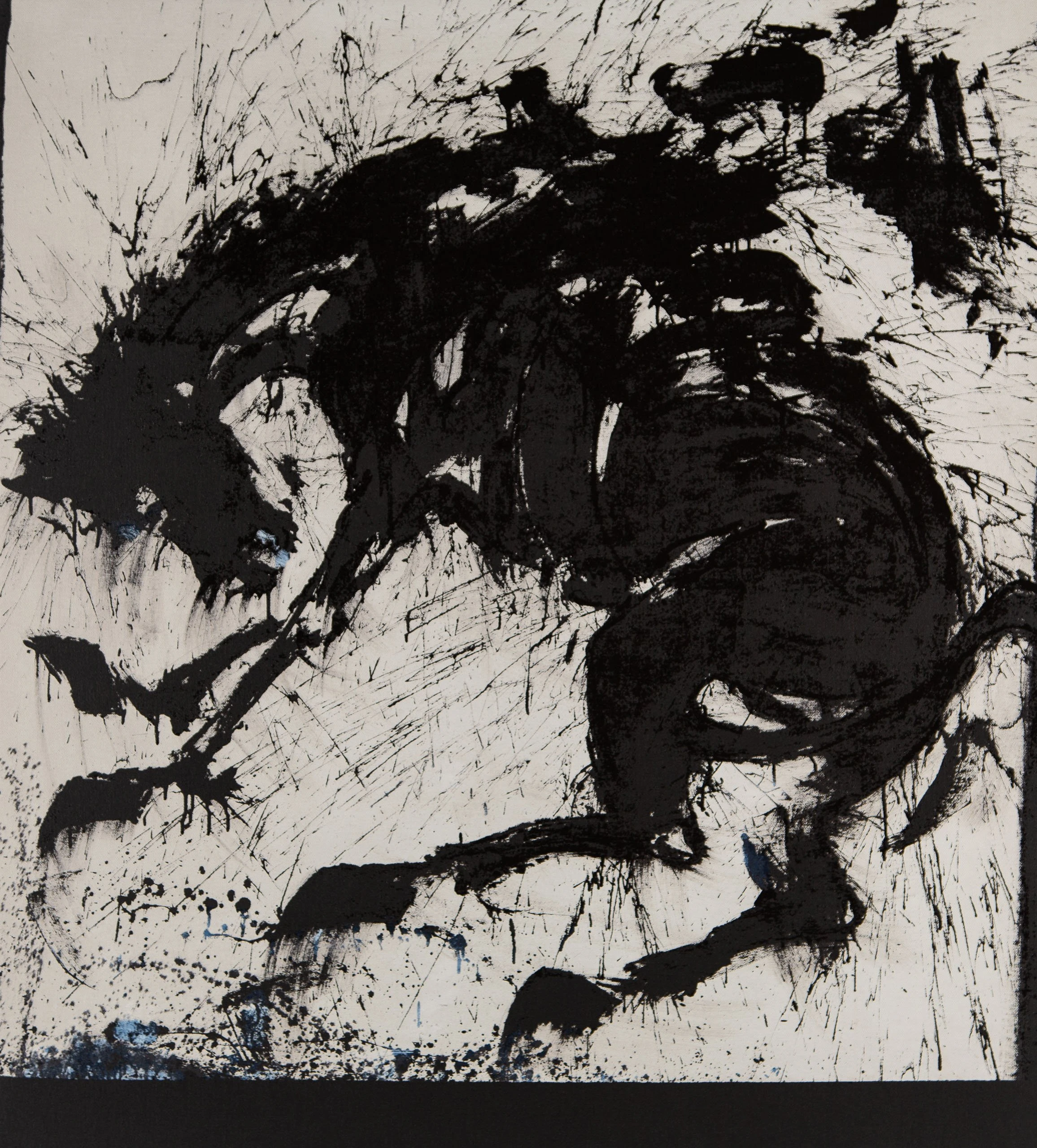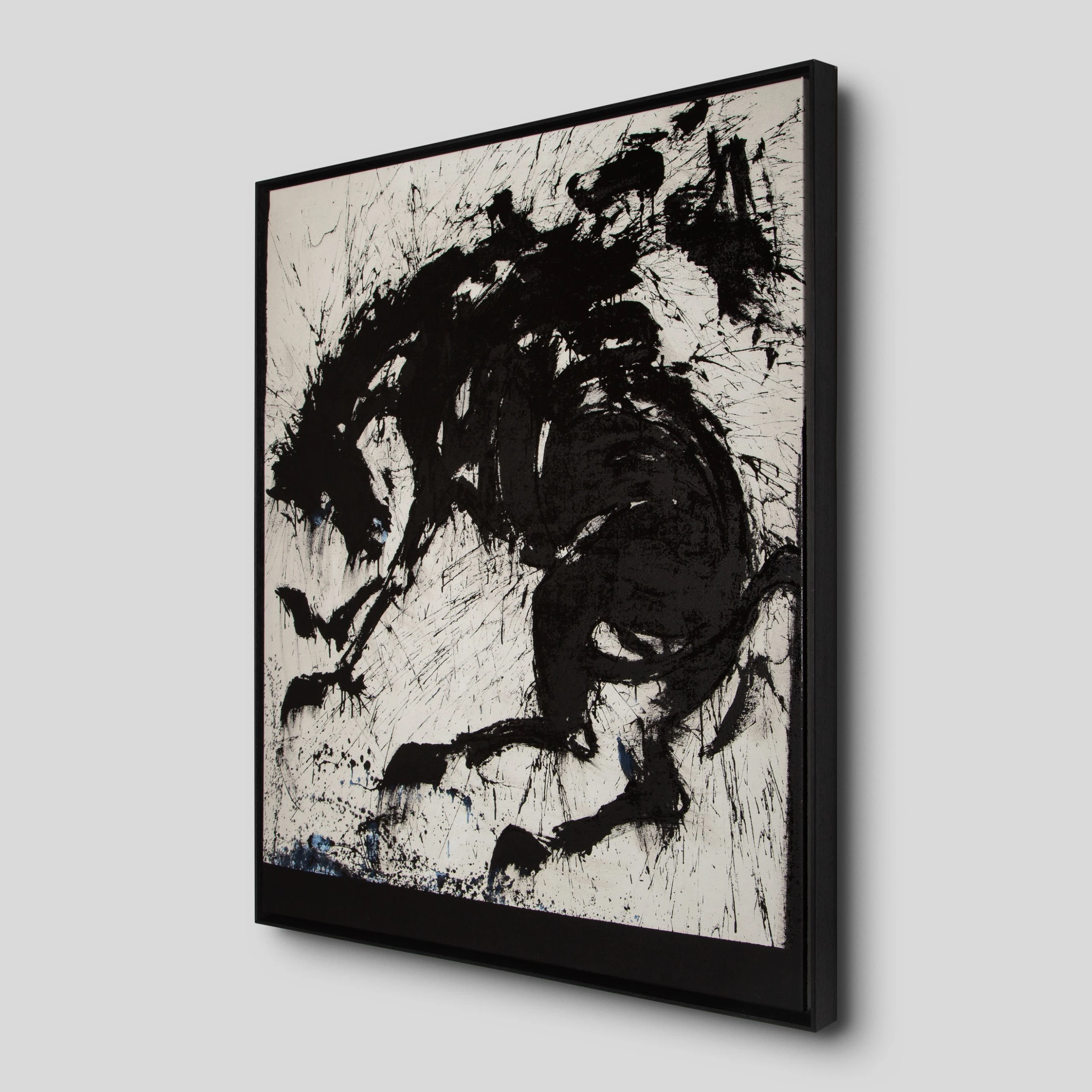 An image of intense movement and fury, Richard Hambleton’s painting ‘Tribeca Rider’ was painted shortly before his withdrawal from the limelight of the art world. The world-famous artist, whose immense dedication to his art saw him live between the highest circles of the art world and depths of poverty, exchanged this artwork for food in the restaurant in Tribeca where he ate daily. Thrown between these two extremes, the artist’s turbulent life and state of mind can also be seen in the highly emotional painting of the Tribeca rider; grappling with the violence of his horse, barely visible through the gestures of frenetic movement.