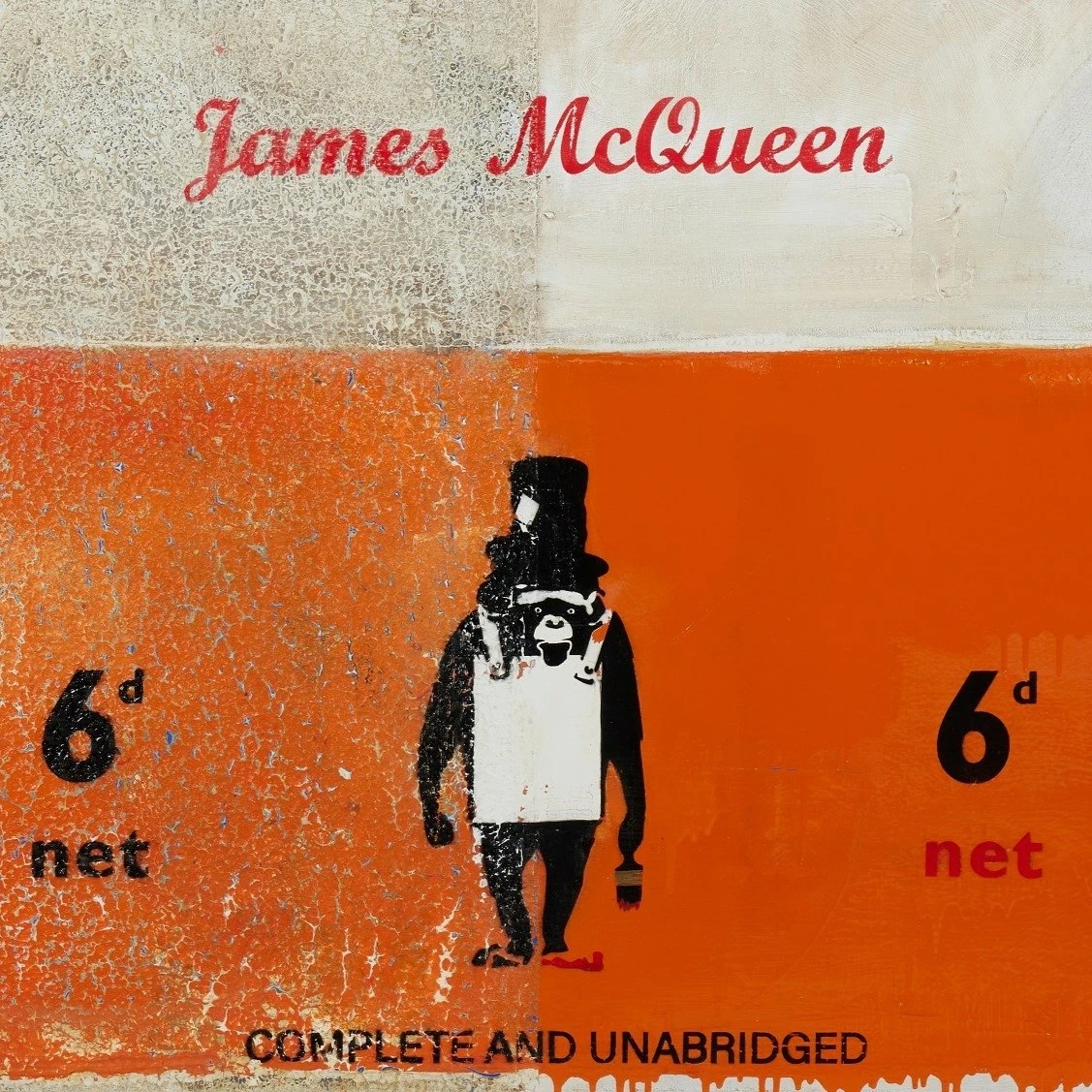 James McQueenโs complex application of paint elevates his art beyond the mere imitation of a nostalgic object towards an art that is rich and expressive, exploring themes of Pop art and abstraction. Working under a pseudonym, he introduces an autobiographical dimension to the work with his trademark monkey, using this mischievous character as a kind of personal insignia.