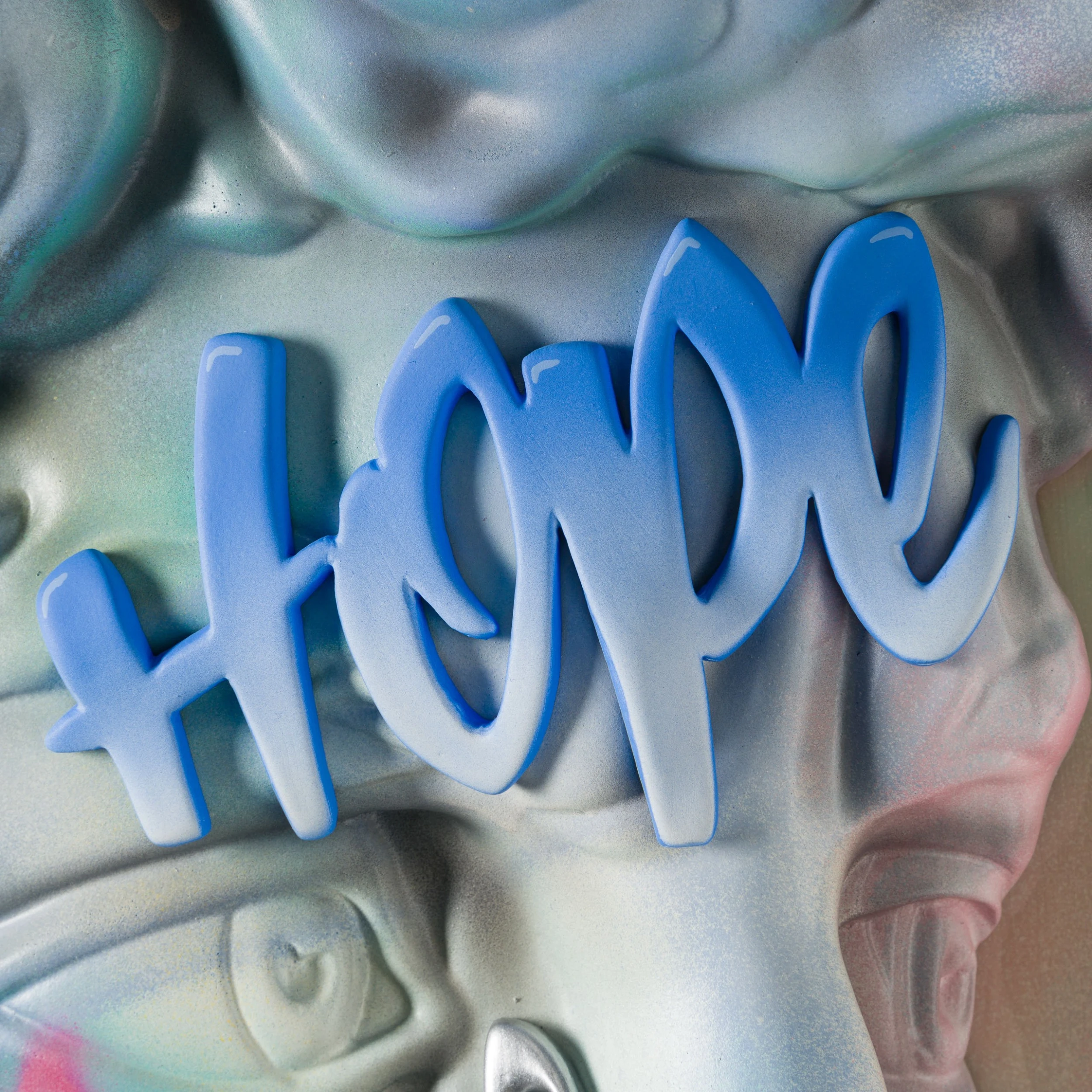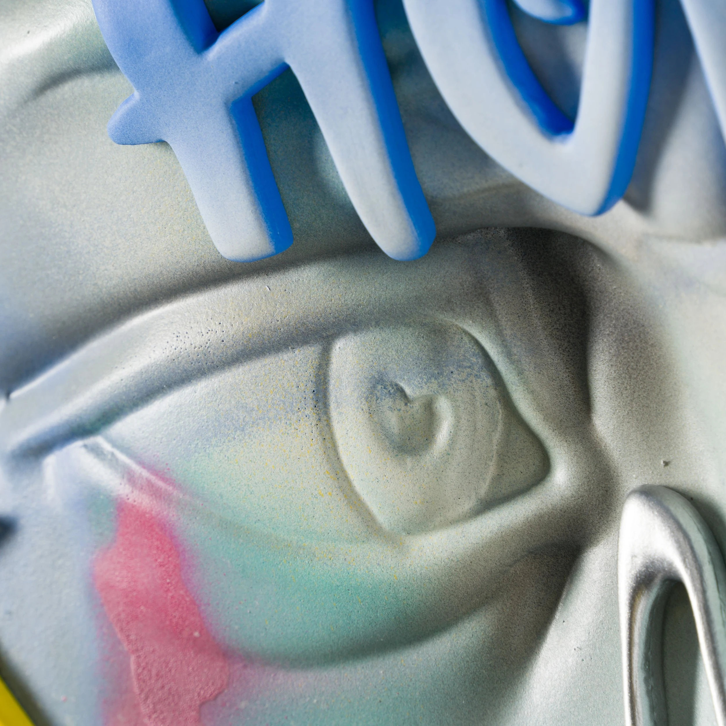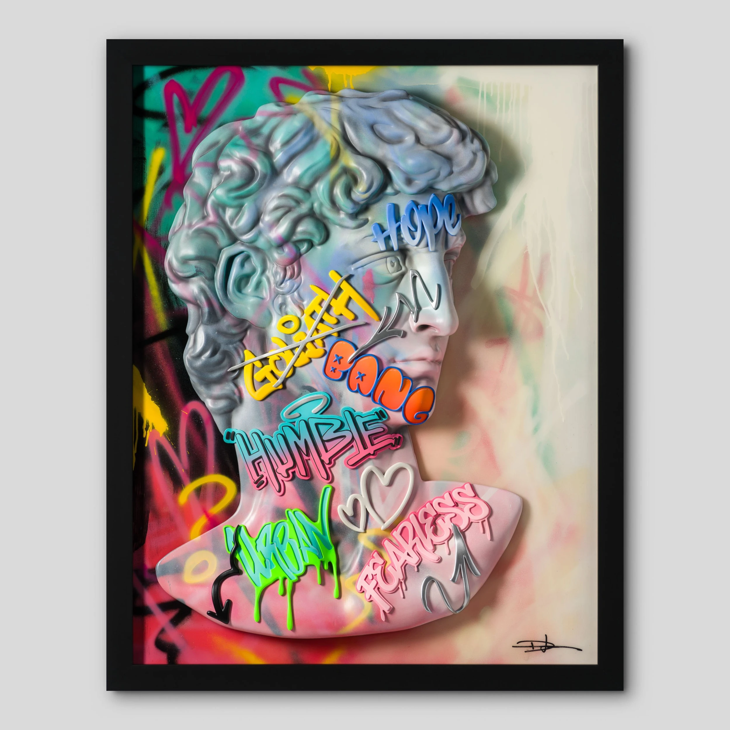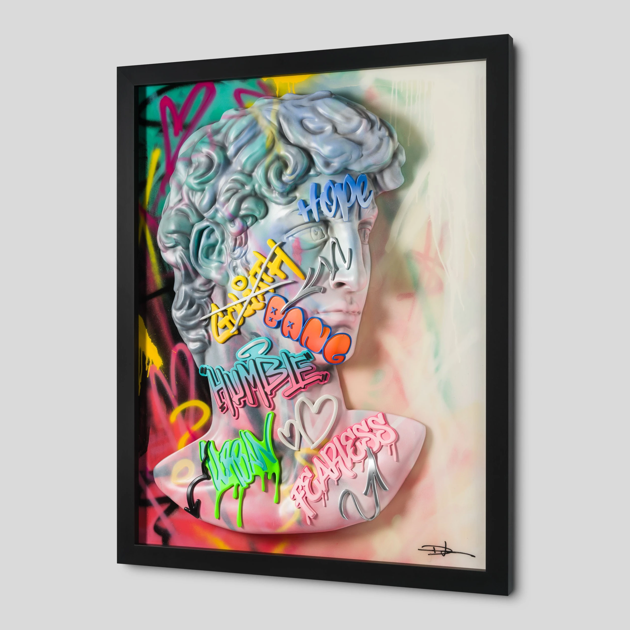 In this bold and luxurious original, Dan Lane revisits some of his beloved themes from his earlier work. In “Underestimated ”, the artist fuses his classical baroque sculpture style and the drama they convey with his own style and its iconic elements. Whilst the graffiti is bold and dramatic, the title evokes an element of humbleness and simplicity.
